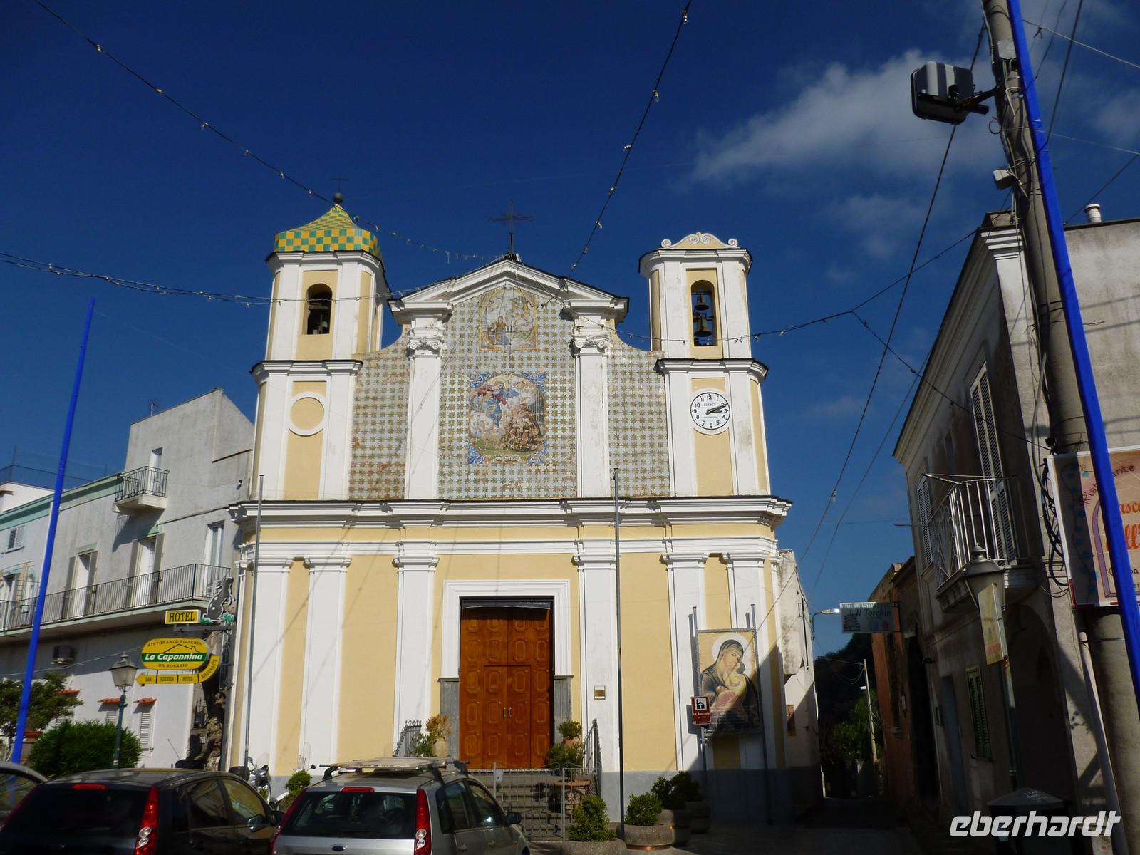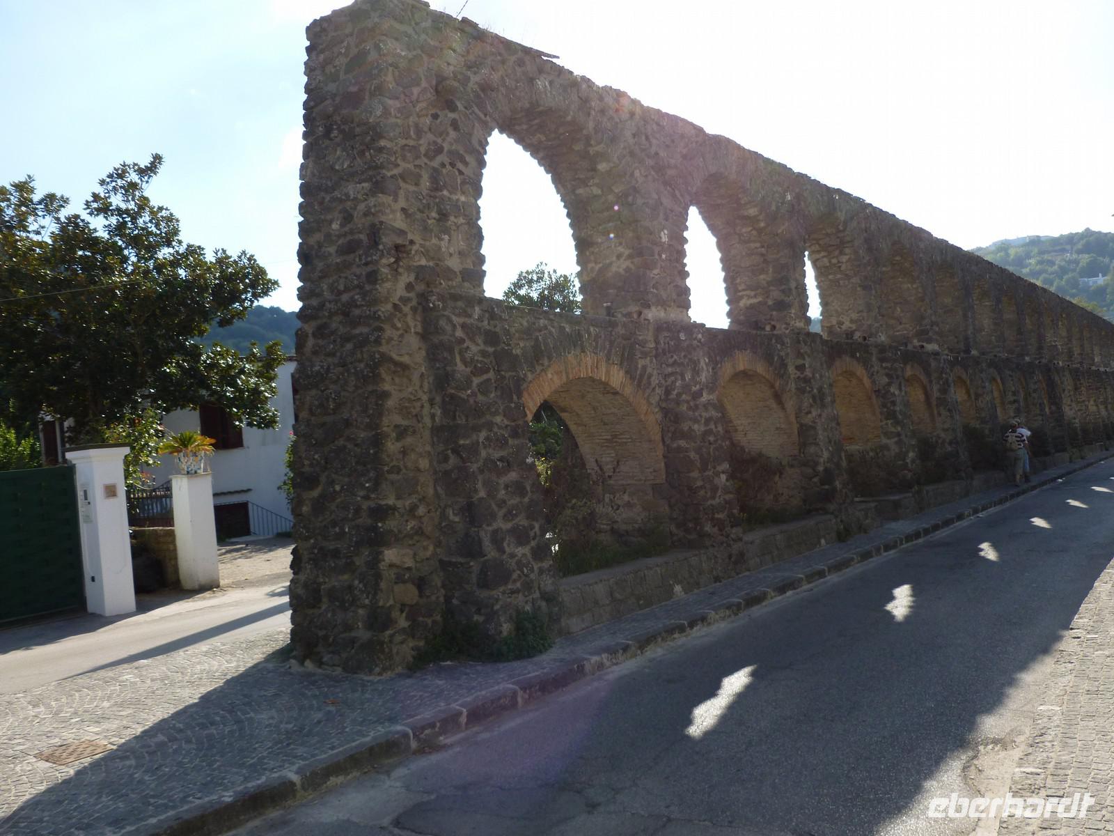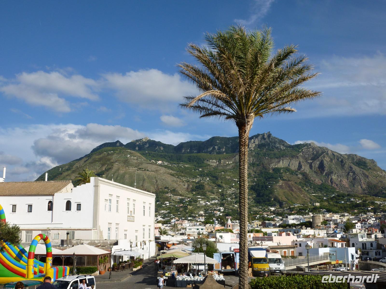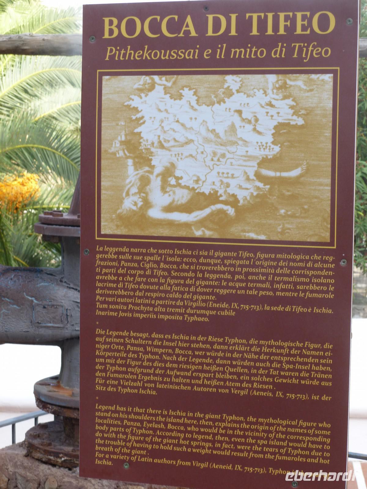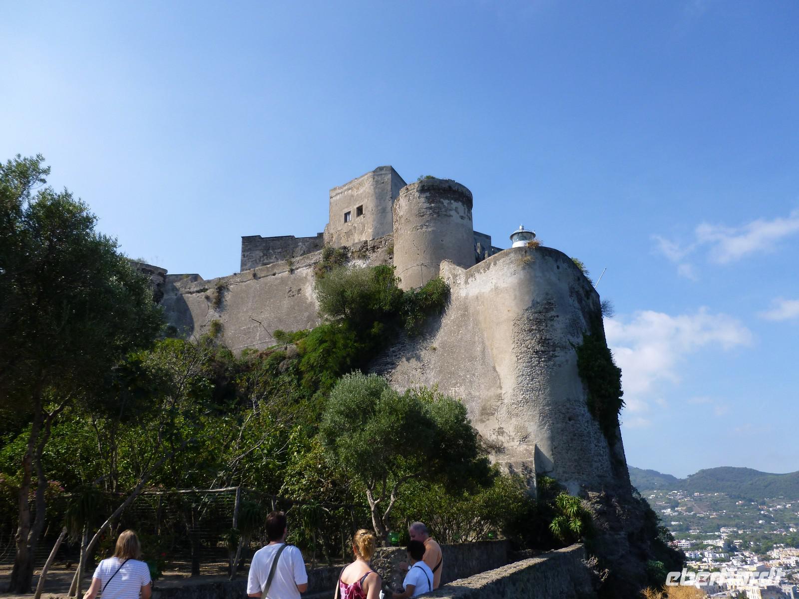 Nach einem ausgiebigen Frühstück holte uns Alberto am Hotel zur Inselrundfahrt ab. Mit dem Bus fuhren wir im Uhrzeigersinn einmal rund um die Insel: Von Forio ging es Richtung Norden nach Lacco Ameno, wo wir einen Fotostopp am Il Fungo, dem Felsmassiv in Form eines Pilzes einlegten. Danach ging es östlich nach Casamicciola Terme und Ischia Porto. Dann erblickten wir schon das Wahrzeichen Ischias, das Castello Aragonese. Nun ging es südlich weiter, an den Pilastri, dem Äquadukt, vorbei nach Barano und durch Buonopane. Hier sahen wir auch schon den Weg zur Nitrodiquelle. Auf dem Weg nach Westen mussten wir durch die Berge mit steilen und engen Kurven. In Fontana, Ischias höchstgelegenem Ort, gab es eine kleine Kaffee- oder besser Cappuccino-Pause und eine Kostprobe vom Limoncello, dem Likör aus Zitronenschalen. Weiter ging es über Serrara nach Sant Angelo. Es wurde hier gerade das Fest des Heiligen Michael mit Prozession und Feuerwerk gefeiert, als ein Gewitter niederging.