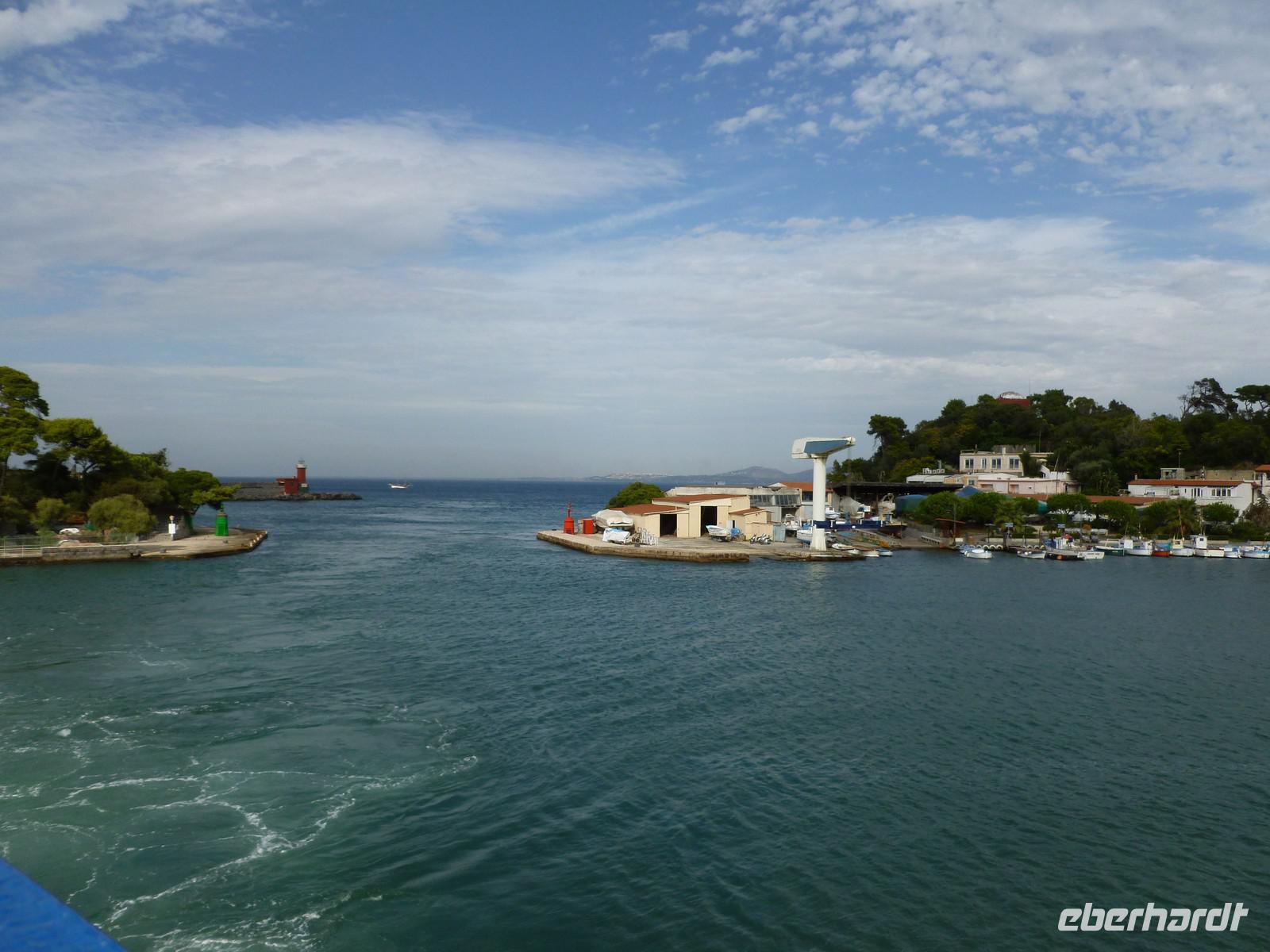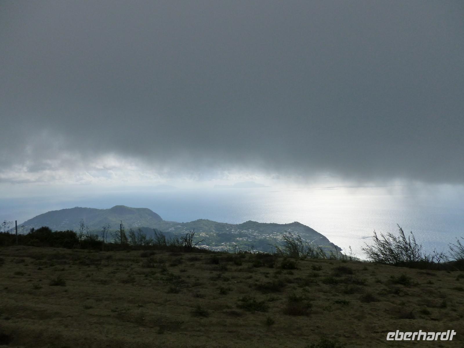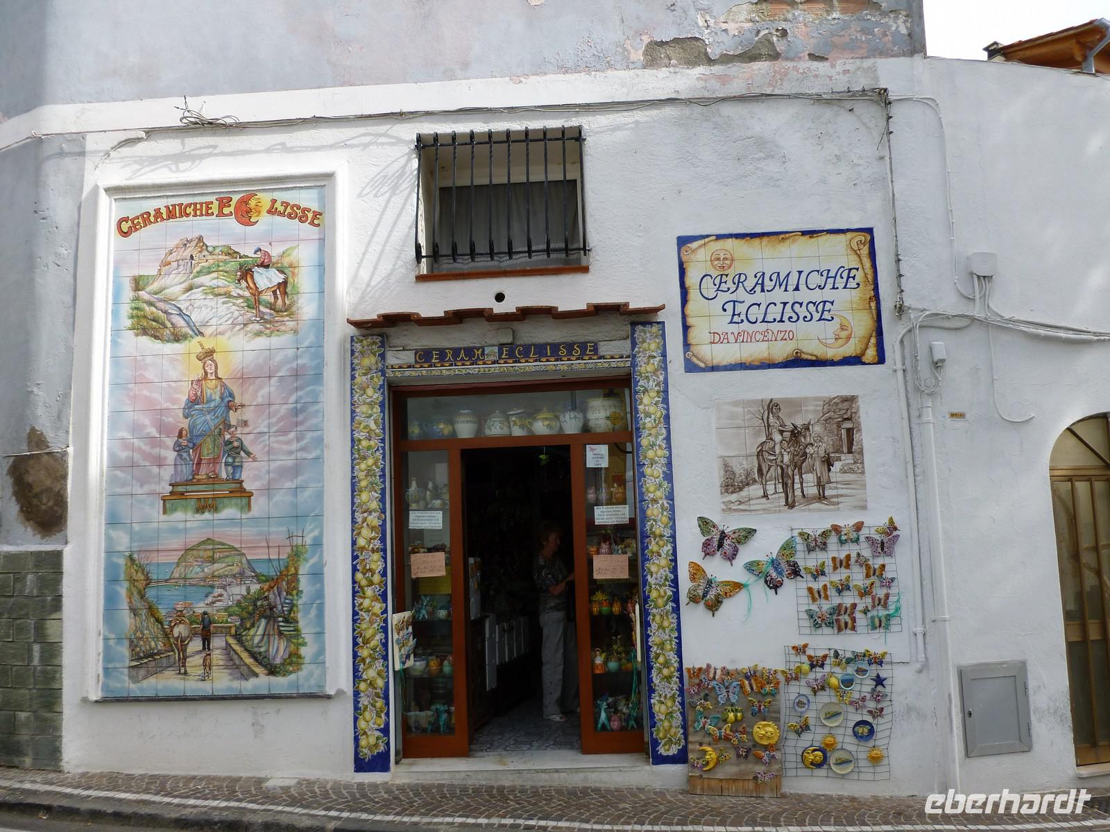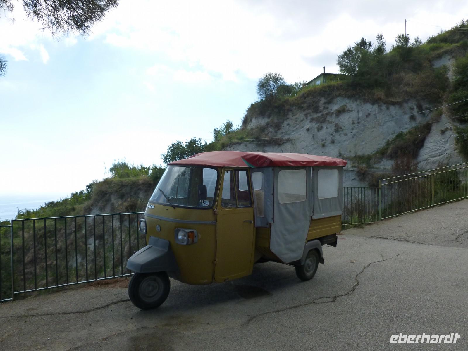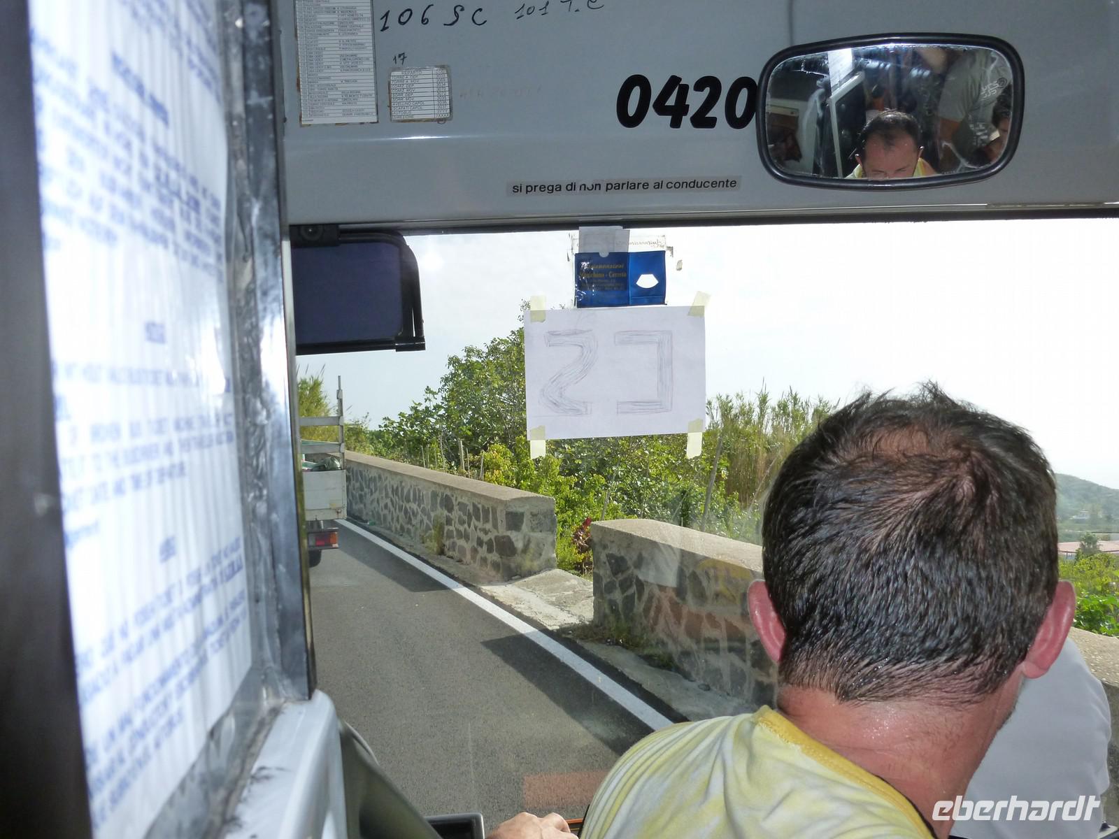 Nach einem ausgiebigen Frühstück holte uns Alberto am Hotel zur Inselrundfahrt ab. Mit dem Bus fuhren wir im Uhrzeigersinn einmal rund um die Insel: Von Forio ging es Richtung Norden nach Lacco Ameno, wo wir einen Fotostopp am Il Fungo, dem Felsmassiv in Form eines Pilzes einlegten. Danach ging es östlich nach Casamicciola Terme und Ischia Porto. Dann erblickten wir schon das Wahrzeichen Ischias, das Castello Aragonese. Nun ging es südlich weiter, an den Pilastri, dem Äquadukt, vorbei nach Barano und durch Buonopane. Hier sahen wir auch schon den Weg zur Nitrodiquelle. Auf dem Weg nach Westen mussten wir durch die Berge mit steilen und engen Kurven. In Fontana, Ischias höchstgelegenem Ort, gab es eine kleine Kaffee- oder besser Cappuccino-Pause und eine Kostprobe vom Limoncello, dem Likör aus Zitronenschalen. Weiter ging es über Serrara nach Sant Angelo. Es wurde hier gerade das Fest des Heiligen Michael mit Prozession und Feuerwerk gefeiert, als ein Gewitter niederging.