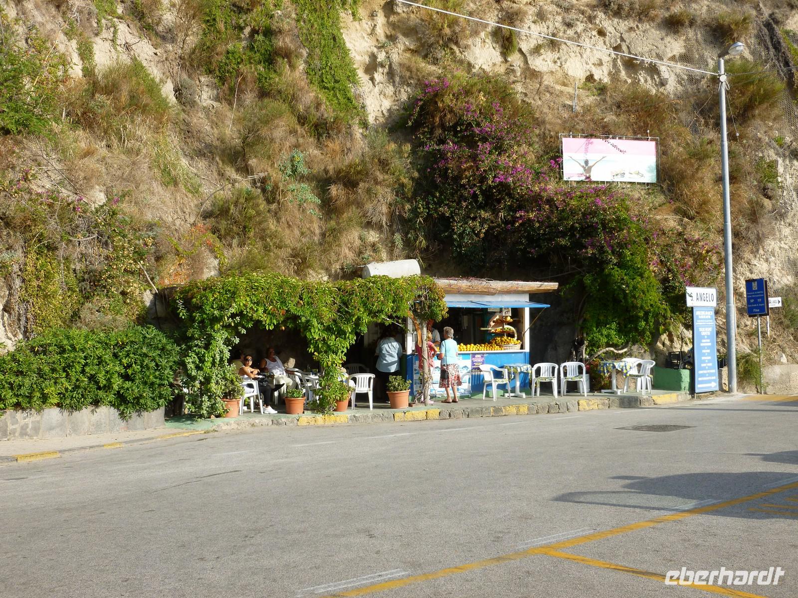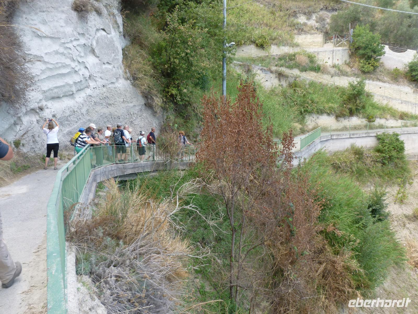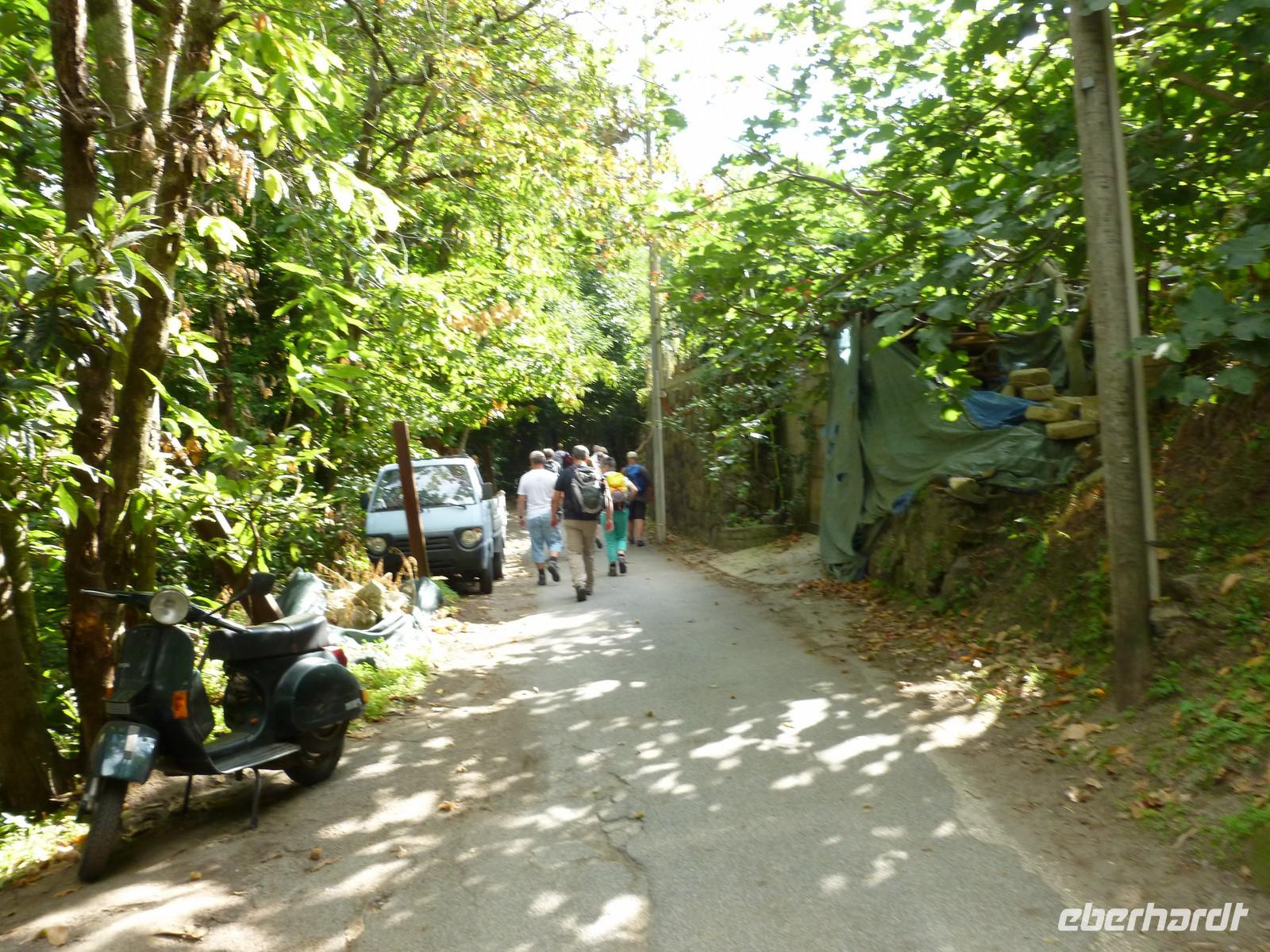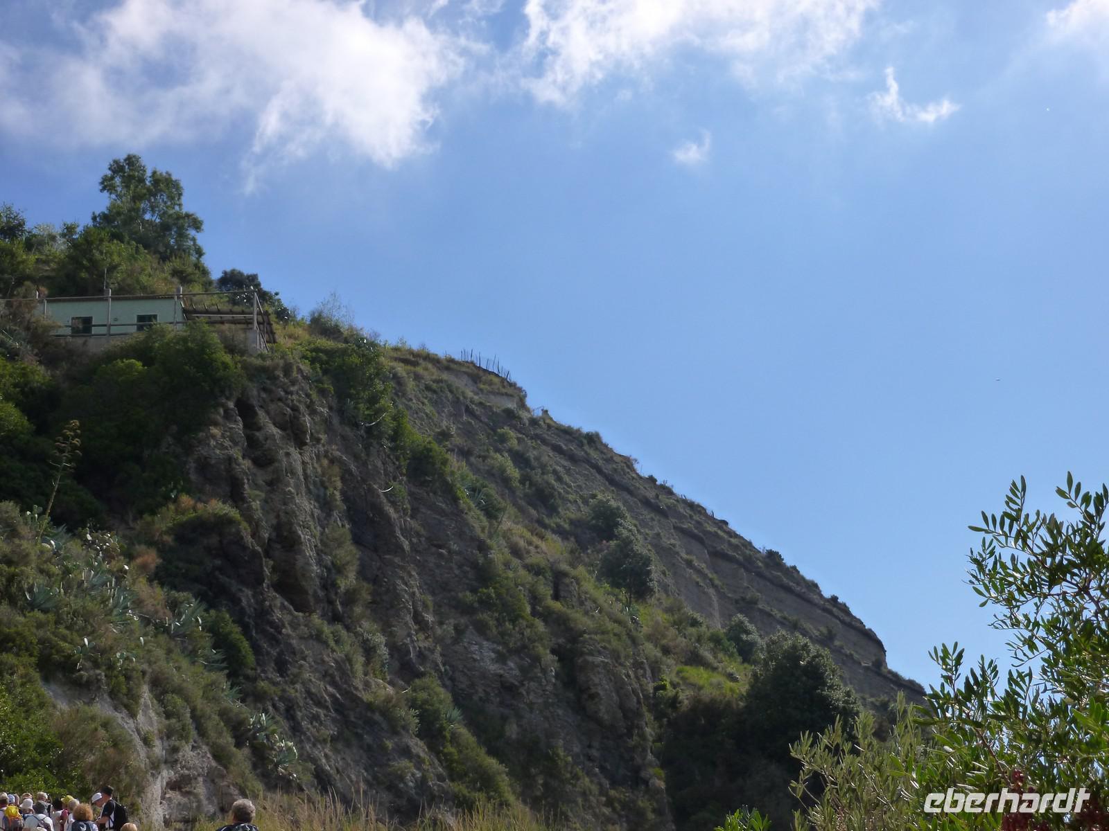 Der Regen ließ auf dem Weg zur Mittagsrast nach. Im Restaurant „Belvedere" wurden wir vom Chef persönlich herzlich begrüßt, wir genossen die Sonnenterrasse und den Thermalpool, denn nun war es warm und sonnig. Es erwartete uns ein tolles Essen: Bruschetta, Salat, Spagetti, am Morgen gefangener Lampuka und Limoncello-Torte sowie köstlicher Tischwein. So schön wie es dort war, mussten wir dennoch weiter. Mit dem Linienbus fuhren wir nach Serrara und stiegen am Belvedere aus. Die Aussicht nach Sant Angelo war sehr diesig. Über wiederum viele Stufen stiegen wir in das charmante Fischerdorf bergab und hatten einen wunderschönen Blick über den Maronti-Strand. Unten führte uns Livio auch zu diesem und zeigte uns die Fumarole am Strand. Wir staunten über die Kuranwendung „Heißer Sand am Strand", aber von uns wollte sich gerade niemand einbuddeln lassen. Von Sant Angelo fuhren wir mehr oder weniger individuell mit dem Linienbus CD oder Linie 1 Richtung Forio zurück. Dann wäre es ein eigentlich nur ein kurzer Fußweg zum Hotel, es sei denn, man möchte eine Abkürzung nehmen, die plötzlich nicht mehr da ist.