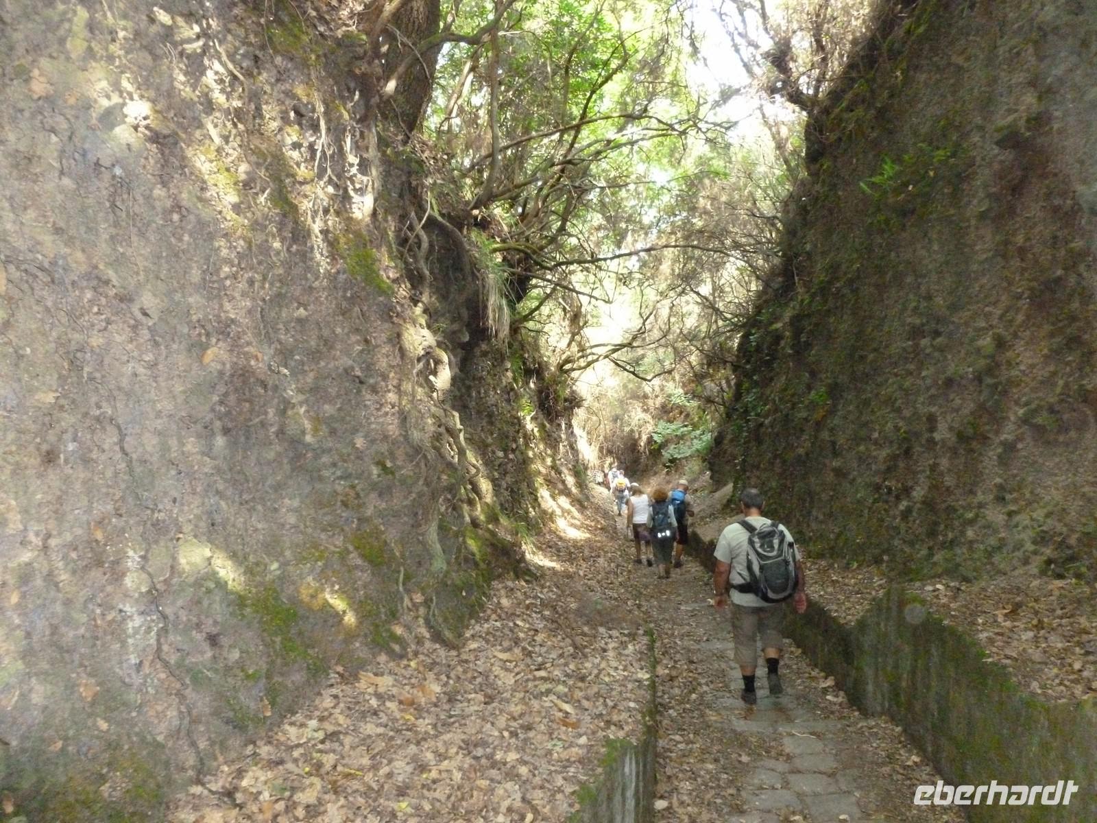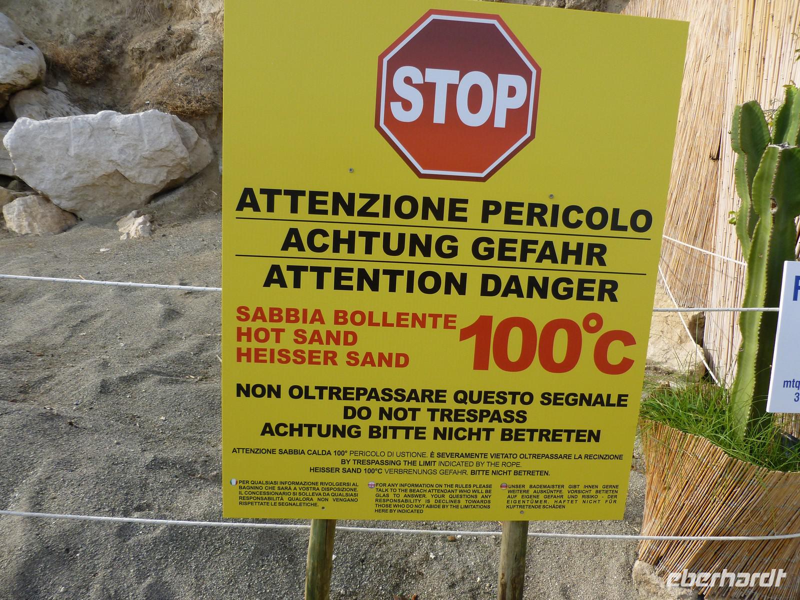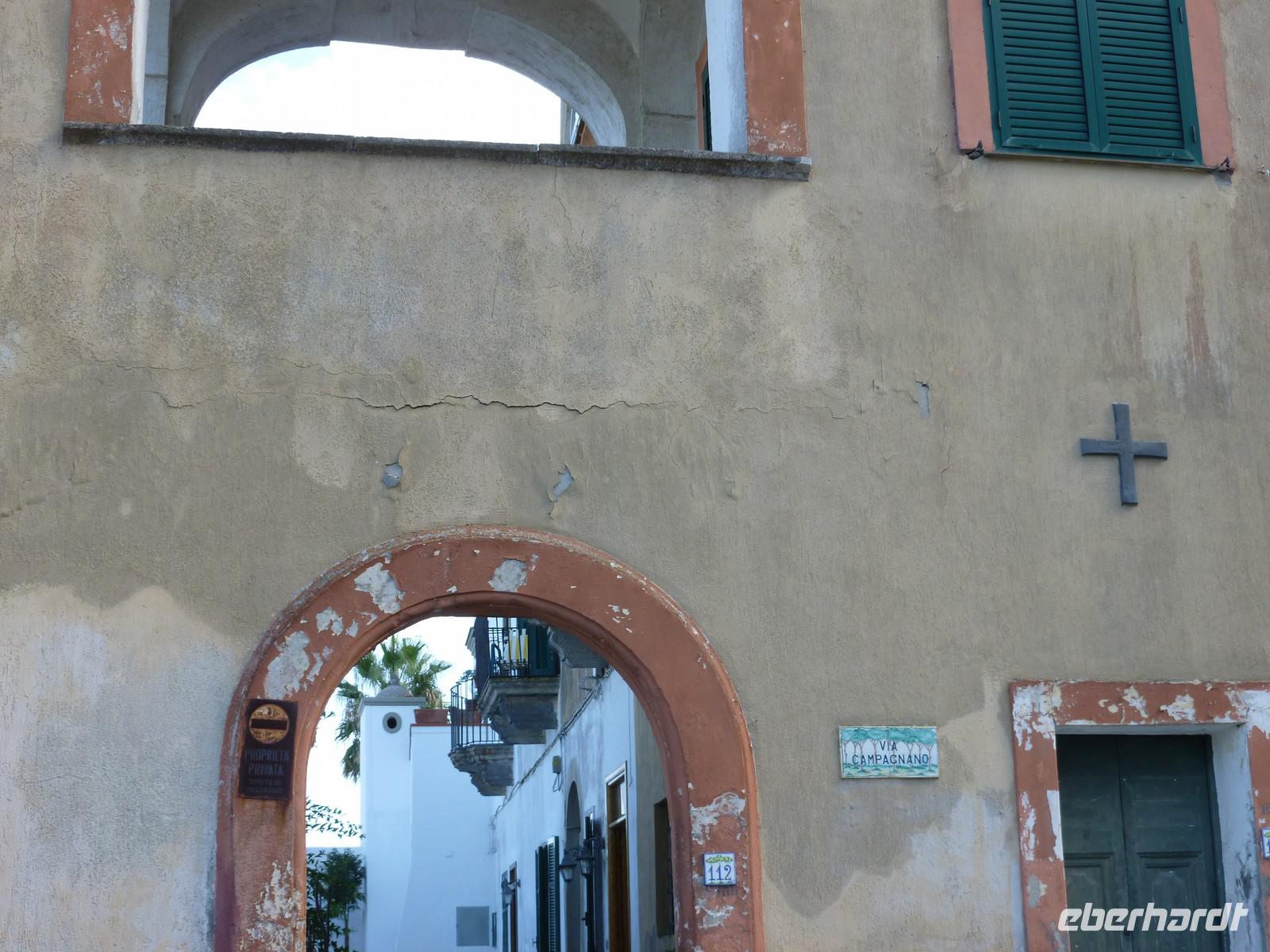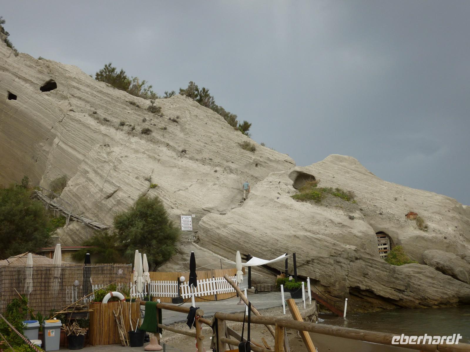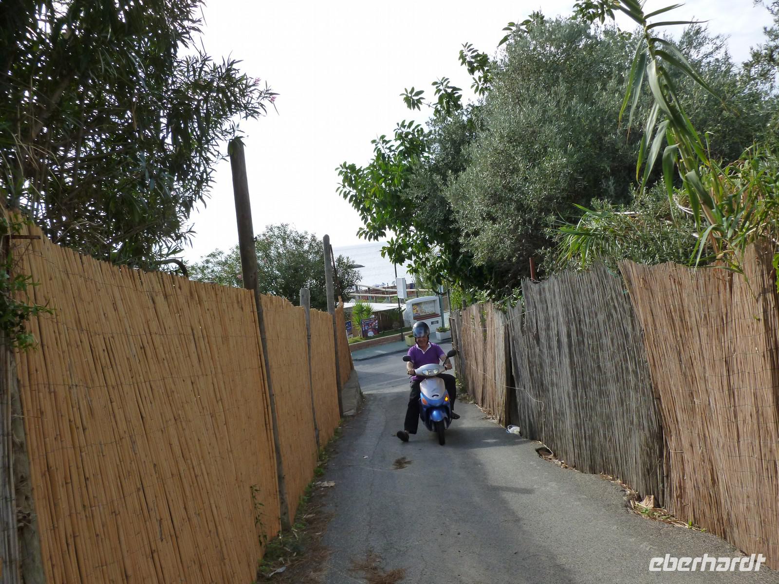Der Regen ließ auf dem Weg zur Mittagsrast nach. Im Restaurant „Belvedere" wurden wir vom Chef persönlich herzlich begrüßt, wir genossen die Sonnenterrasse und den Thermalpool, denn nun war es warm und sonnig. Es erwartete uns ein tolles Essen: Bruschetta, Salat, Spagetti, am Morgen gefangener Lampuka und Limoncello-Torte sowie köstlicher Tischwein. So schön wie es dort war, mussten wir dennoch weiter. Mit dem Linienbus fuhren wir nach Serrara und stiegen am Belvedere aus. Die Aussicht nach Sant Angelo war sehr diesig. Über wiederum viele Stufen stiegen wir in das charmante Fischerdorf bergab und hatten einen wunderschönen Blick über den Maronti-Strand. Unten führte uns Livio auch zu diesem und zeigte uns die Fumarole am Strand. Wir staunten über die Kuranwendung „Heißer Sand am Strand", aber von uns wollte sich gerade niemand einbuddeln lassen. Von Sant Angelo fuhren wir mehr oder weniger individuell mit dem Linienbus CD oder Linie 1 Richtung Forio zurück. Dann wäre es ein eigentlich nur ein kurzer Fußweg zum Hotel, es sei denn, man möchte eine Abkürzung nehmen, die plötzlich nicht mehr da ist.