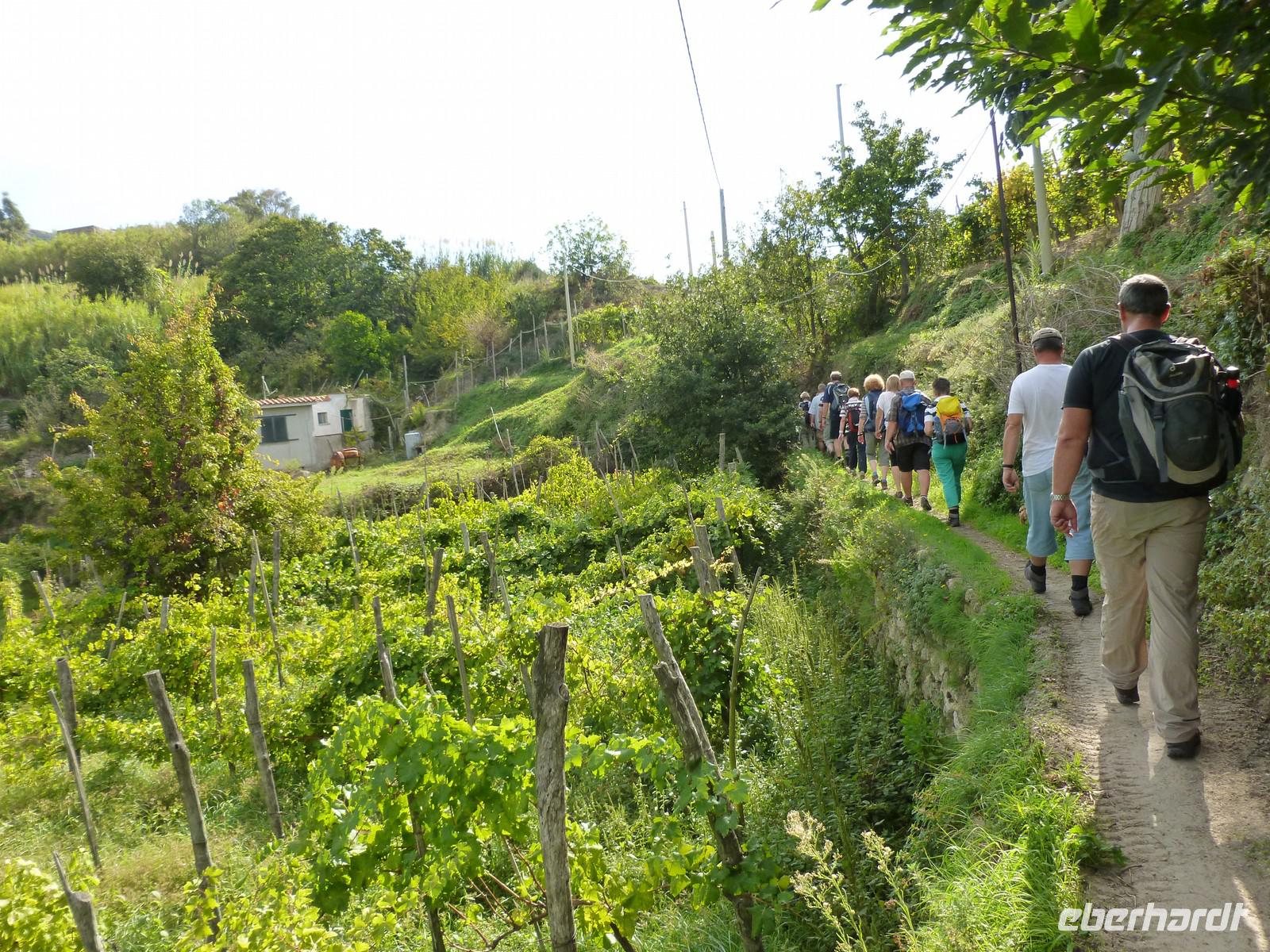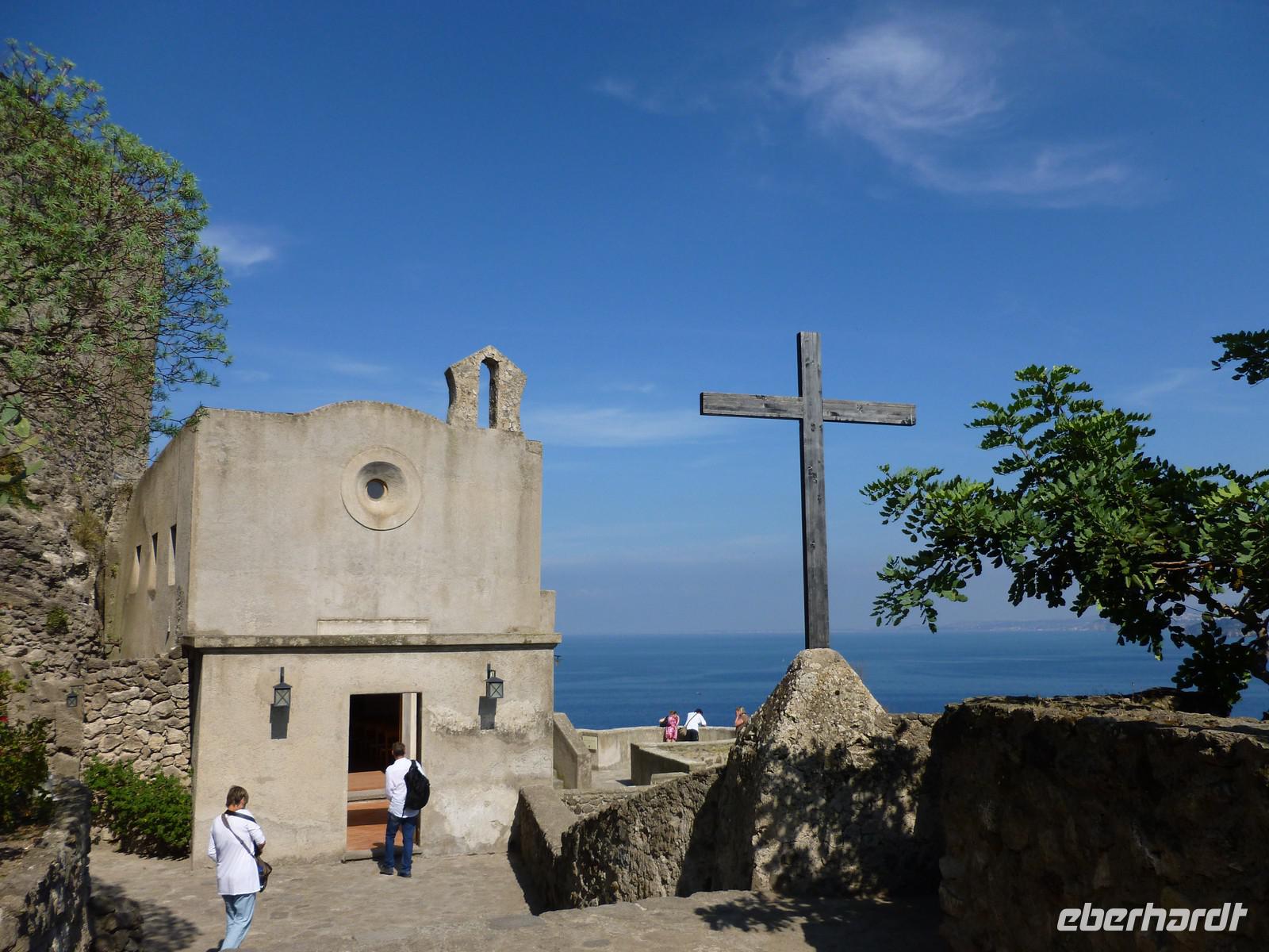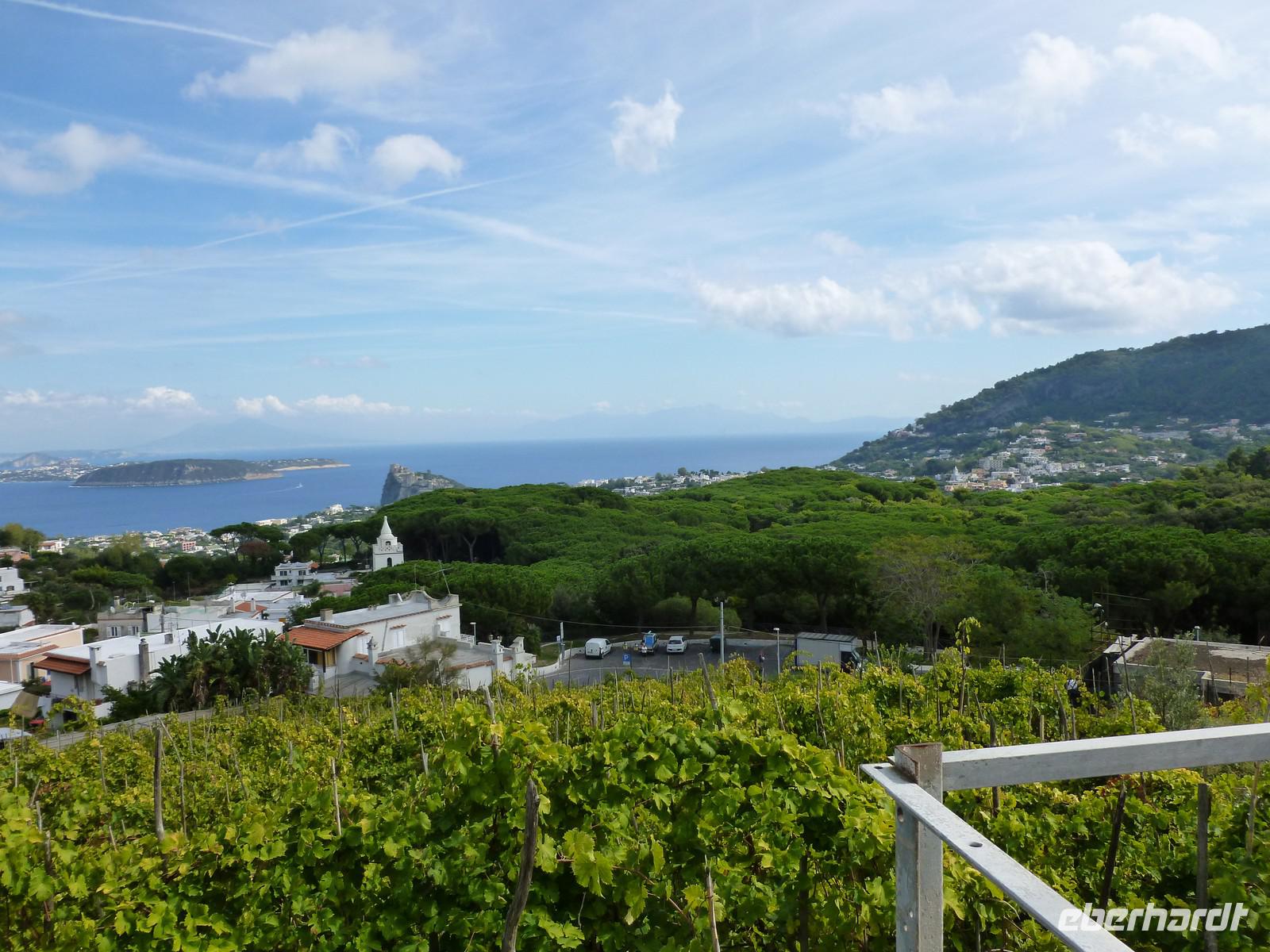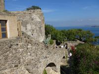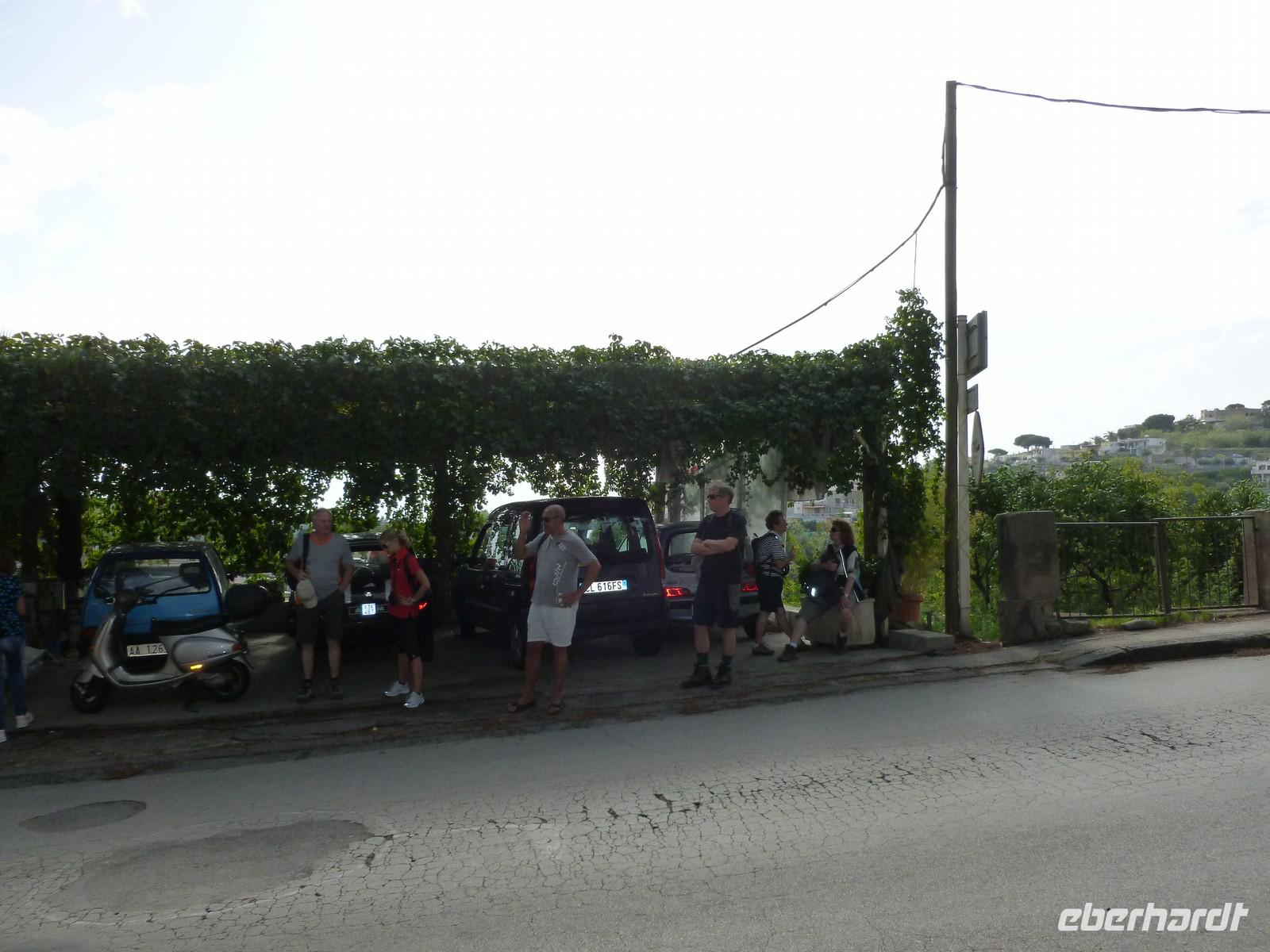 Zum Startpunkt unserer heutigen Wein-Wanderung brachte uns der Bus nach Vatoliere. Hier begann der Weg vorbei an Gärten, Feldern und Weinbergen. An der Wallfahrtskirche Santa Maria al Monte Vergine legten wir einen ersten kleinen (nahrhaften) Stopp ein. Die Sonne meinte es auch heute wieder sehr gut mit uns. Der weitere Weg hatte es in sich: ein steiler Aufstieg brachte uns hoch zur Scarrupata - die interessante Steilküste mit tollen Ausblicken. Auf dem Weg durch die teilweise wildromantischen Weinberge der Piano Liguori genossen wir den Blick auf Capri. Zur Mittagsrast auf der herrlichen Sonnenterrasse von Maria wurden wir bereits von Giro erwartet. Er führt jetzt die Gastwirtschaft seiner Eltern Maria und Guiseppe. Hier wurden wir mit vielen herzhaften „Schmeckerchen" und Wein aus eigener Herstellung überrascht. Unsere weitere Wanderung durch die Weinberge bot uns noch einige Aussichten auf den gesamten Golf von Neapel und die Sorrentinische Küste. Livio lockte uns in eine halbfertige Garage, die ein Weinbauer mit Wein-Utensilien ausstattete. Weil der Bauer selbst nicht da war, erklärte uns Livio Wissenswertes zum Weinanbau und -herstellung. Der Wein zum Probieren aber war reichlich vorhanden. Auf dem Rückweg nach Campagnano kamen wir dem Castello Aragonese am nächsten. Schon beachtlich, dass auf dieser kleinen Felsinsel so viele Leute gewohnt haben sollten. Aber dazu später Näheres. Wir verabschiedeten uns dankend von Livio und fuhren mit dem Bus zum Hotel zurück. Auch heute blieb noch Zeit für Strand und Pool.