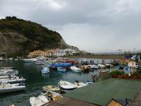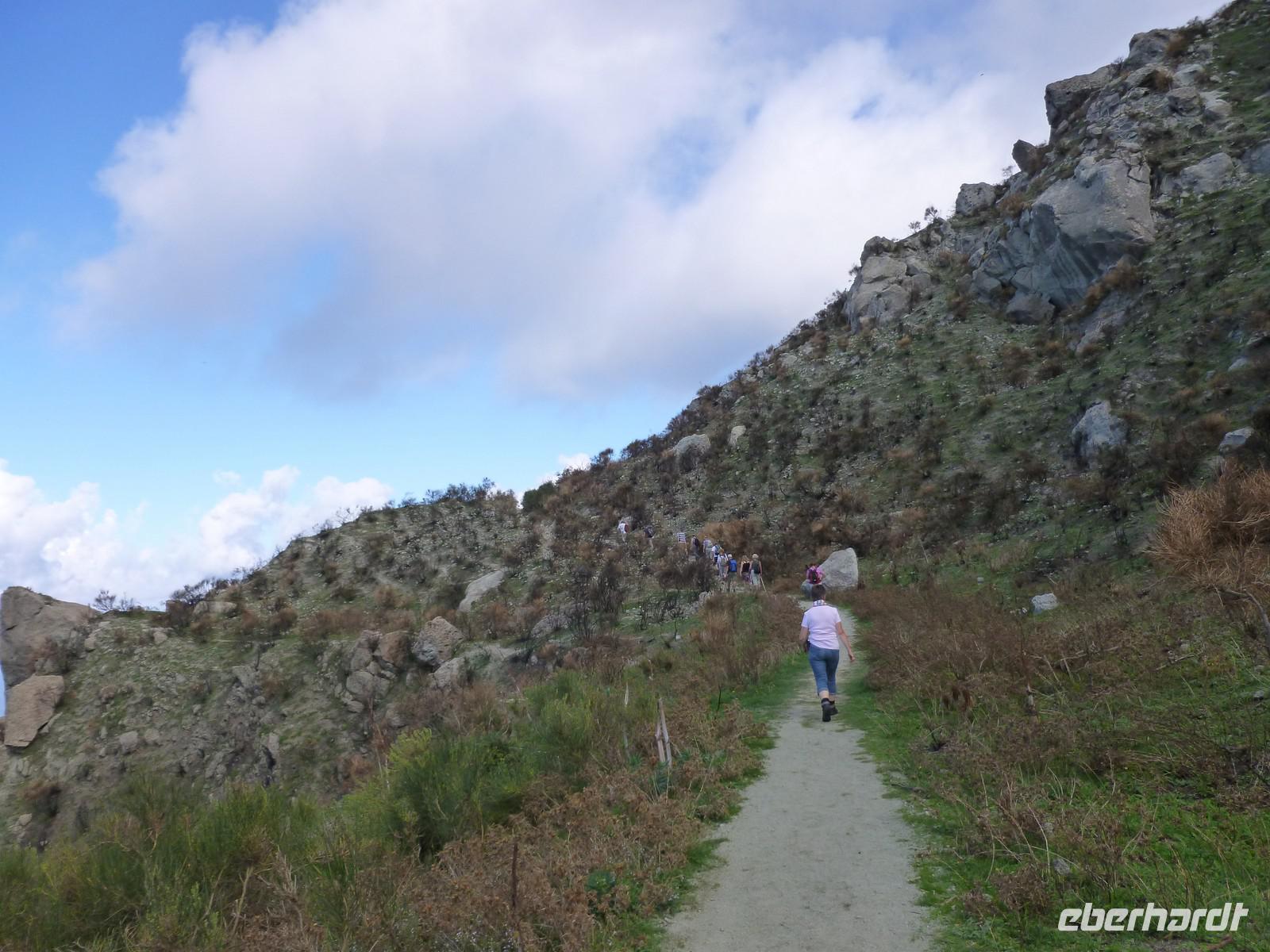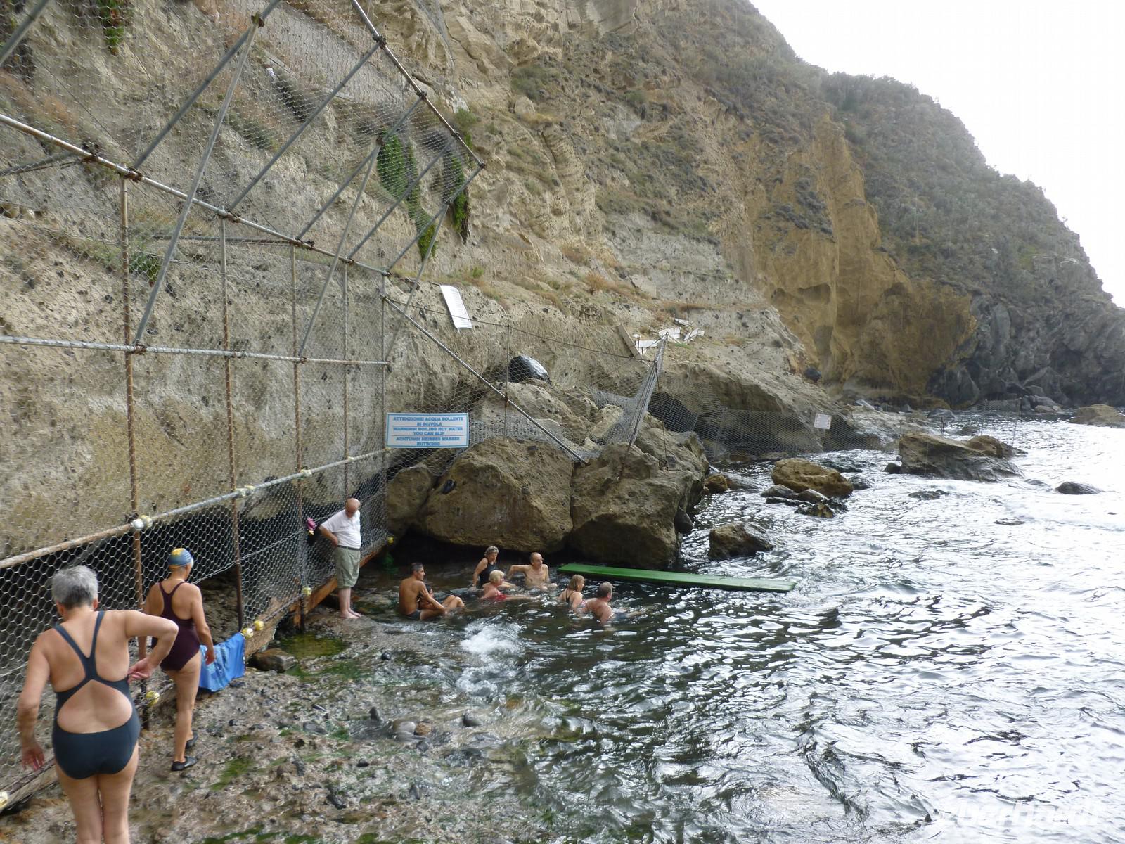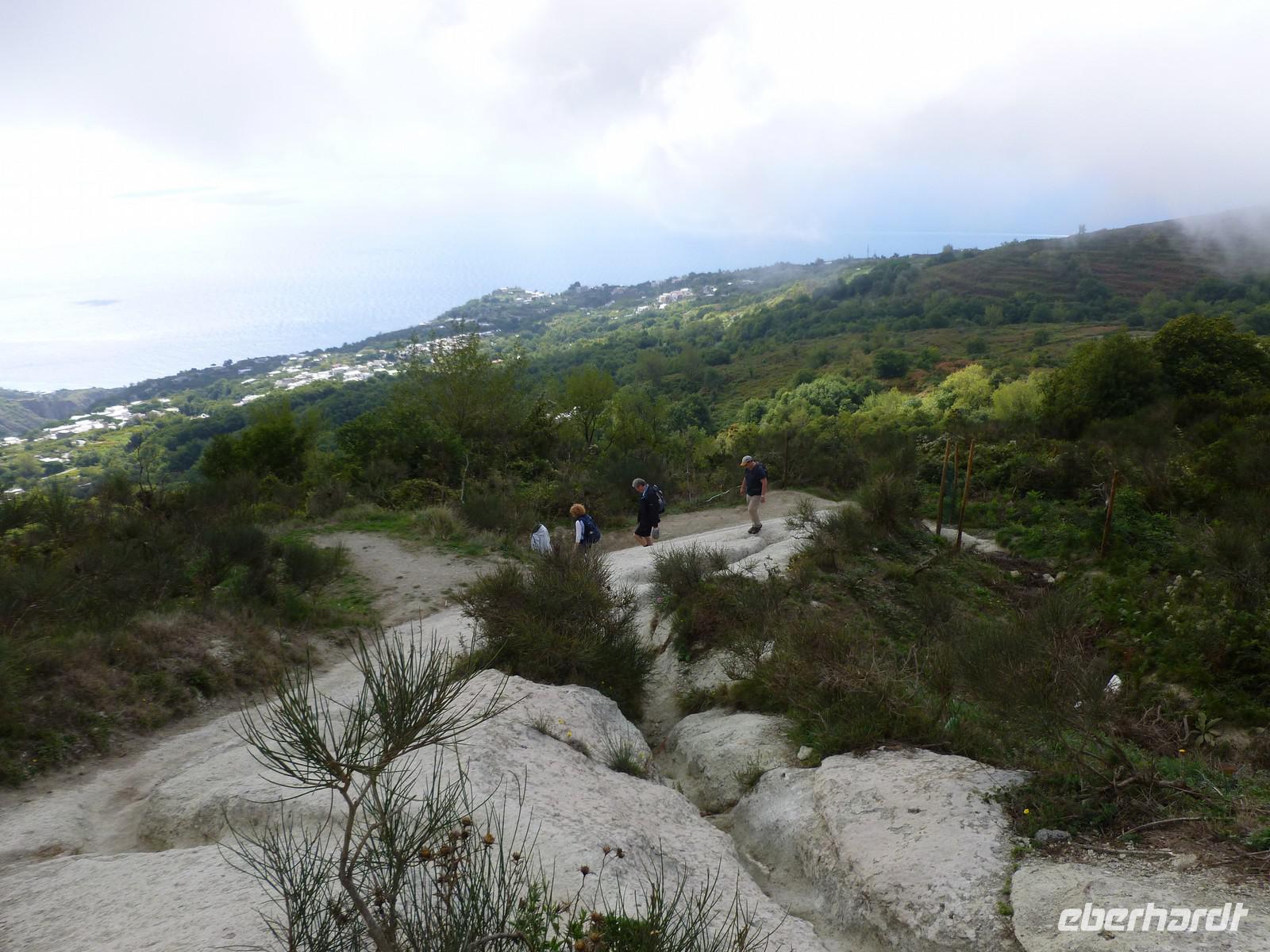 Leider begrüßte uns der Morgen mit Regen, aber es war trotzdem warm. Am Hotel begrüßte uns Livio, der örtliche Wanderreiseleiter und unser Ischiaführer für die nächsten vier Tage. Wir liefen ab Hotel steil die Straße bergan nach Cuotto, dem Ort über der Bucht von Forio-Citara. Von hier konnte man einen Überblick über den Poseidonthermalgarten gewinnen. Dann ging der Weg bei Regenschauern zum Aussichtpunkt oberhalb des Leuchtturms mit tollem Blick auf das Meer. Nun zeigte uns Livio den erloschenen Krater Campotese, jetzt natürlich landwirtschaftlich genutzt. Der Weg zur Felsenbucht Sorgeto mit der heißen Quelle ist größtenteils befestigt und der letzte Abstieg mit vielen, neuen Stufen versehen. Aufgrund des Windes, der heute mit einer starken Brandung das Meerwasser in die Bucht drückte und daher auch das heiße Wasser zurückdrängte, war kein schönes Baden möglich.
