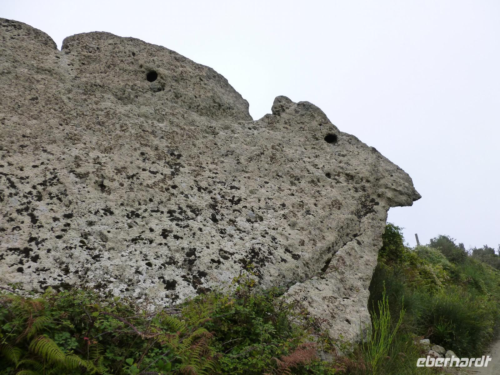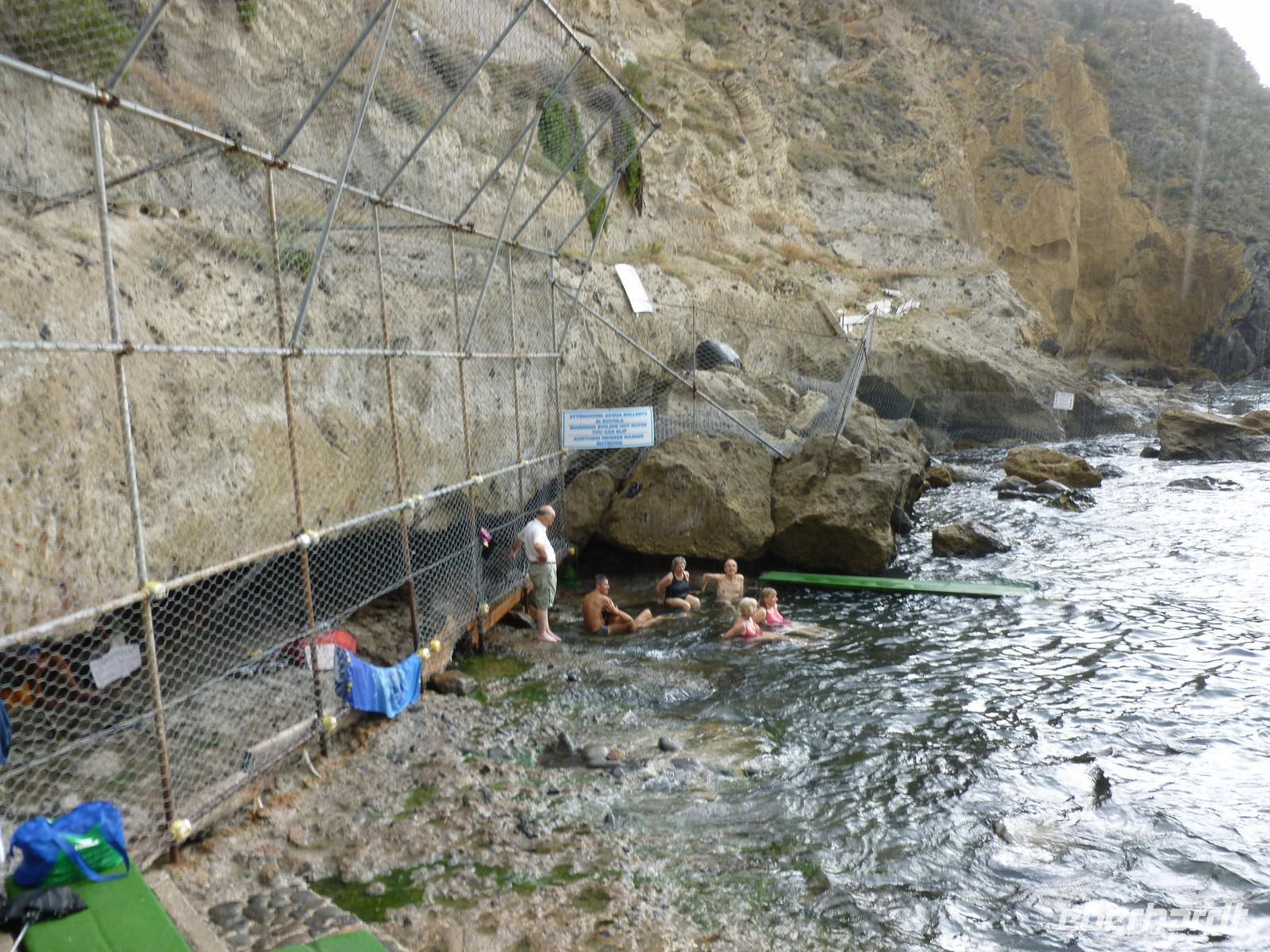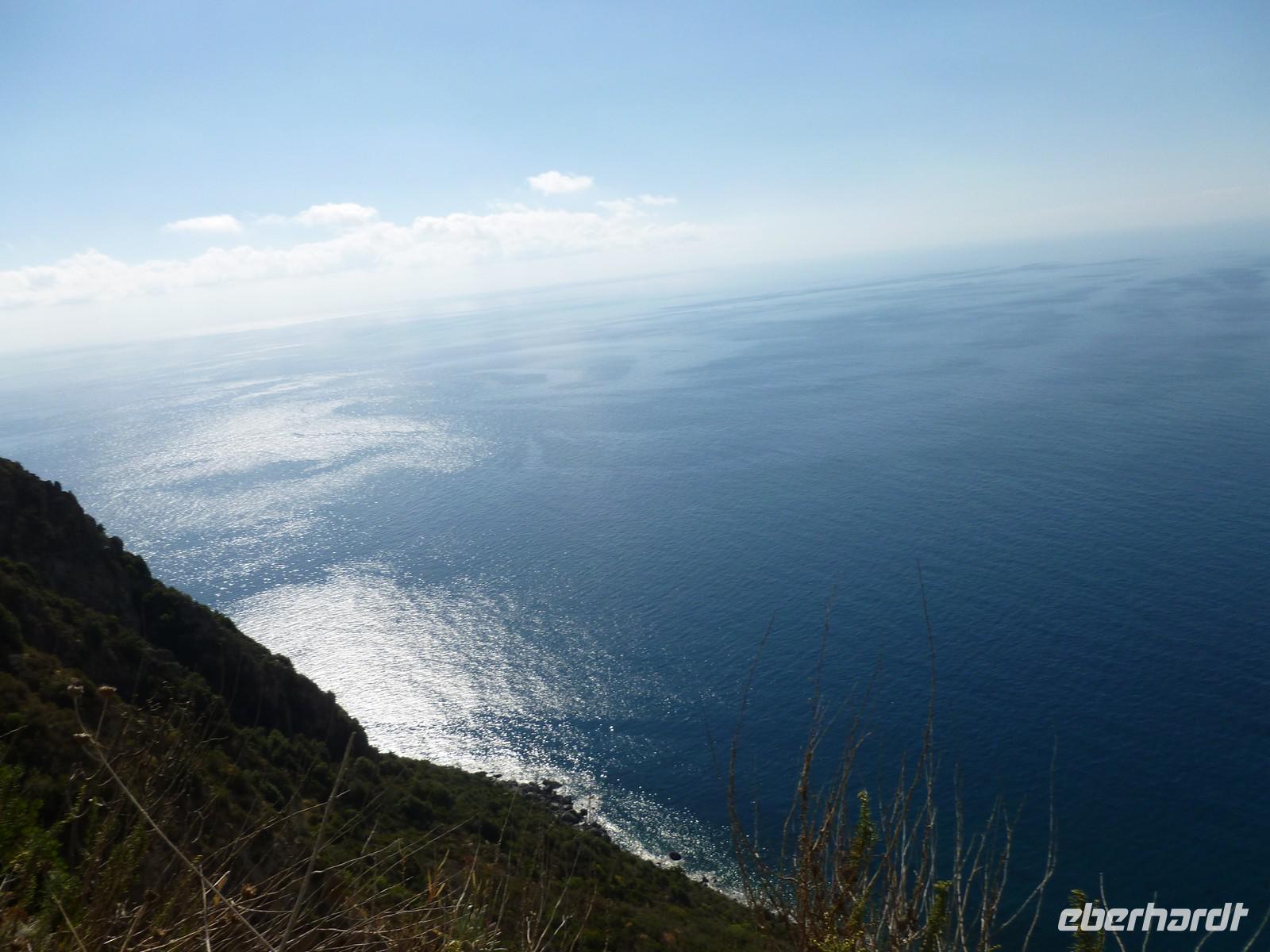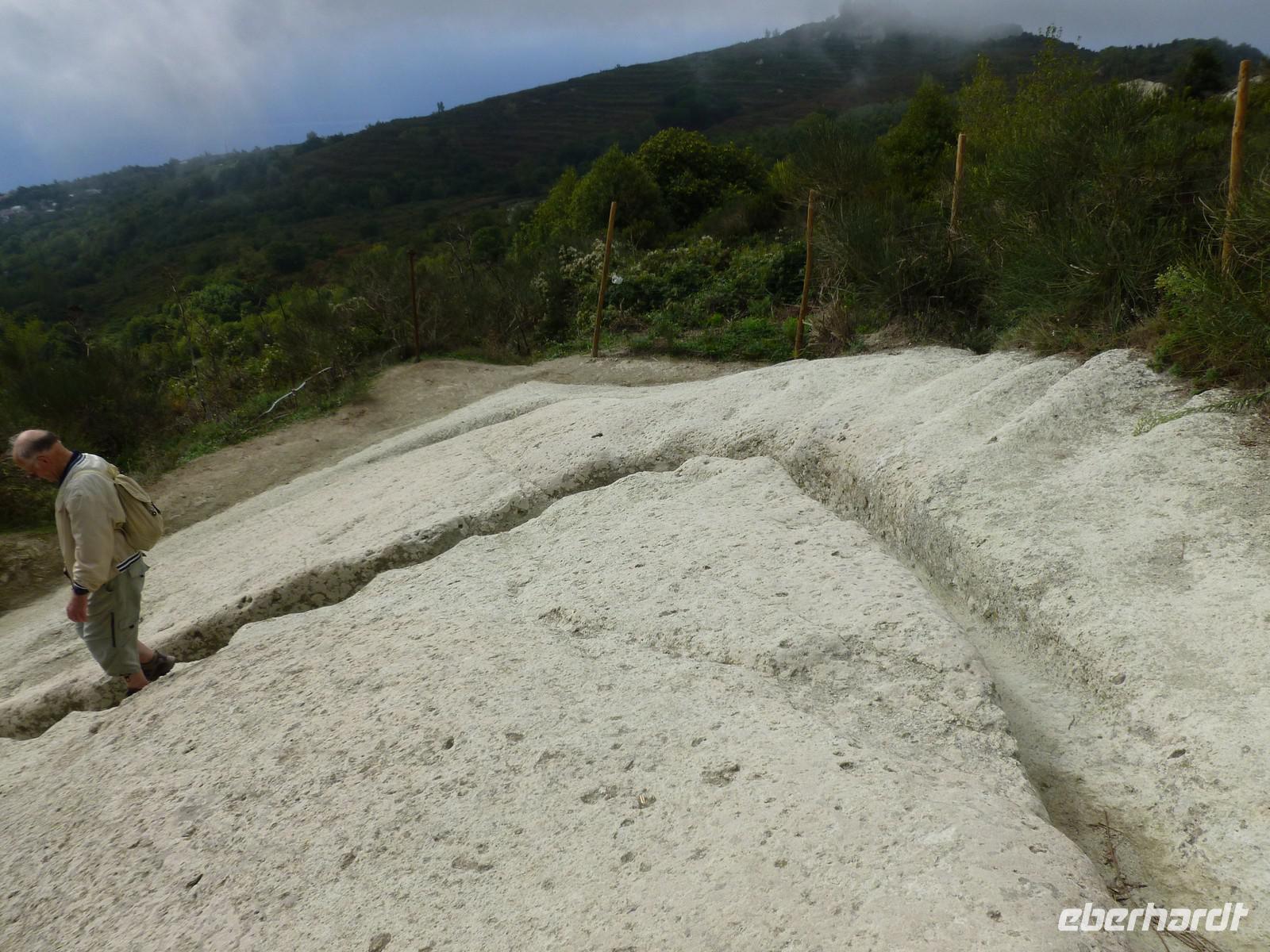Leider begrüßte uns der Morgen mit Regen, aber es war trotzdem warm. Am Hotel begrüßte uns Livio, der örtliche Wanderreiseleiter und unser Ischiaführer für die nächsten vier Tage. Wir liefen ab Hotel steil die Straße bergan nach Cuotto, dem Ort über der Bucht von Forio-Citara. Von hier konnte man einen Überblick über den Poseidonthermalgarten gewinnen. Dann ging der Weg bei Regenschauern zum Aussichtpunkt oberhalb des Leuchtturms mit tollem Blick auf das Meer. Nun zeigte uns Livio den erloschenen Krater Campotese, jetzt natürlich landwirtschaftlich genutzt. Der Weg zur Felsenbucht Sorgeto mit der heißen Quelle ist größtenteils befestigt und der letzte Abstieg mit vielen, neuen Stufen versehen. Aufgrund des Windes, der heute mit einer starken Brandung das Meerwasser in die Bucht drückte und daher auch das heiße Wasser zurückdrängte, war kein schönes Baden möglich.
