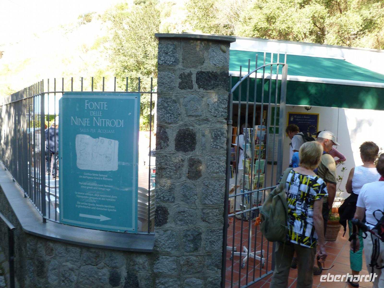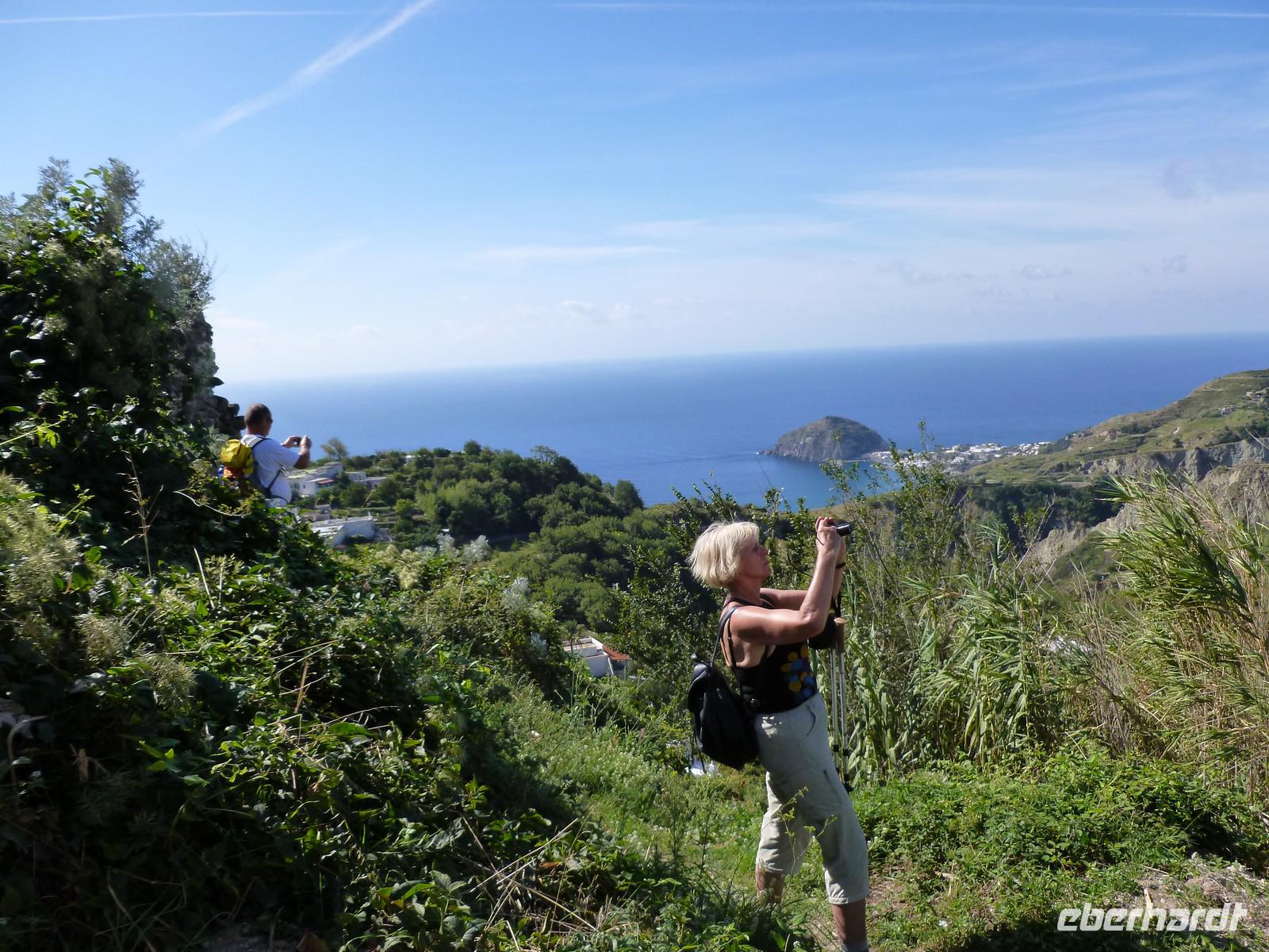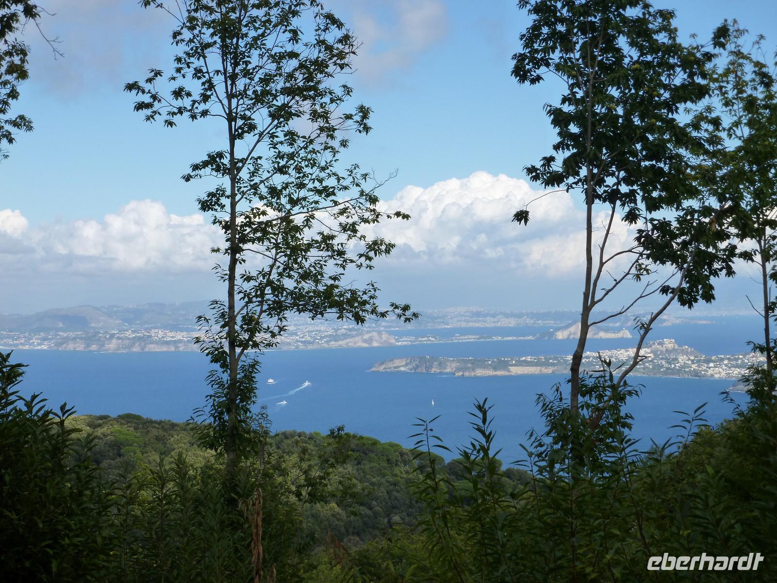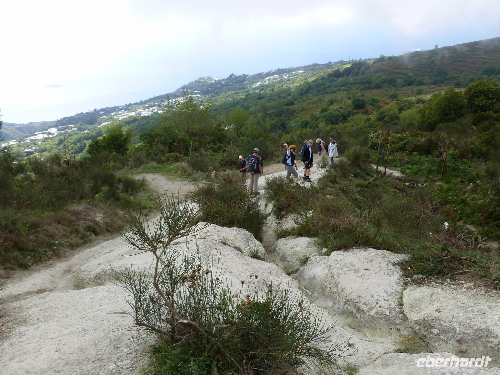 Dann liefen wir zum Wald-Restaurant „La Quieta" zur Mittagseinkehr. Ein großer Tisch war bereits für uns eingedeckt und der Wein stand bereit. Das typisch italienische Picknick bestand aus frischem Salat, Bruschetta und Spagetti. Das Meer glitzerte von fern in der Sonne. Auf unserem weiteren Weg kamen wir an Piano San Paolo vorbei. Auch zur Radarstation fand Livio ein paar Worte. Nun wanderten wir durch Wälder mit Maronen und Farnen bis zur Bucetoquelle, eine der wenigen Trinkwasserquellen auf Ischia. Immer wieder bekamen wir tolle Ausblicke auf das Meer, auf Procida und den Golf von Neapel. Da wir schnelle Füße hatten (ent-)führte uns Livio noch zum Wald der Maddalena, einem zauberhaften Pinienwald, und zum Fondo d' Oglio. Auch hier zeigte er uns Fumarolen. Am Ortseingang von Casamicciola wurden wir vom Bus abgeholt und zurück ins Hotel gefahren.