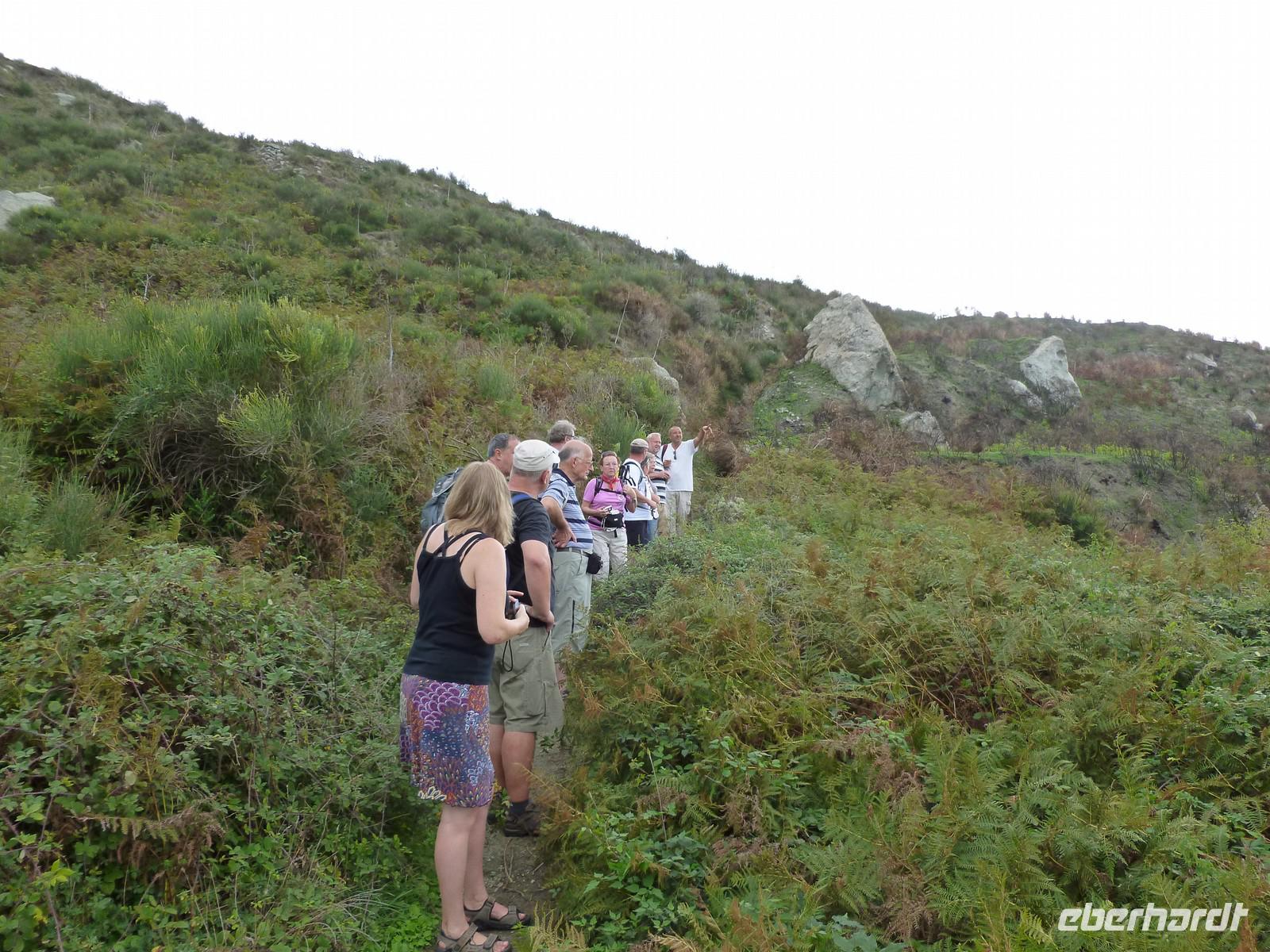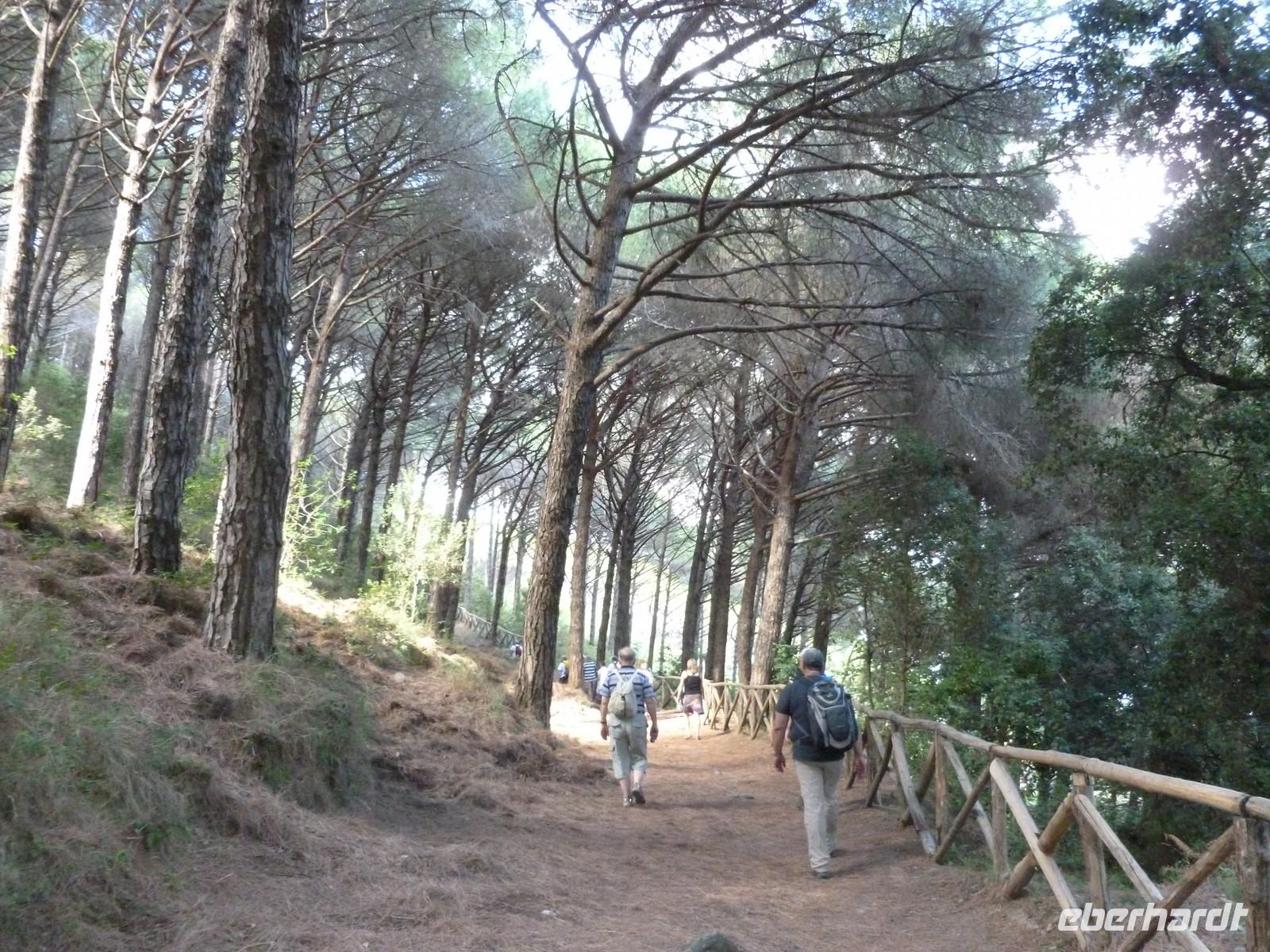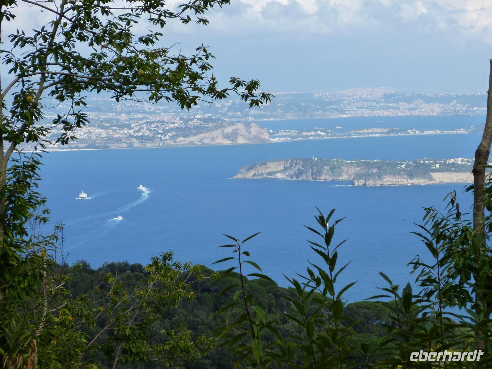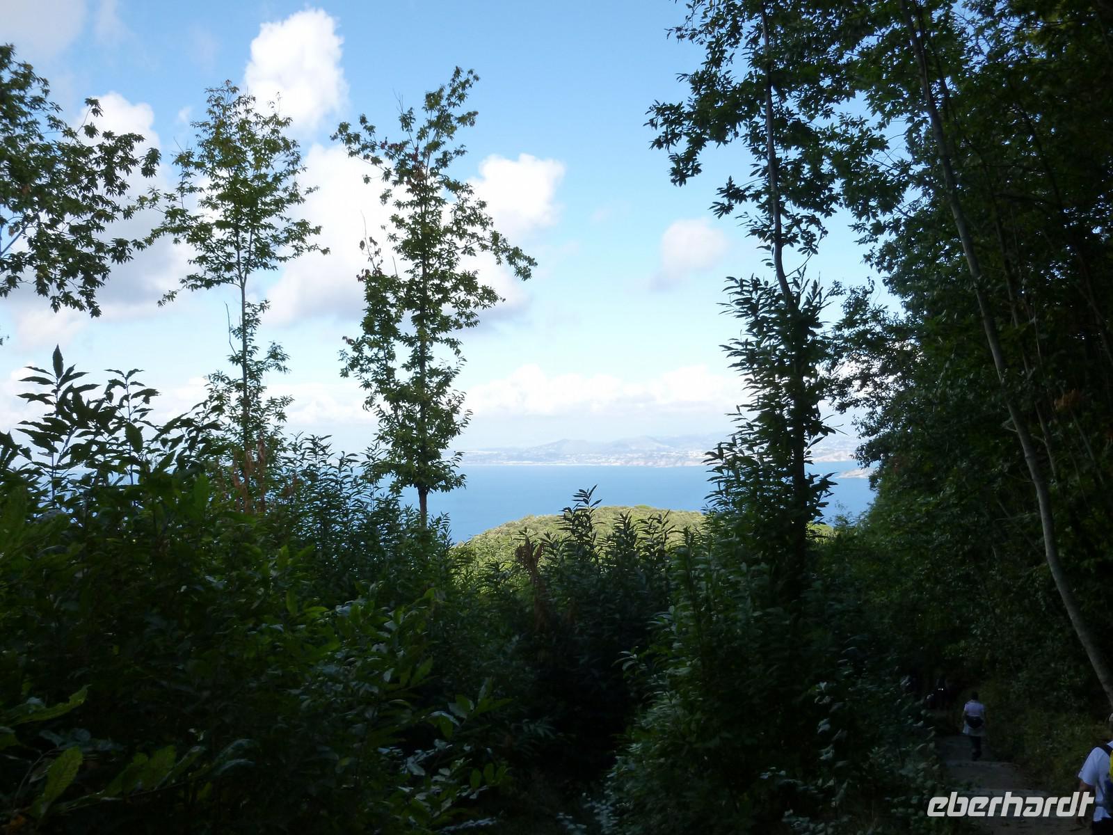 Dann liefen wir zum Wald-Restaurant „La Quieta" zur Mittagseinkehr. Ein großer Tisch war bereits für uns eingedeckt und der Wein stand bereit. Das typisch italienische Picknick bestand aus frischem Salat, Bruschetta und Spagetti. Das Meer glitzerte von fern in der Sonne. Auf unserem weiteren Weg kamen wir an Piano San Paolo vorbei. Auch zur Radarstation fand Livio ein paar Worte. Nun wanderten wir durch Wälder mit Maronen und Farnen bis zur Bucetoquelle, eine der wenigen Trinkwasserquellen auf Ischia. Immer wieder bekamen wir tolle Ausblicke auf das Meer, auf Procida und den Golf von Neapel. Da wir schnelle Füße hatten (ent-)führte uns Livio noch zum Wald der Maddalena, einem zauberhaften Pinienwald, und zum Fondo d' Oglio. Auch hier zeigte er uns Fumarolen. Am Ortseingang von Casamicciola wurden wir vom Bus abgeholt und zurück ins Hotel gefahren.