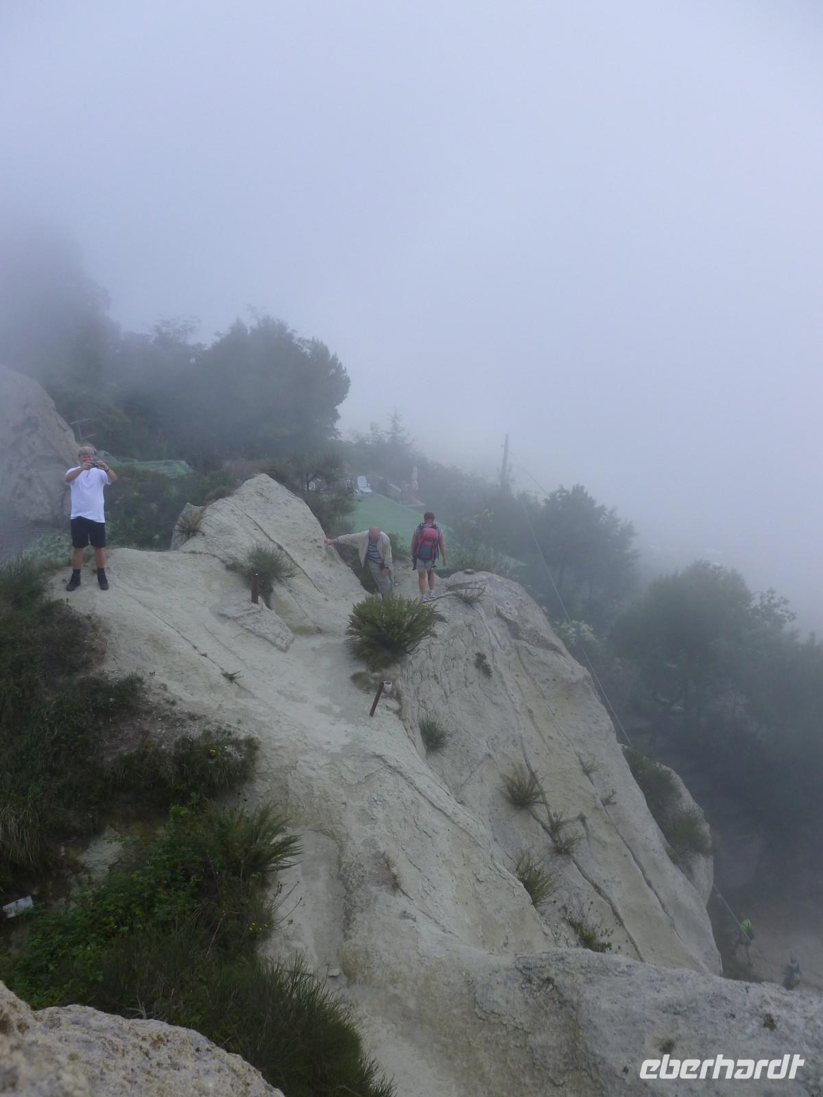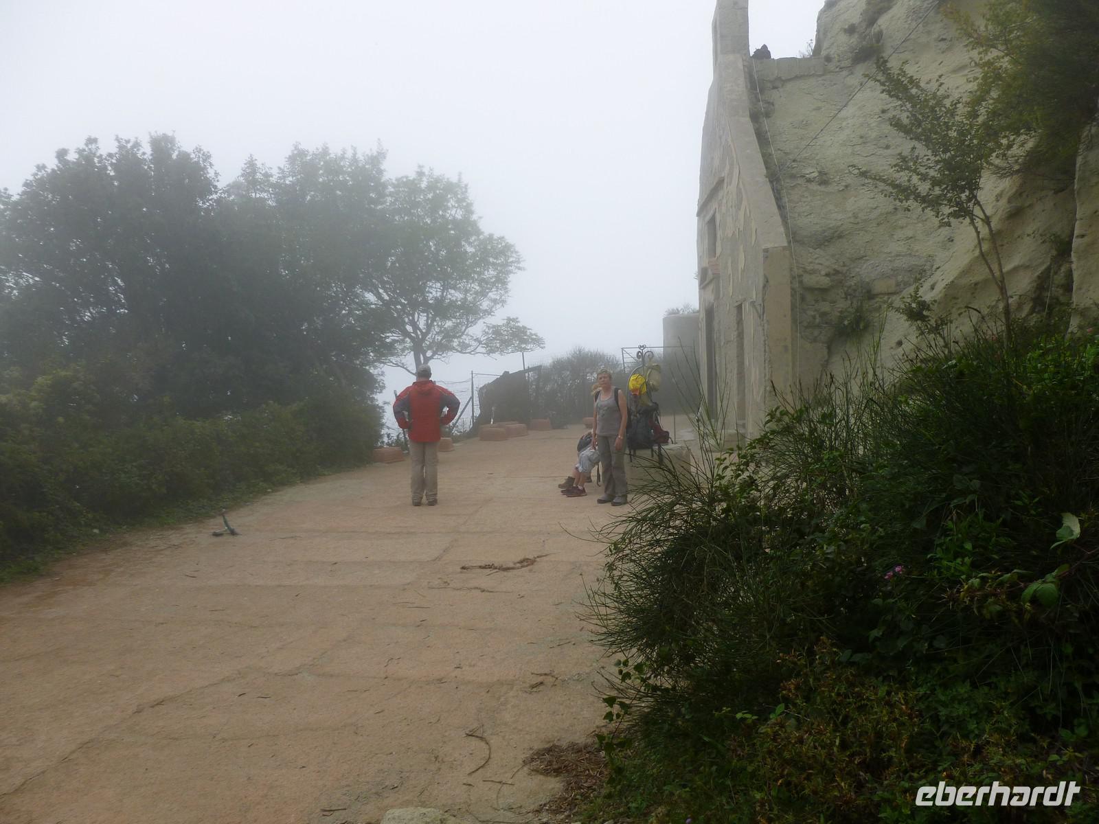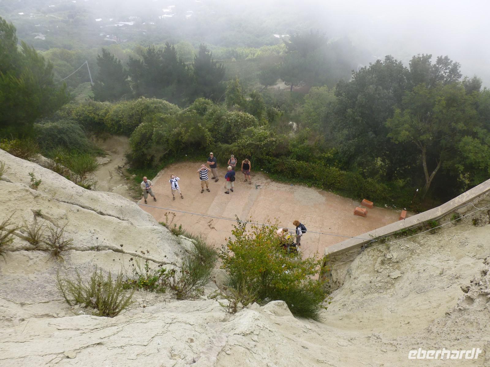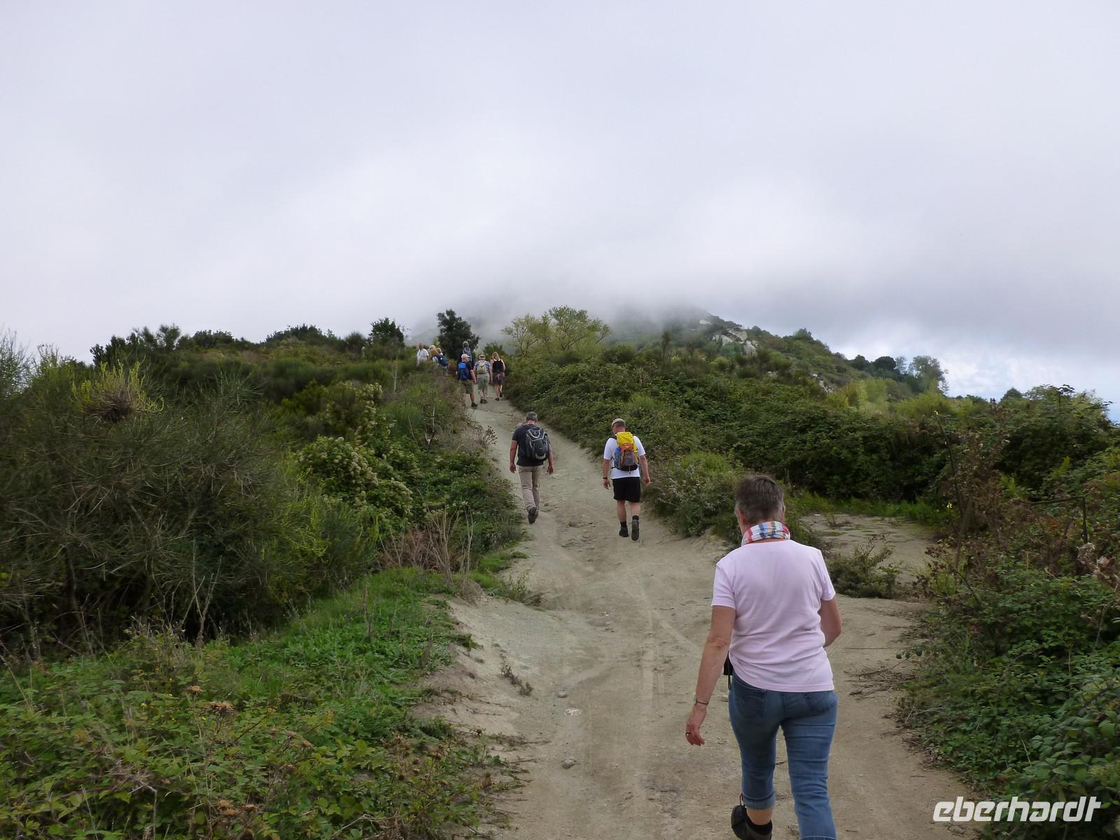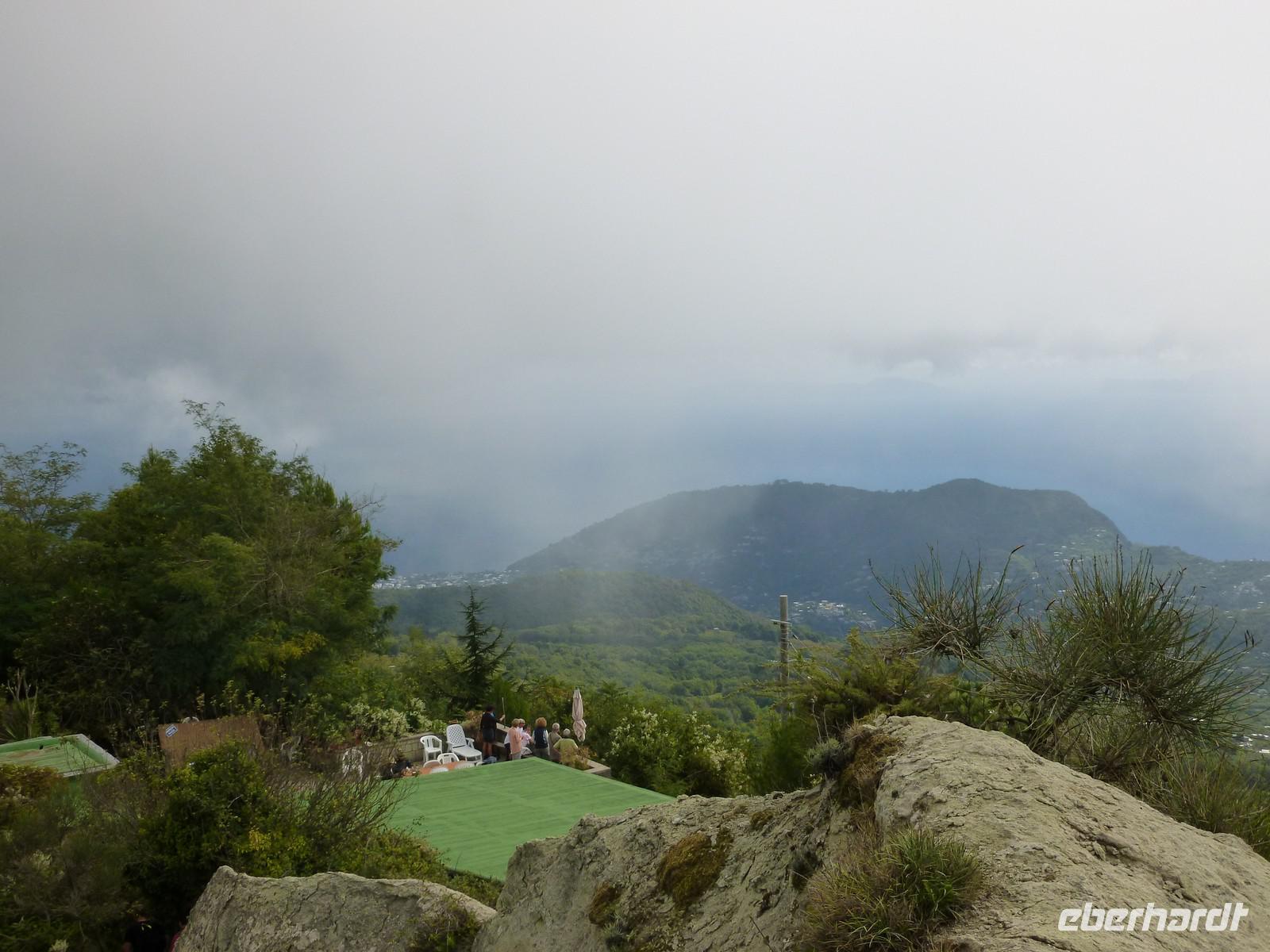 Livio holte uns am Hotel ab und zeigte seine Wanderschuhe, die man heute bräuchte, denn es geht auf den höchsten Berg der Insel. Wir fuhren mit dem Bus eine sehr steile Straße hinauf nach Kalimera, einem kleinen Örtchen oberhalb des Örtchens Serrara, und liefen den weiterhin steilen Weg hinan. Anfangs war es noch klar, aber je höher wir kamen umso mehr waren wir in den Wolken. An der Eremitenkapelle machten wir Halt und einige wagten den Aufstieg zum Gipfel des Monte Epomeo, heute eben leider ohne Aussicht...