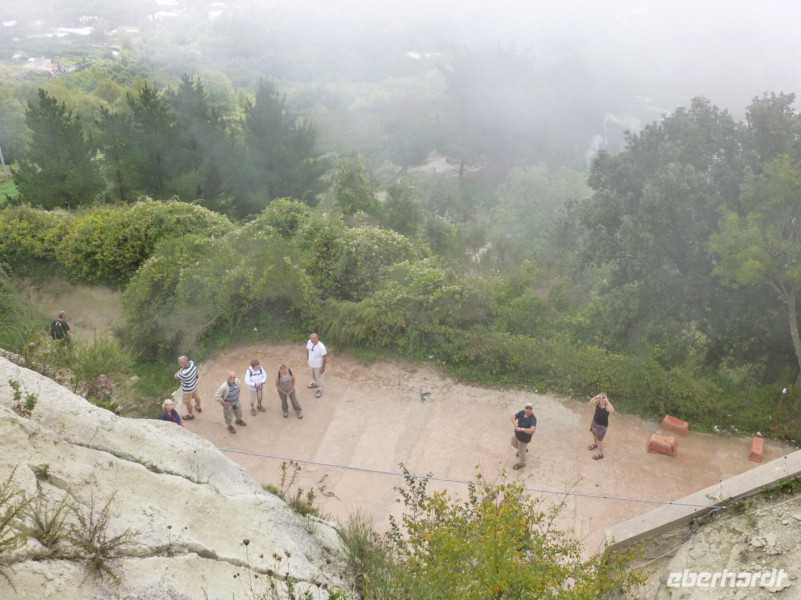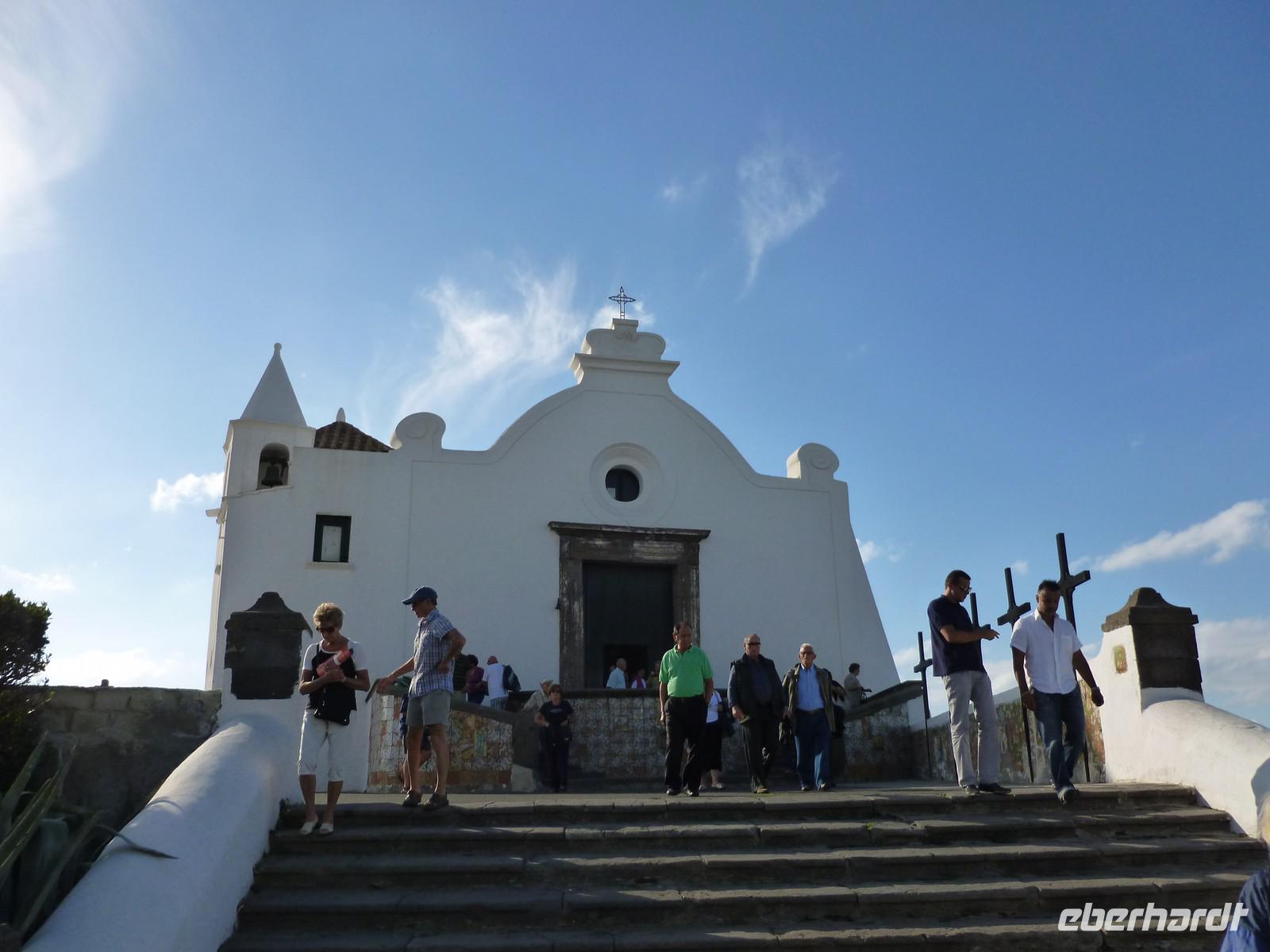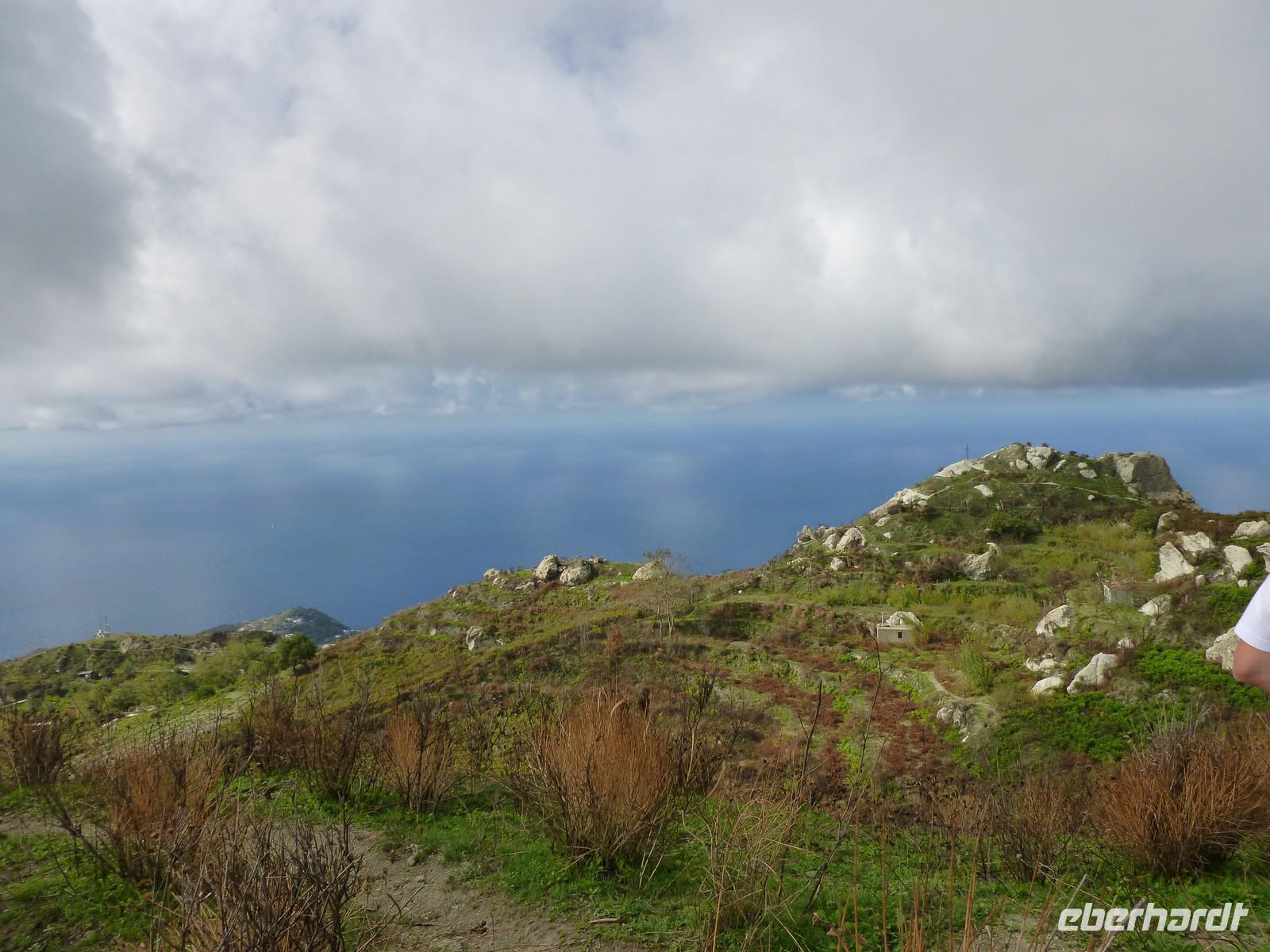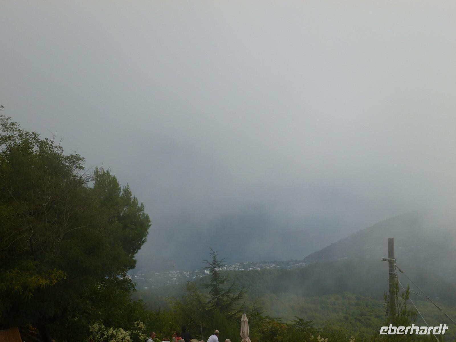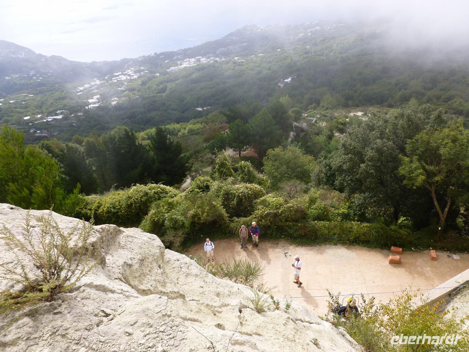 Livio holte uns am Hotel ab und zeigte seine Wanderschuhe, die man heute bräuchte, denn es geht auf den höchsten Berg der Insel. Wir fuhren mit dem Bus eine sehr steile Straße hinauf nach Kalimera, einem kleinen Örtchen oberhalb des Örtchens Serrara, und liefen den weiterhin steilen Weg hinan. Anfangs war es noch klar, aber je höher wir kamen umso mehr waren wir in den Wolken. An der Eremitenkapelle machten wir Halt und einige wagten den Aufstieg zum Gipfel des Monte Epomeo, heute eben leider ohne Aussicht...