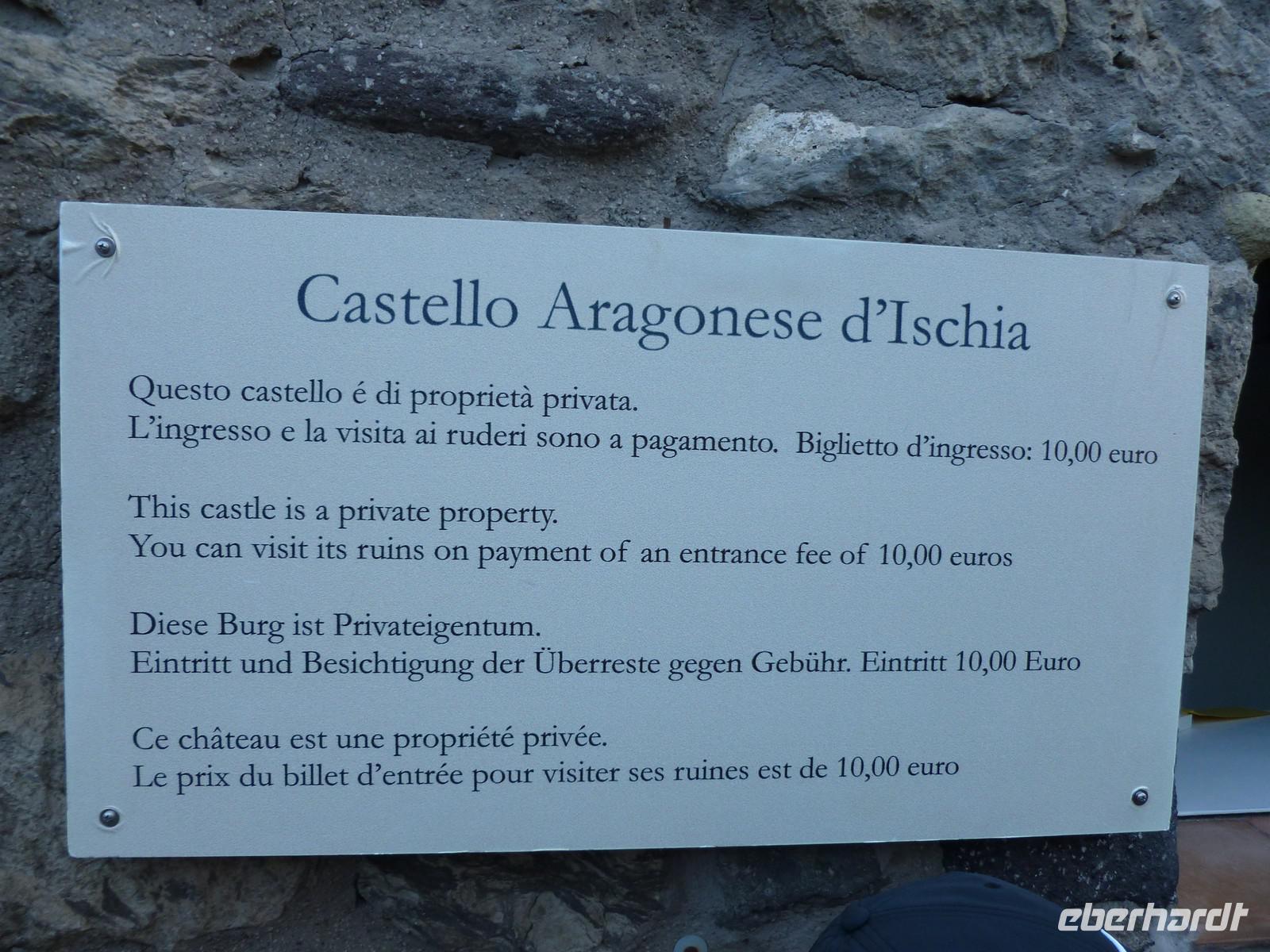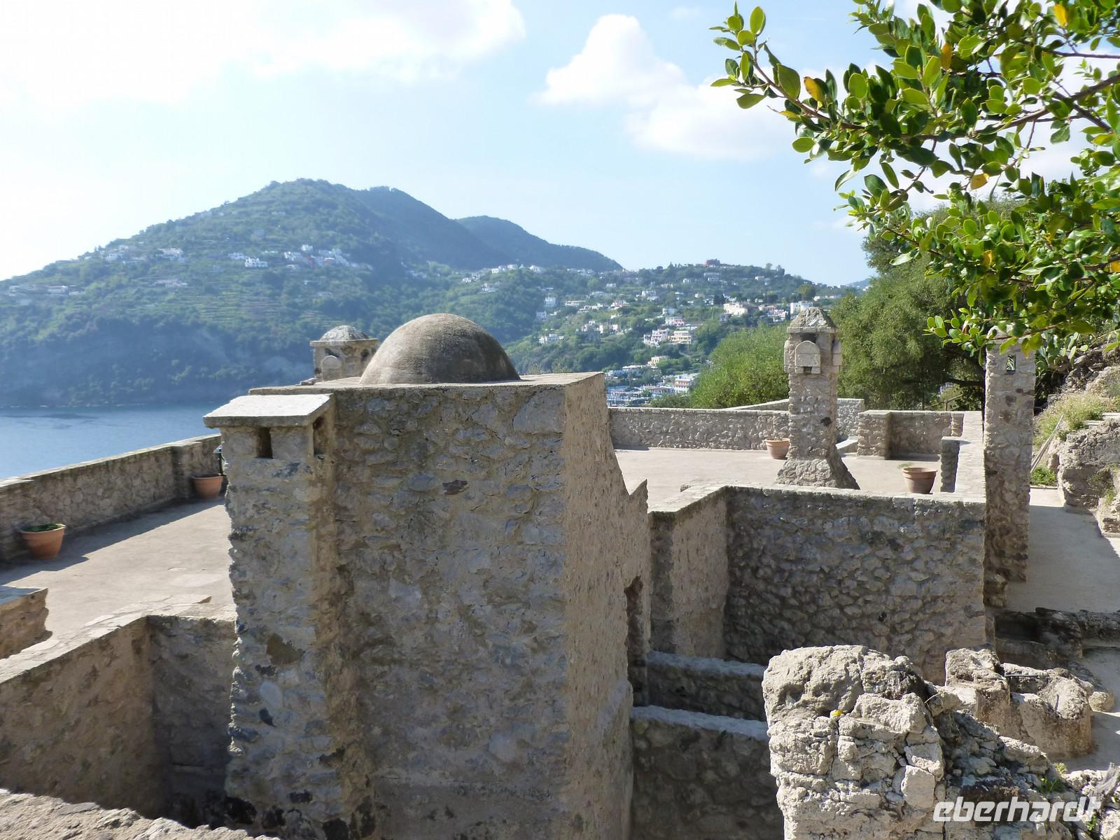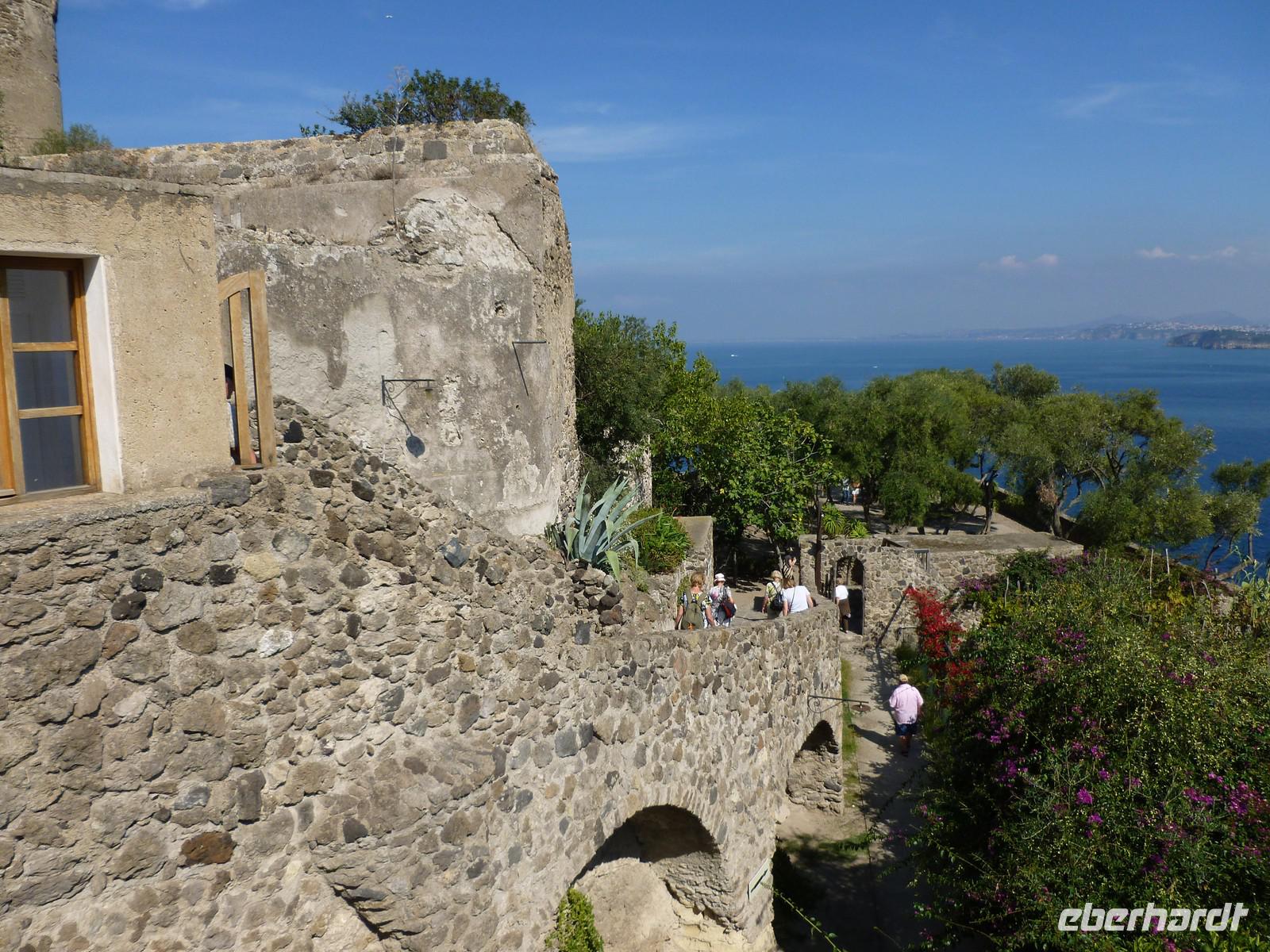 Leider war der fakultative Ausflug zur Nachbarinsel Procida nicht zustande gekommen. Die Gäste, die trotzdem noch mehr sehen und erleben wollten, besuchten gemeinsam das Castello Aragonese. Wir fuhren also zu siebent mit dem Linienbus Nr.2 direkt ab Hotel nach Ischia Porto und schlenderten (Livios Tipp) durch die lange Geschäftsstrasse Via Roma bis nach Ischia Ponte. Über den Damm, der die Burginsel mit dem Festland verbindet, gingen wir zum Castello. Die Historie ist sehr interessant: 474 v.Chr. wurde hier eine griechische Festung errichtet. Der zerstörerische Vulkanausbruch des Monte Trippodi von 1301 ließ tausende Menschen auf den Burgfelsen fliehen. Alfons von Aragon ordnete 1440 den Ausbau der Burg an. Ende des 16. Jahrhundert wohnten hier 1890 Familien, zusätzlich gab es auf der Burg ein Klarissen-Kloster, eine Basilianer-Abtei, 13 Kirchen, hier war Bischofssitz, Fürstenresidenz und Garnisonsort; daher lebten zeitweise ca. 5000 Menschen auf dem Felsen! Nach britischer Zerstörung 1809 und Nutzung als Gefängnis ist es seit 1912 in privater Hand. Es gibt heute sogar ein kleines Hotel und Ferienwohnungen. Was man auf den ersten Blick nicht vermutet: auf der anderen Seite der Insel gibt es wunderschöne Gärten mit Wein, Obst- und Olivenbäumen. Gruselig stellt sich für uns der Nonnenfriedhof dar, weil die Verstorbenen eben nicht vergraben wurden und eine „Beisetzung" im anderen Sinn erhielten... Damals. Dafür genießen wir herrliche Ausblicke und die Sonne an diesem wunderschönen Tag. Mit dem Linienbus ging es auch wieder zurück.