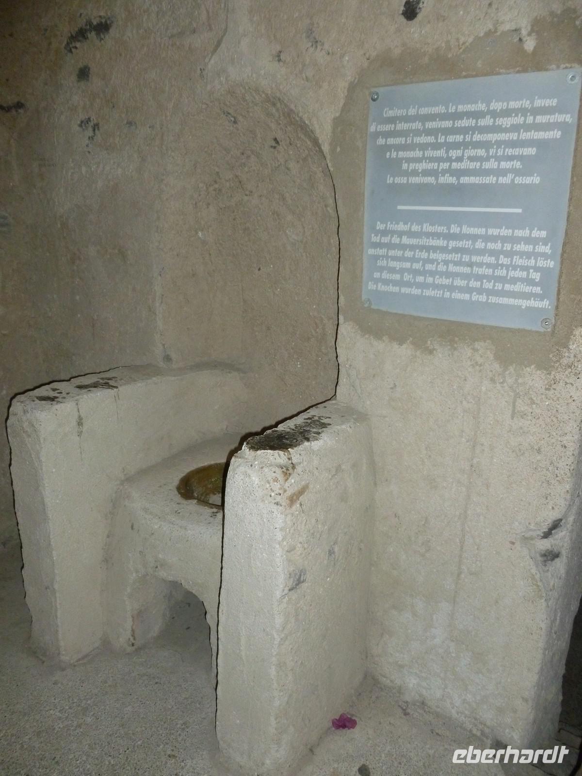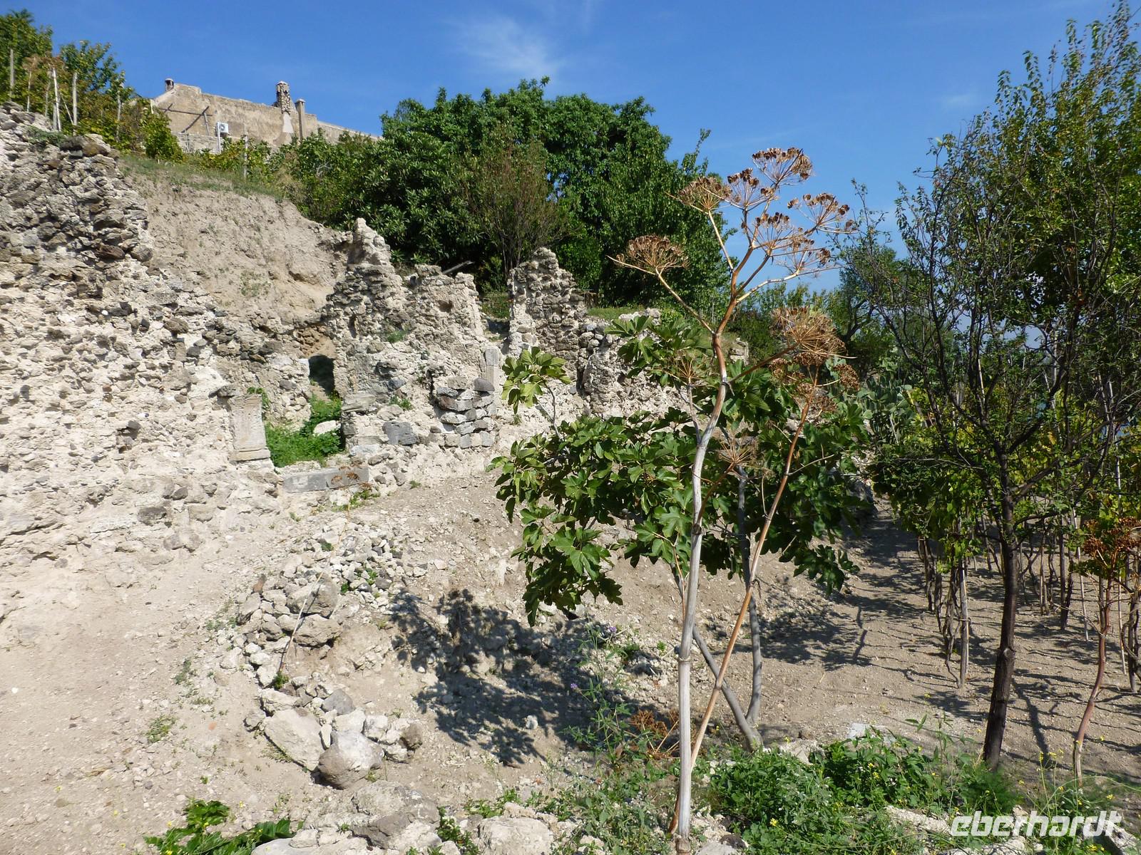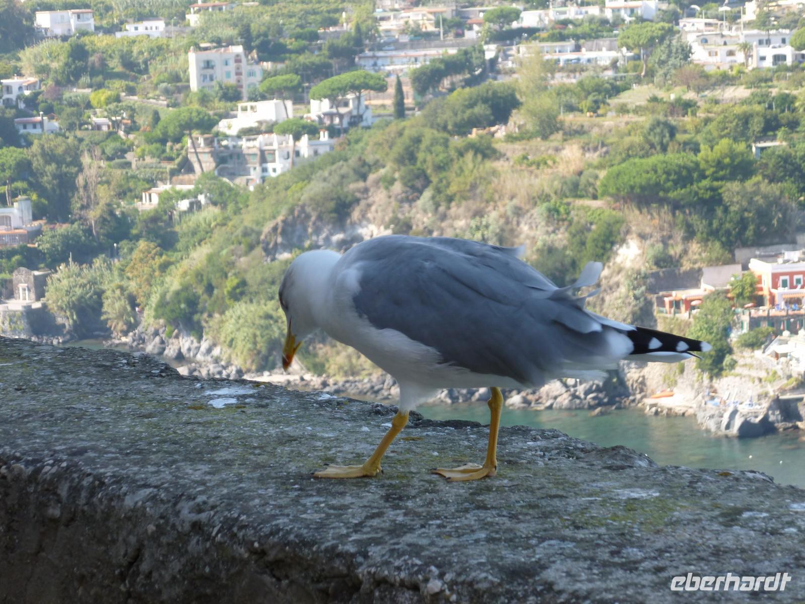 Leider war der fakultative Ausflug zur Nachbarinsel Procida nicht zustande gekommen. Die Gäste, die trotzdem noch mehr sehen und erleben wollten, besuchten gemeinsam das Castello Aragonese. Wir fuhren also zu siebent mit dem Linienbus Nr.2 direkt ab Hotel nach Ischia Porto und schlenderten (Livios Tipp) durch die lange Geschäftsstrasse Via Roma bis nach Ischia Ponte. Über den Damm, der die Burginsel mit dem Festland verbindet, gingen wir zum Castello. Die Historie ist sehr interessant: 474 v.Chr. wurde hier eine griechische Festung errichtet. Der zerstörerische Vulkanausbruch des Monte Trippodi von 1301 ließ tausende Menschen auf den Burgfelsen fliehen. Alfons von Aragon ordnete 1440 den Ausbau der Burg an. Ende des 16. Jahrhundert wohnten hier 1890 Familien, zusätzlich gab es auf der Burg ein Klarissen-Kloster, eine Basilianer-Abtei, 13 Kirchen, hier war Bischofssitz, Fürstenresidenz und Garnisonsort; daher lebten zeitweise ca. 5000 Menschen auf dem Felsen! Nach britischer Zerstörung 1809 und Nutzung als Gefängnis ist es seit 1912 in privater Hand. Es gibt heute sogar ein kleines Hotel und Ferienwohnungen. Was man auf den ersten Blick nicht vermutet: auf der anderen Seite der Insel gibt es wunderschöne Gärten mit Wein, Obst- und Olivenbäumen. Gruselig stellt sich für uns der Nonnenfriedhof dar, weil die Verstorbenen eben nicht vergraben wurden und eine „Beisetzung" im anderen Sinn erhielten... Damals. Dafür genießen wir herrliche Ausblicke und die Sonne an diesem wunderschönen Tag. Mit dem Linienbus ging es auch wieder zurück.
