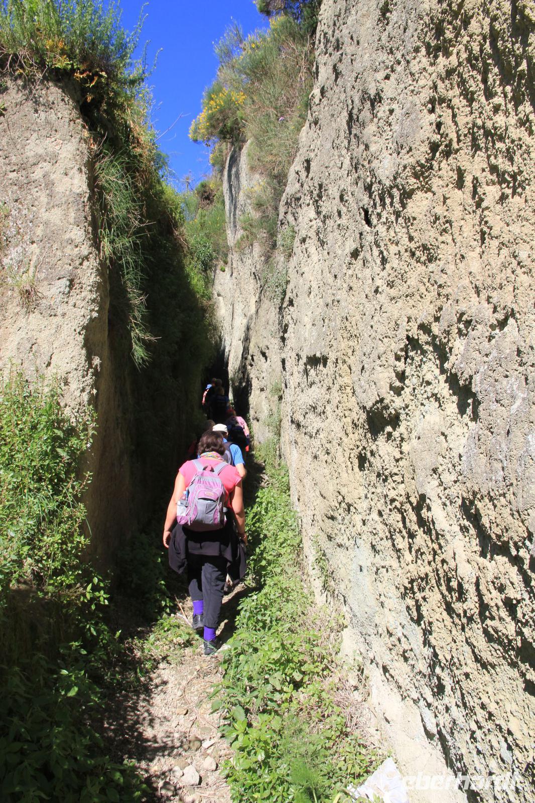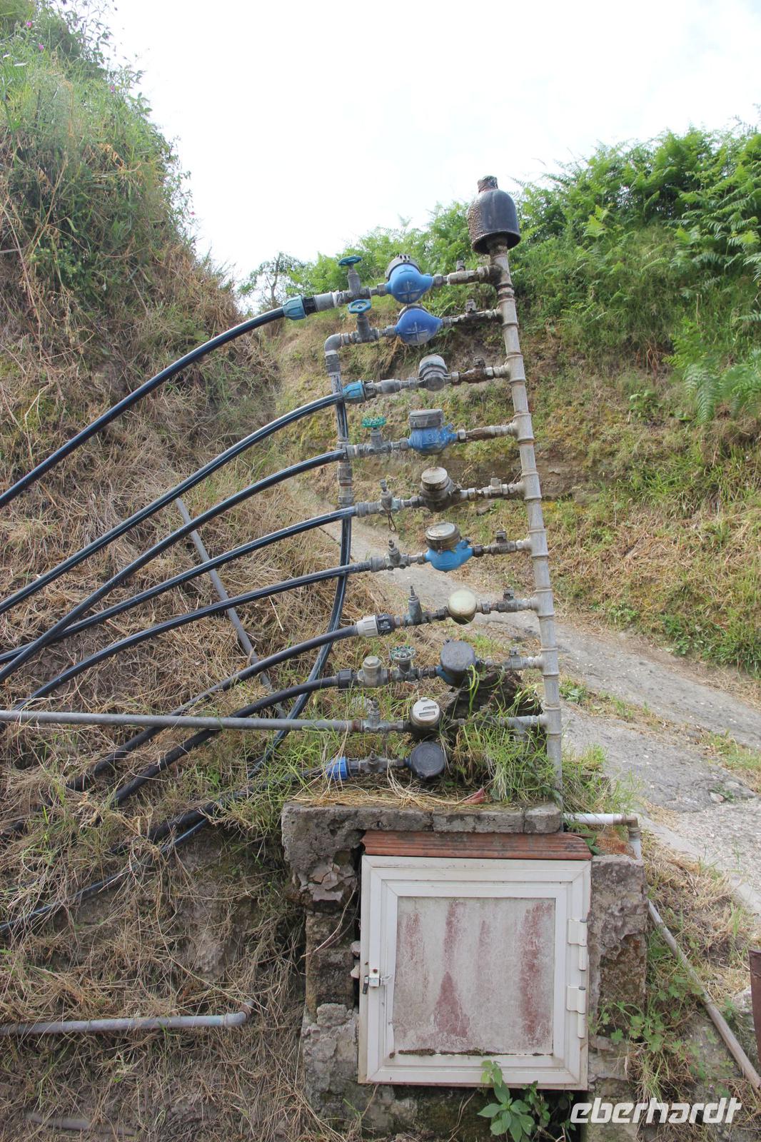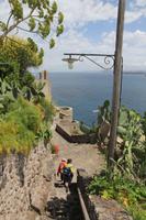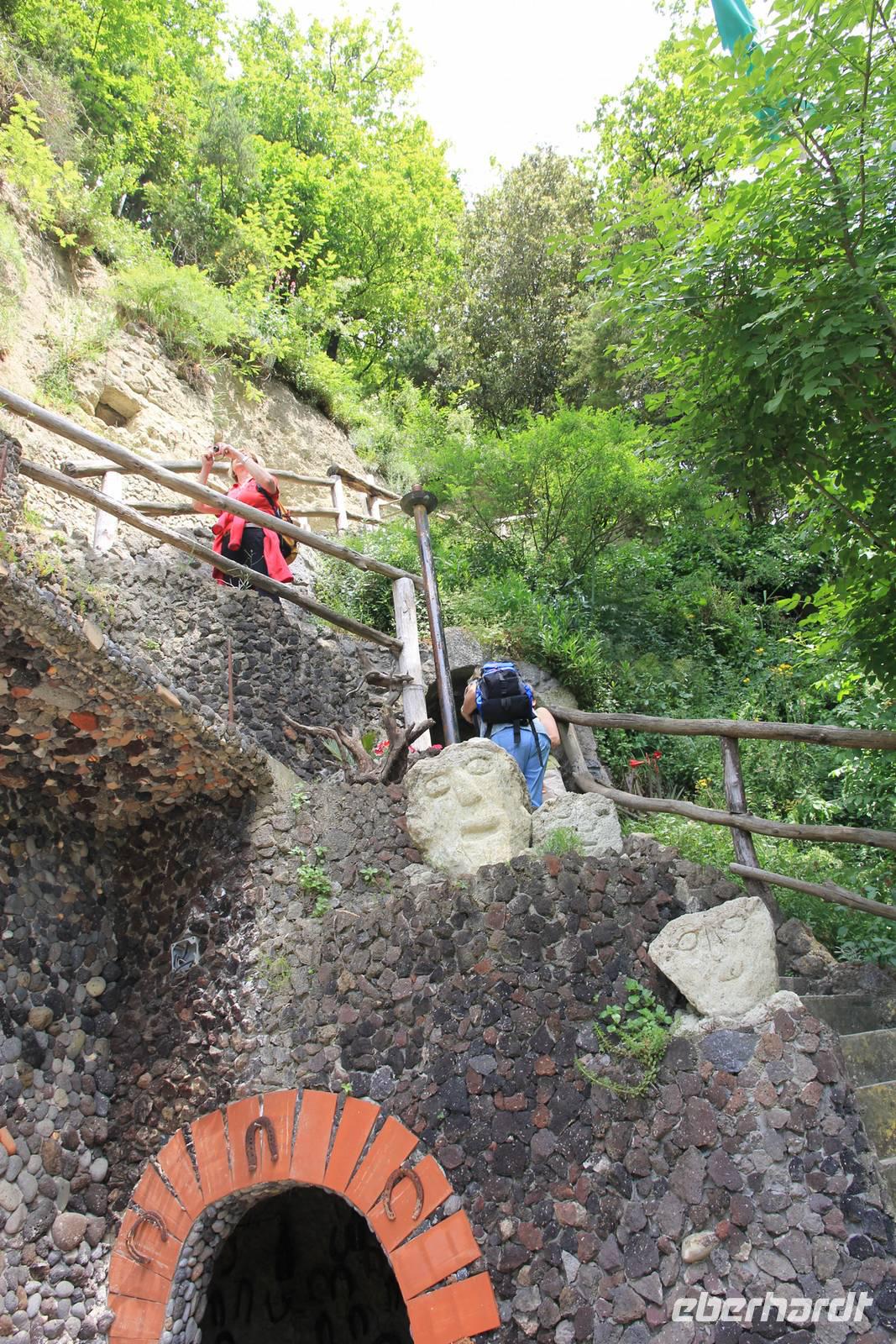 Zwischen Barano d"Ischia und Buonopane entspringt in einem grünen und engen Tal die Heilquelle Nitrodi, die Linderung den Hautkranken, Schönheit den Unschönen und Klugheit den Unklugen verspricht. Wir lassen hier das Wasser über und in unsere Körper rieseln und warten dann in der Sonne auf das erhoffte Ergebnis. Mit einem gestärkten Selbstbild steigen wir in den höher gelegenen Ort Buonopane auf und von dort geht es weiter auf einem eher leichten Panoramaweg in ca. 350 Meter Höhe. Wir genießen die Ausblicke auf den Vesuv, die Inseln Procida und Capri und fotografieren uns vor der Madonnenstatue, die diesen Teil der Insel segnet. Durch Gärten und Obstplantagen schlängeln wir uns unter dem Monte Tripodi in Richtung Norden und steigend dann in die Ortschaft Faiano ab. Bei einer Pause unterwegs versickern drei Liter ischitanischen Rot- und Weißweins in unserem Verdauungssystem.