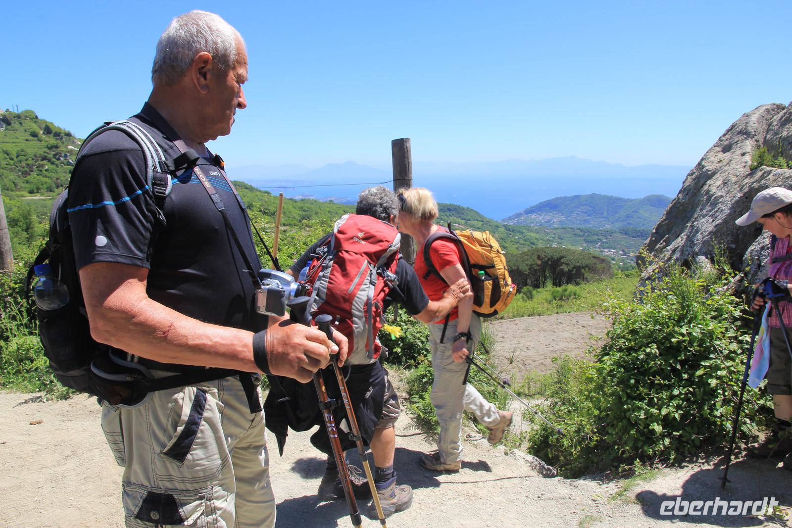 Der morgendliche Regen verschwindet Gott sei Dank, als wir in unseren Bus zum Ausgangspunkt unserer Wanderung in Vateliero einsteigen; von ihm bleibt uns für den ganzen Tag noch schwülwarme Luft erhalten, die die Sonne kaum durchdringen kann. Zuerst geht es gemächlich auf Wegen durch Gemüse- und Obstgärten bis zur Kirche Madonna di Montevergine, dann aber steil ansteigend auf den Monte di Vezzi auf 395m. Unterwegs haben wir atemberaubende Blicke auf die senkrecht vor uns abfallende Steilküste, auf die Halbinsel S. Pancrazio und in der Ferne auf Capri. Vom Gipfel genießen wir das Panorama auf das Inselinnere zwischen S. Angelo im Westen und Ischia Porto im Osten. In den Weinbergen von Piano Liguori kehren wir zuerst zum Mittagsimbiss auf der Terrasse des Restaurants „Da Maria e Giuseppe" ein. Wir werden schnell, freundlich und reichlich mit Bruschetta, Salat, Wurst und Käse und natürlich Wein versorgt- das meiste aus eigener Herstellung. Dann steigen wir durch die Weinberge weiter ab, bis wir im Weingut „O"Sole mio" einkehren. Francesco, der Weinbauer und hiesige Caruso, begrüßt uns mit genau diesem Lied. Für eine unserer blonden und blauäugigen Damen singt er noch ein Liebeslied. Die Gastfreundschaft und die urige Atmosphäre halten uns noch eine Weile gefangen, bevor wir berauscht auf die letzte Etappe unserer heutigen Wanderung gehen, die uns nach Campagnano führt. Dort verabschieden wir uns herzlich von unserer heutigen Wanderführerin Martina, die unsere Erlebnisse und Eindrücke mit Ihrem Wissen sehr bereichert hat, und steigen in unseren Bus, der uns zum Hotel zurück bringt.
