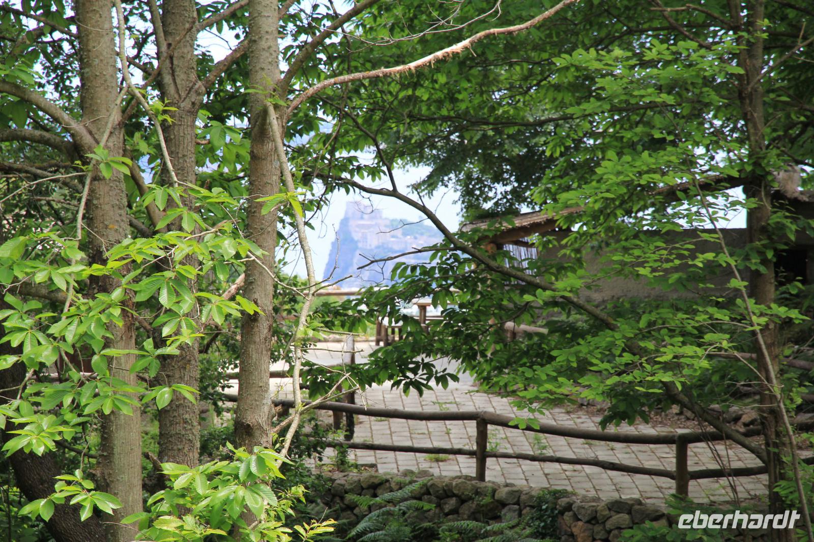 Endlich haben wir eine richtiges Tages- bzw. Leistungsziel: die Besteigung des Monte Epomeo (787m). Unser Kleinbus bringt uns bis in das Bergdorf Calimera. Von da aus geht es steil und durch eine Tuffstein-Klamm hinauf zum Panorama-Weg, der seinen Namen aufgrund seiner wundervollen Blicke auf die Westseite von Ischia zu Recht trägt. Das Wetter erlaubt uns ein seltene Fernsicht, die bis zu den uns bisher unbekannten Inseln Santo Stefano - eine ehemalige Gefängnisinsel - und Ventotene reicht. Um einer langsam aufsteigenden Wandergruppe auszuweichen - unser Wanderleiter Biagio ist einfach zu stolz, dieser zu folgen -, steigen wir in den Falangowald hinab, um von dort einen steilen, aber schattigen Steig (unter Pinien) nach oben zum Pietra dell"Aqua zu nutzen. Auf der Hochebene streben wir dann dem imposanten Tuffsteinfelsen Monte Epomeo zu, von dem wir nun einen allseits unverstellten Rundblick genießen: auf den Vesuv, Neapel, die sorrentinische Halbinsel, auf Capri, Ischia - sogar das Cilento ist in der Ferne zu sehen. Unterhalb des Epomeo verwandeln wir ein schattiges Plätzchen unter hohen Bäumen zum Picknick-Restaurant - es wurde aber auch Zeit. Weißbrot, Wein, Schinken, Käse, Oliven und Tomaten beleben Körper und Geist und verleiten zu flotten Sprüchen. Die gute Stimmung begleitet unseren langen Abstieg bis zur Buceto-Quelle, mit deren Wasser wir unsere Flaschen auffüllen. In Cretalo nimmt uns unser Kleinbus wieder auf, um uns zum Hotel zurück zu bringen. Es bleibt Zeit für einen Kaffee in einem Strandrestaurant und das obligatorische Bad im Thermalbecken. Zum Abendessen hören wir von Michelangelo laute und stimmungsvolle neapolitanische Weisen und italienische Schlager zur roten Gitarre. Textlücken schließt er manchmal kaum merklich durch Lala und andere italienisch klingende Laute. Wir haben unseren Spaß.