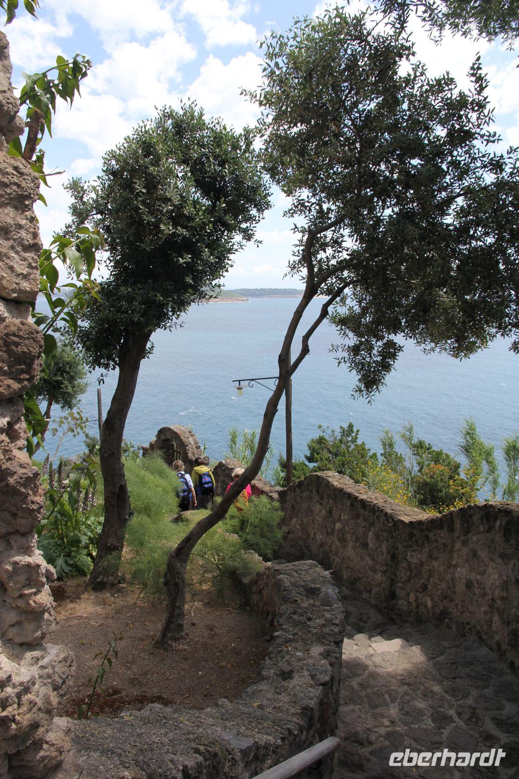Bei schönstem Sonnenschein steigen wir von der Citara-Ebene über Cuotto zum Punta Imperatore (ca. 200m) hinauf. Unser Wanderführer Biagio=Blasius, von uns „Fräulein Blase" genannt, hat es schwer, mit uns mitzuhalten. Dann geht es leicht bergab durch Campotese nach Panza und dort wieder via Treppen auf Meereshöhe hinunter in die Felsenbucht von Chiarito, um in dem vom heißen Wasser der Sorgeto-Quelle erwärmten Meerwasser zu baden. Die meisten lassen sich dieses Erlebnis nicht entgehen. Erfrischt geht es wieder bergan zu unserem Mittagsrestaurant im Hotel Belvedere, auf dessen Terrasse wir ein schmackhaftes Essen und einen wunderschönen Blick auf Sant" Angelo genießen. Wir wandern durch Gärten, die reizvoll und nicht ungefährlich für ihre Nutzer am Rande und in einer Tuffsteinspalte liegen, nach Sant Angelo hinunter. Hoch über dem Urlaubsort von Angela Merkel, vorbei an den Termen San Michele und Apollon, gelangen wir zum langgestreckten Strand von Maronti. Um nicht ziellos zu sein und in der Sonne sitzen zu müssen, streben wir weiter bis Lido die Monti. Hier warten wir vergebens auf den Linienbus. Deshalb chartern wir zwei Minibus-Taxen, die uns zum Hotel Punta Imperatore zurückbringen. Heute gehen nun fast alle ins Thermalbecken, um aufkommendem Muskelkater und anderen Schmerzen die Stirn zu bieten.