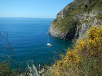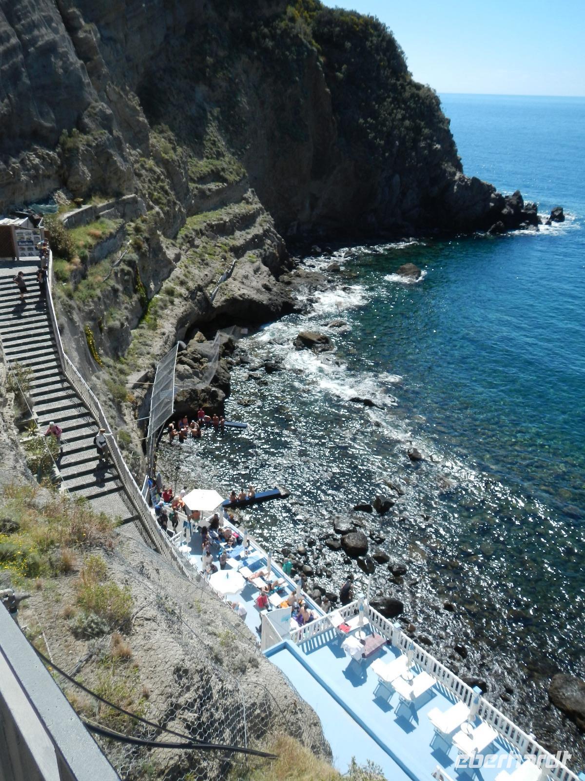 Nach dem gemütlichen Frühstück wartete bereits unser Wanderführer Livio mit seiner Hündin „Chicca" auf uns. Er trug „nur" Sandalen...hmmm! Wir waren mit Wanderrucksack und festem Schuhwerk bereit für alle Wanderwege. Unser erstes Ziel war der Leuchtturm Punta Imperatore mit einem herrlichen Blick über das Meer. Über asphaltierte , schmale Straßen liefen wir durch Bergdörfchen, bestaunten die Zitronenbäume, die blühenden Gärten und fragten uns wie hier der Autoverkehr funktioniert bis wir schließlich in die paradiesische Bucht Sorgeto abstiegen. Schnell war die Wanderkluft in Badebegleitung gewechselt und ein Platz in den Thermalquellen ergattert.
