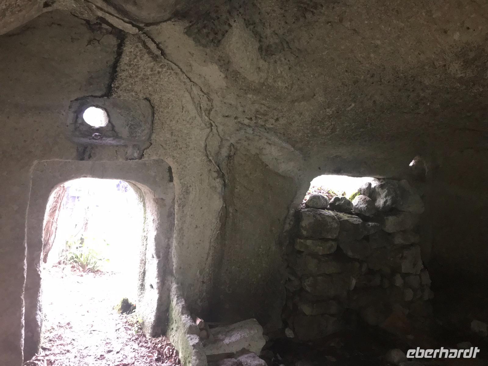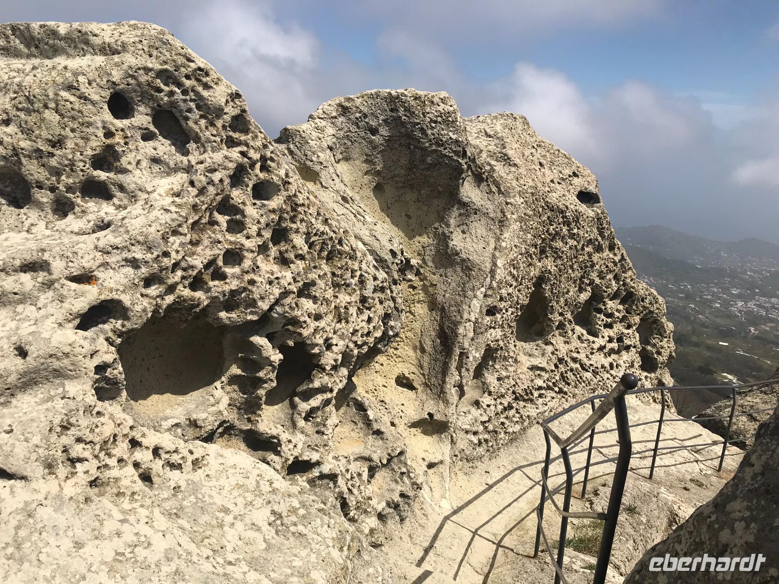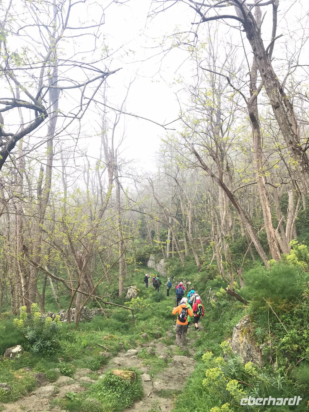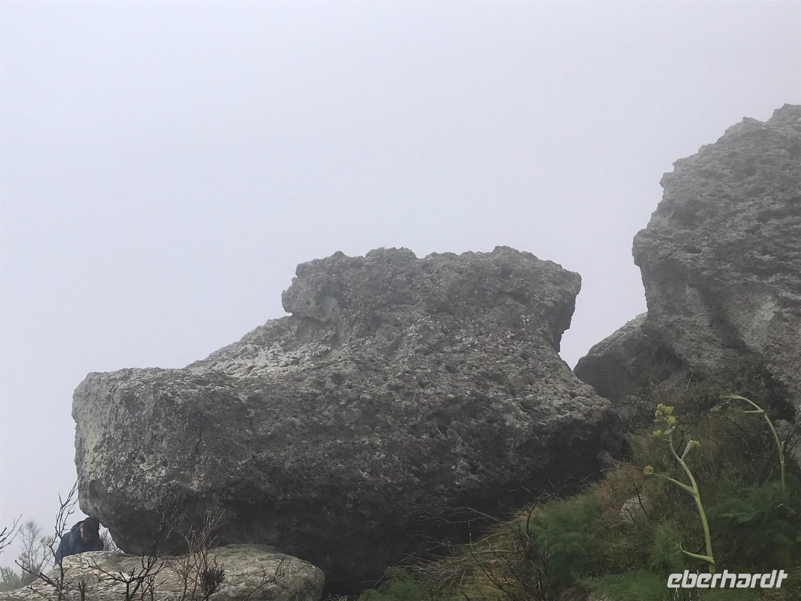 Es sollte der stimmungsvollste Tag werden. Wir starteten im Nebel und durchquerten Wälder der verschiedensten Vegetationen, bestaunten Fels- und Tuffsteinbehausungen in den Bergen, die einst als Fluchtorte vor den Piraten, den Sarazenen dienten. Auch erfuhren wir so manch wundersame Geschichten. So zogen die Frauen früher in die Berge um Kastenblätter in großen Mengen zu sammeln. Im Tal bekamen sie ein Laib Brot dafür von den Bauern. Die Blätter wurden als Einstreu für die Kühe benötigt, da in Ermangelung von Getreideanbau es auf der Insel kein Stroh gab.