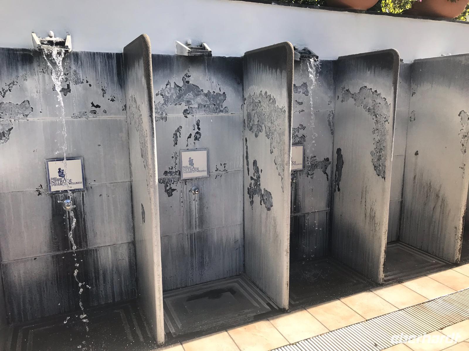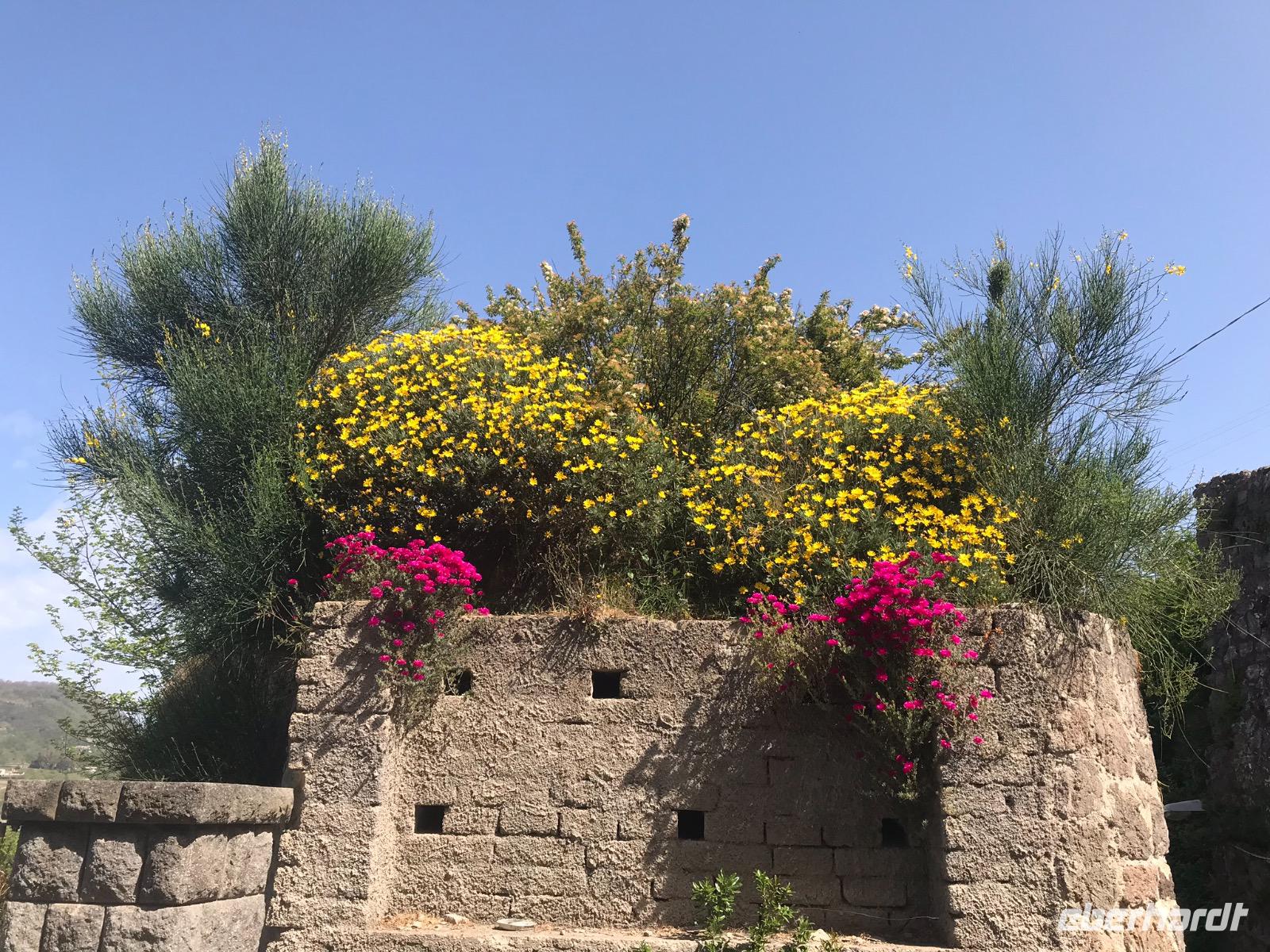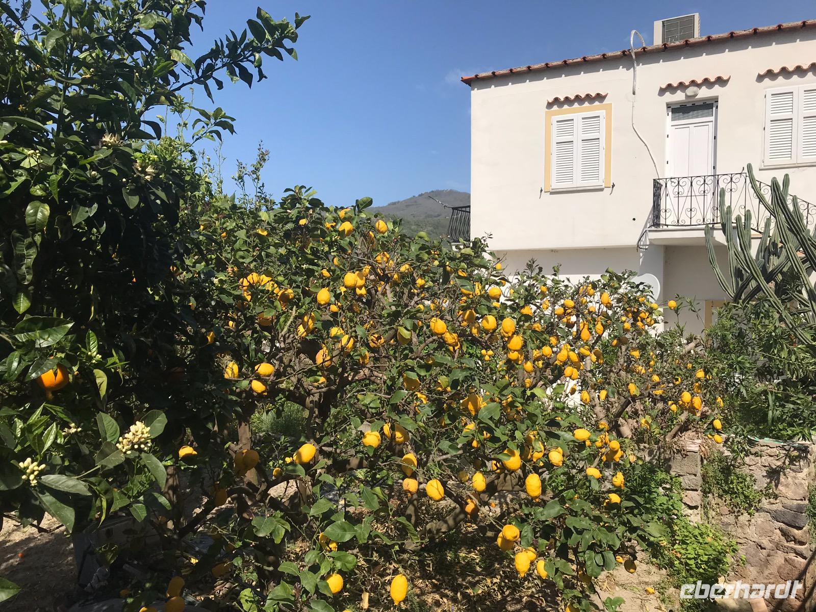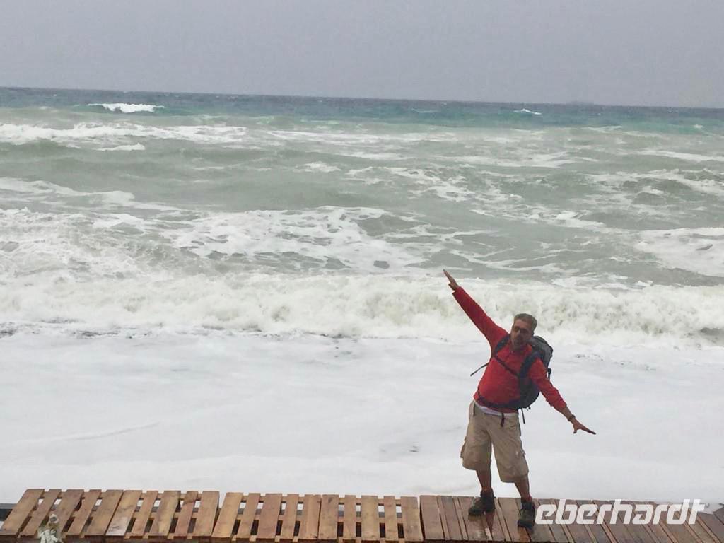 Kurz war die Busfahrt und wir starteten den Tag an der Thermalquelle Nitrodi. Die Sonne war nun unser ständiger Begleiter. Nitrodi existiert als solches schon seit der römischen Zeit und ist berühmt für seine besonders heilsame Wirkung. Ständig anwesende Ärzte untermauern die Bedeutung der Thermalquelle. Auch wir duschten reichlich und liesen es uns auf den Liegestühlen in de Sonne gut gehen. Doch dann riefen wieder die Wanderschuhe und wir wanderden parallel zur Küste am Hang entlang. Es war eine Genusstour, die Höhenmeter hielten sich in Grenzen und wir konnten noch ausserplanmäßige Programmpunkte erleben. Zwei Reisegäste waren leidenschaftliche Geocacher und ihnen gelang es, uns in den Bann ihrer Leidenschaft zu ziehen. Es war dann nicht weiter verwunderlich, dass auch die heutige Mittagsrast in einer entlegenen Hütte ein kleines Highligt darstelte. Traumhafte Blicke boten sich uns auch heute wieder beim Abstieg und am frühen Abend belohnten wir uns mit einem gemeinsamen Cocktail an der Poolbar.