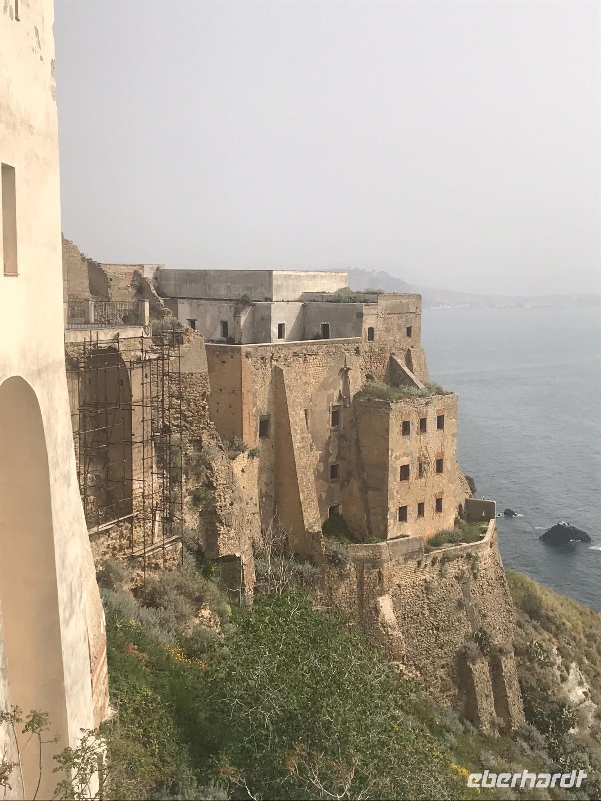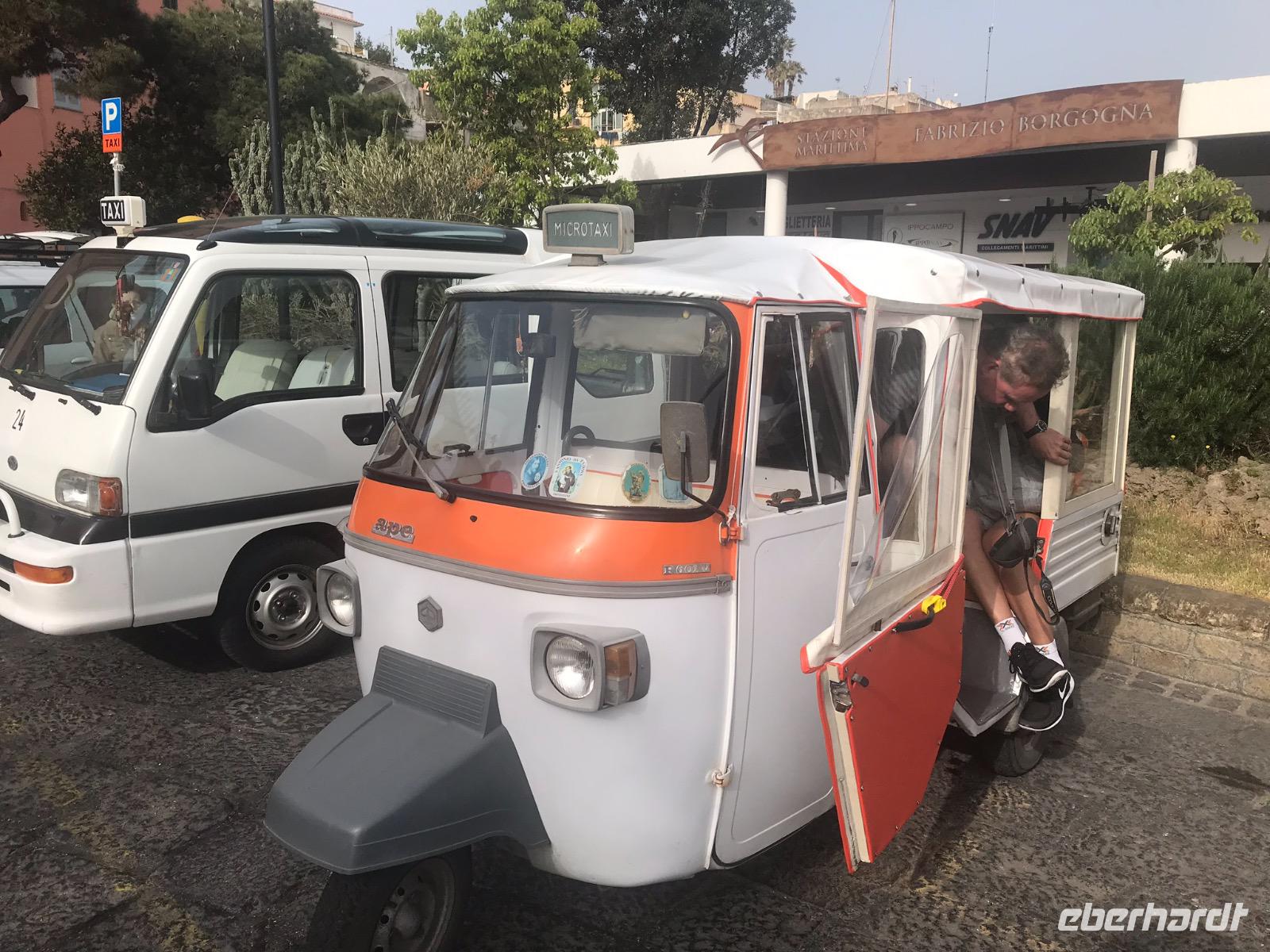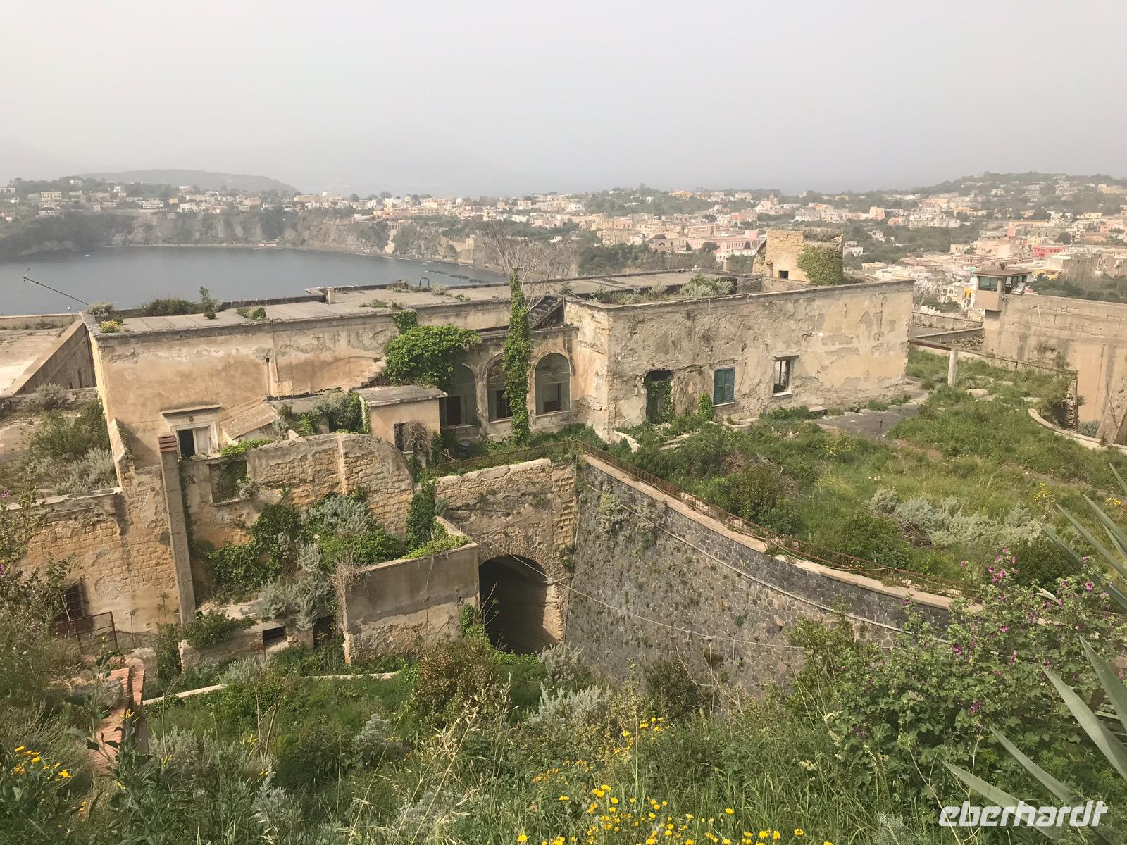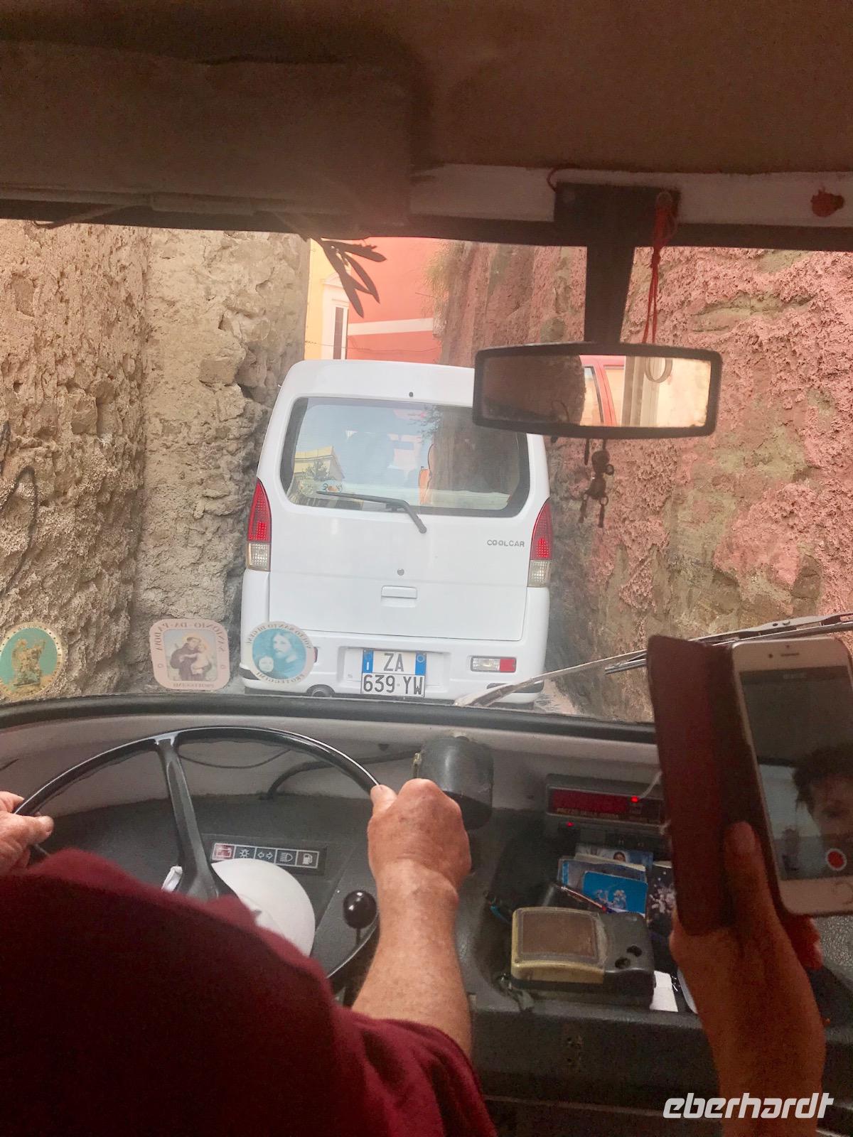 Spektakulär ist die Inselrundfahrt mit den Microtaxen, die zumeist nur mit eingeklappten Spiegeln durch die engen Gassen passen. So verwundert es nicht, dass das e-Bike in der Fatbikevariante hier das Haupfverkehrsmittel darstellt. Natürlich war für uns die Fahrt auf die Burg mit einem der 3 PS Mobile eines der Highligts des Tages. Dort besuchten wir die Abtei Abbazia San Michele Arcangelo und konnten anschließend einen Blick auf das ehemalige Gefängis werfen, dass sich von 1830 bis 1988 hier im ehemaligen Palast auf der Terra Murata befand.