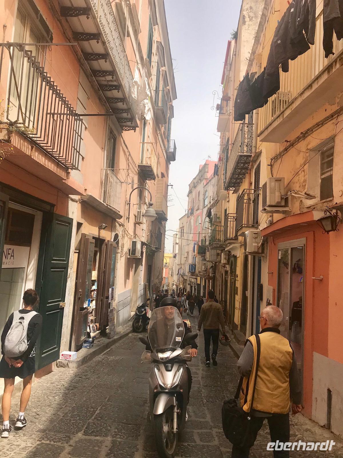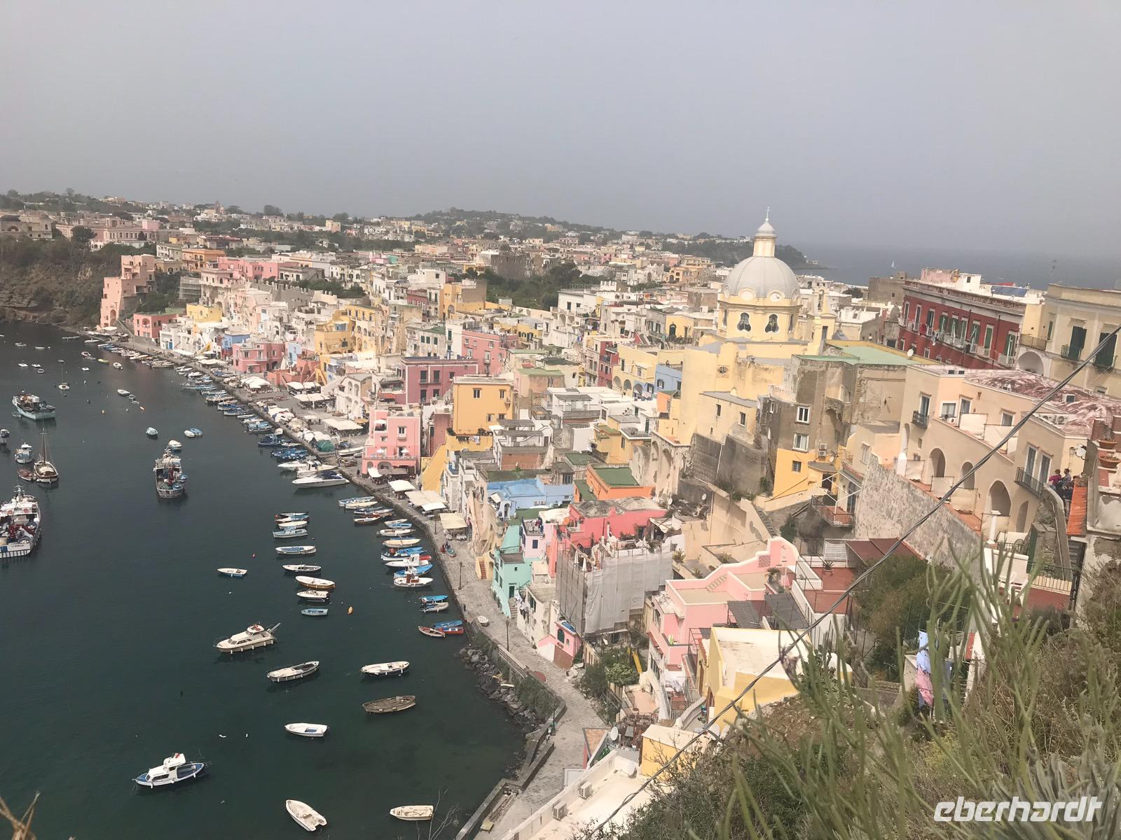 Das Frühstück wurde vor verlegt und so waren wir bereits kurz vor 9:00 Uhr auf der kleinen Nachbarinsel. 10.500 Menschen leben hier auf 4,2 qkm und das stellt mit die größte Bevölkerungsdichte Italiens dar. Berühmt ist Procida für die Karfreitagsprozession, zu der auch viele ehemaligen Bewohner auf die Insel zurückkehren und die mit einem gemeinsamen Mahl endet, zu dem alle Besucher mit eingeladen werden.