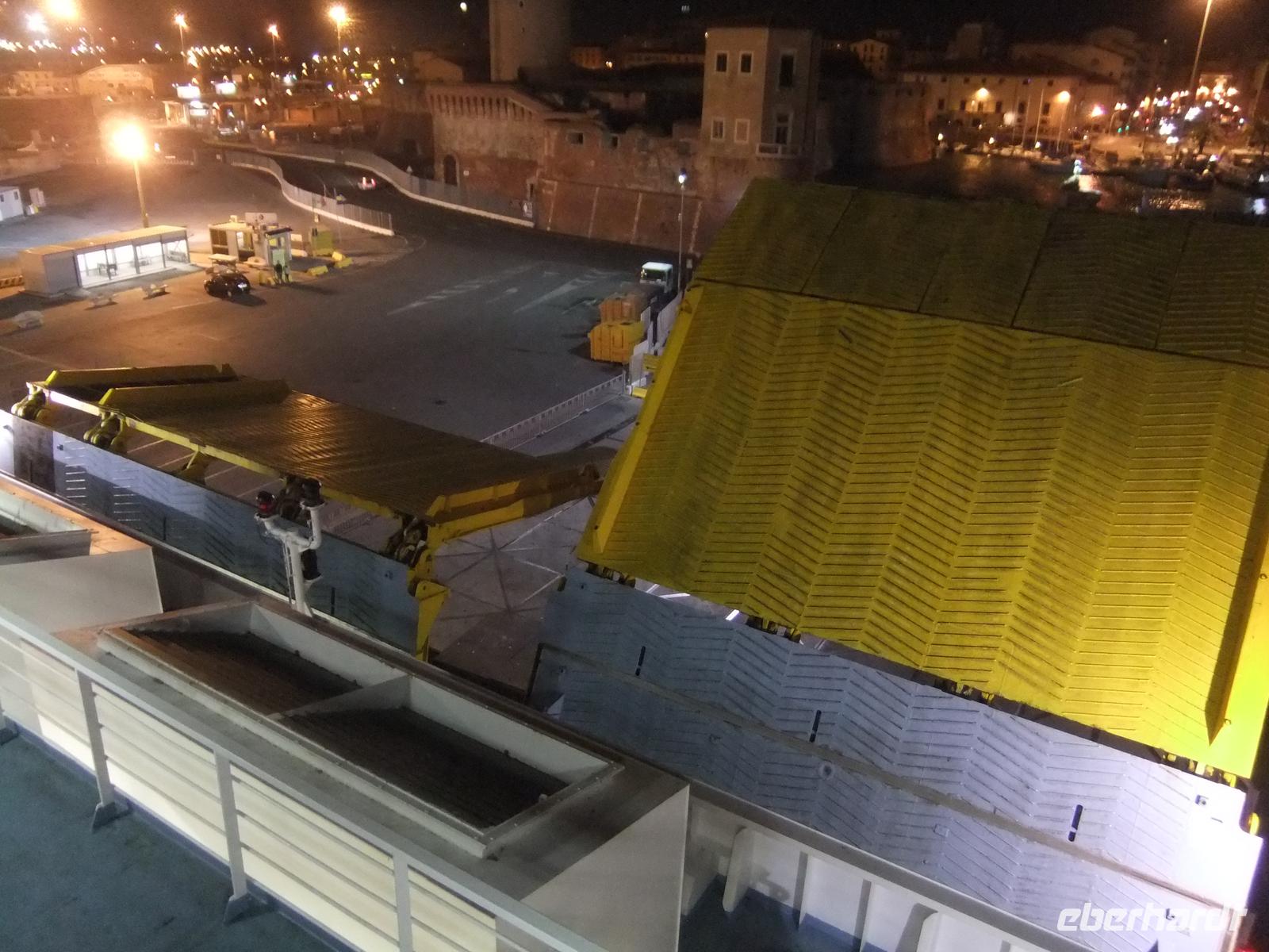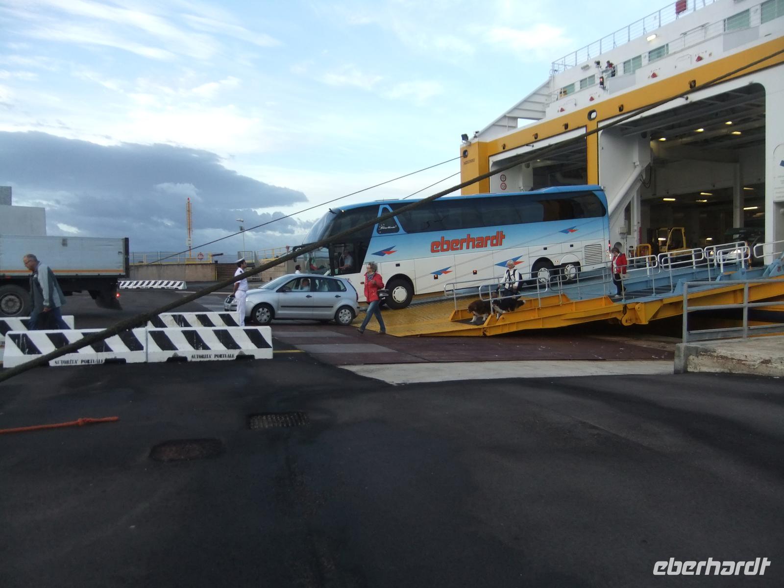 Die Landschaften wechseln sich ab und sind sehr unterschiedlich. Südtirol zeigt sich mit seinen prächtigen Bauernhäusern mit hölzernen Balkongalerien zwischen den hohen Wänden des Eisacktales, in der Fluss, Straße und Autobahn kaum Platz und die Eisenbahn unter die Erde verdrängt haben. Das Trentino ist so ganz italienisch mit seinen Steinhäusern und den flachen, mit Röhrenziegeln gedeckten Dächern. DIe Po-Tiefebene ist fast baumlos, auf großen Flächen wir vor allem auch Reis angebaut und von den einzeln und einsam liegenden Bauernhöfen ist sind nicht wenige verwaist und verfallen. Das Appeninengebirge ist meist bewaldet, die Autobahn wir durch Tunnelröhren und über Viadukte geleitet und es wird weiter gebaut. Die Hügellandschaft der Toskana führt dann zu Schwemmlandzone, in der Pisa liegt. Die riesige Taufkapelle, der Dom und der Schiefe Turm sind gut zu sehen. Pisa war der Hafen der Medicis aus Florenz, bis der Arno ihn versanden ließ. Die Medicis waren gezwungen einen neuen Hafen zu bauen, mitten im malariaverseuchten Gebiet. Zur Sicherung entstand eine mächtige Festung, aber kaum eine Stadt. Erst später entstand das heutige Livorno mit seinen riesigen Hafenanlagen für Massengutfrachter, Kreuzfahrtschiffe und Fähren und weiten Lagerflächen für Container und Erdöl. Livorno überstand die fast totale Zerstörung im 2. Weltkrieg. Wir gehen durch die Stadt innerhalb der ehemaligen Stadtbefestigung. Es ist schon eine kleine List dabei, dass wir erst das „kleine Venedig" zwischen der alten und der neuen Festung sehen, eher wir auf die prächtige Hauptstraße mit ihren Arkaden und ihren prächtigen Geschäften einbiegen. Ein Abendessen am Dom und schon ist die Zeit gekommen, die Fähre per langer Rolltreppe zu betreten. Für manche ist es die erste Nacht auf einem großen Schiff. Es war sicher ein kleines bisschen Herzklopfen dabei, aber das Schiff hat sich trotz nicht gerade geringem Wellengang achtbar geschlagen und in den Schlaf gewiegt.