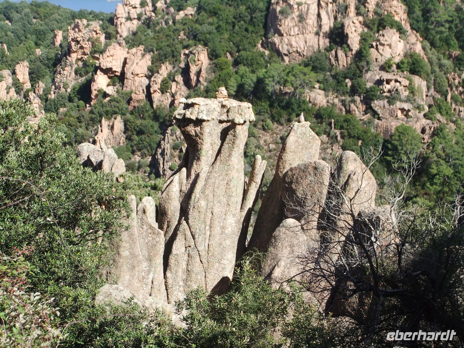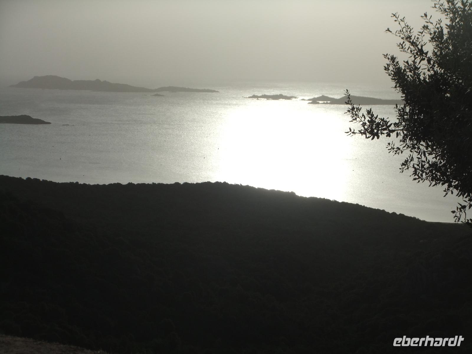 Weiter geht es durch eine wilde Felsenlandschaft, in der sich die immergrünen Gewächse der Macchia mit den gelbroten Granitfelsen mischen und im Kontrast zum sehr blauen Meer steht, dass eine völlig zerfressene Küstenlinie mit vielen Buchten bildet. Mare i Monti - Meer und Berge. Am frühen Abend erreichen war das Campo d'Oro, die Ebene vor Ajaccio