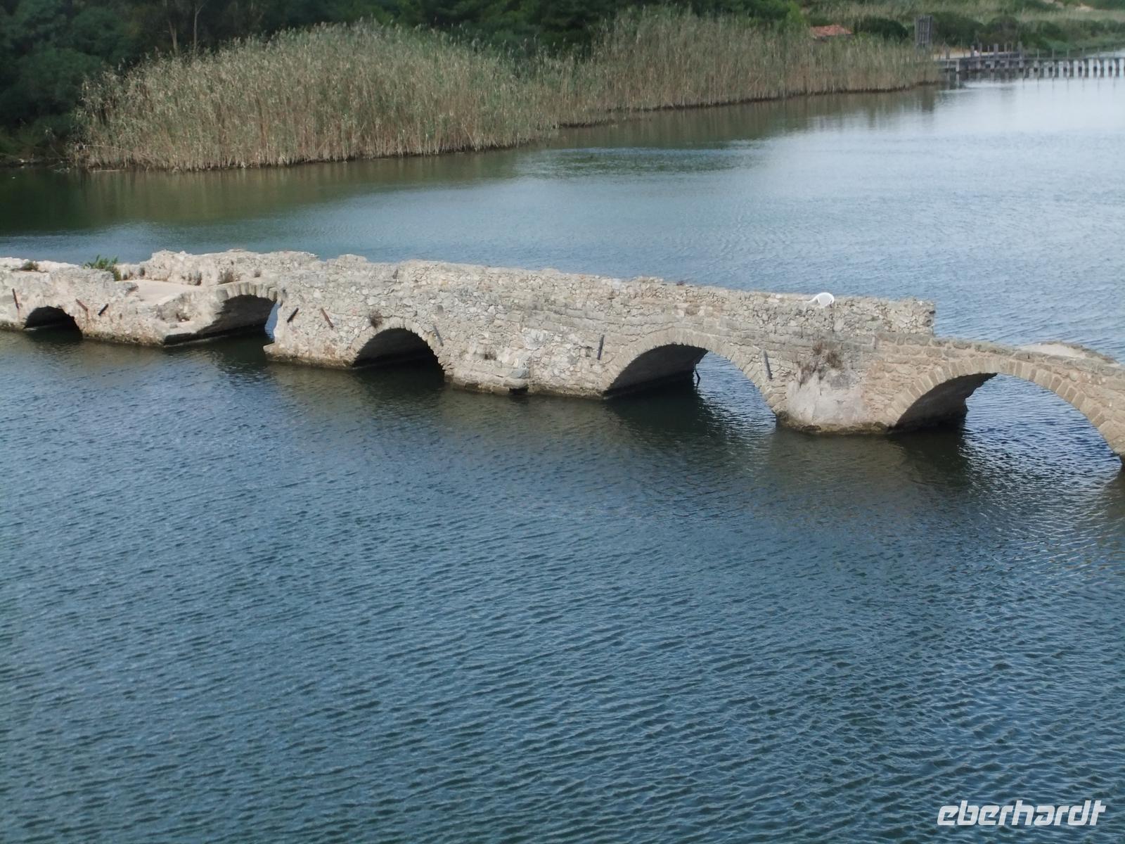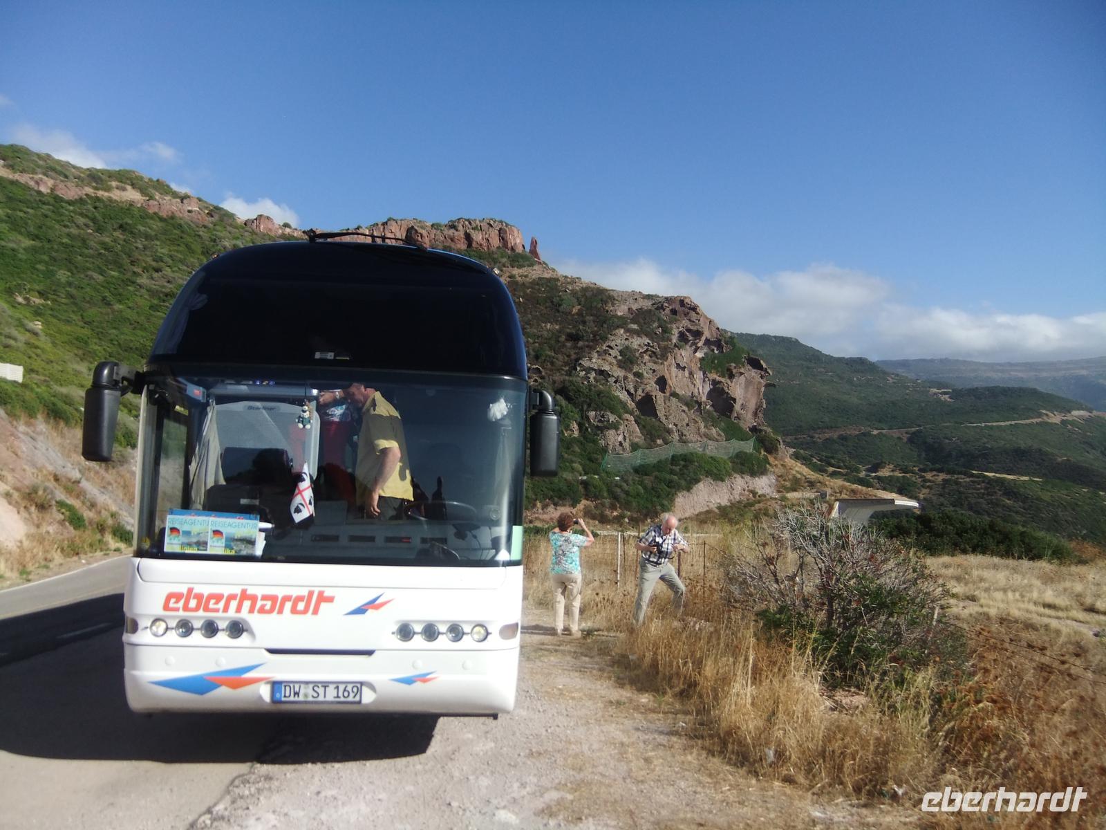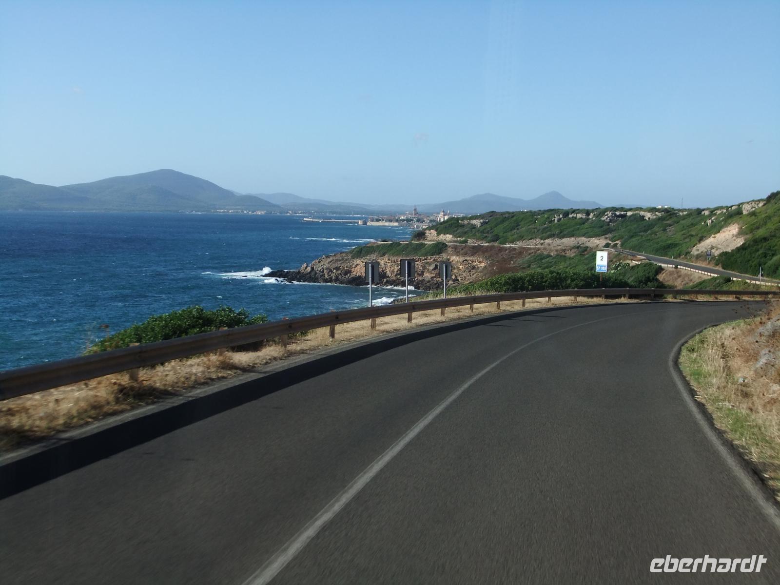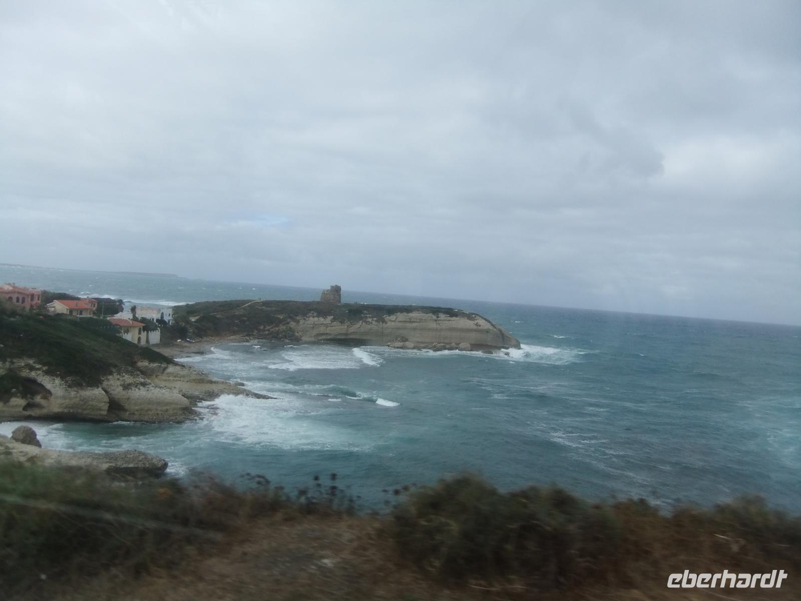 Durch eine Palmenallee, vorbei an Sandstränden und Weinfeldern geht es auf die Macchialandchaft der Landzunge hinaus. Bei Fertilia, der Retortenstadt aus der Mussolinizeit, liegt eine Brücke aus der Römerzeit in einer Bucht, ihre Reste jedenfalls. Der Bus hält kurz an der Nuraghenstadt Palma Vera, in der Studenten Ausgrabungen an den Resten der Steinhütten vornehmen. Die Straße führt an der kreisrunden Bucht von Porto Conte vorbei, Spanische Wachtürme stehen an der Küste. Eine herrliche Landschaft.