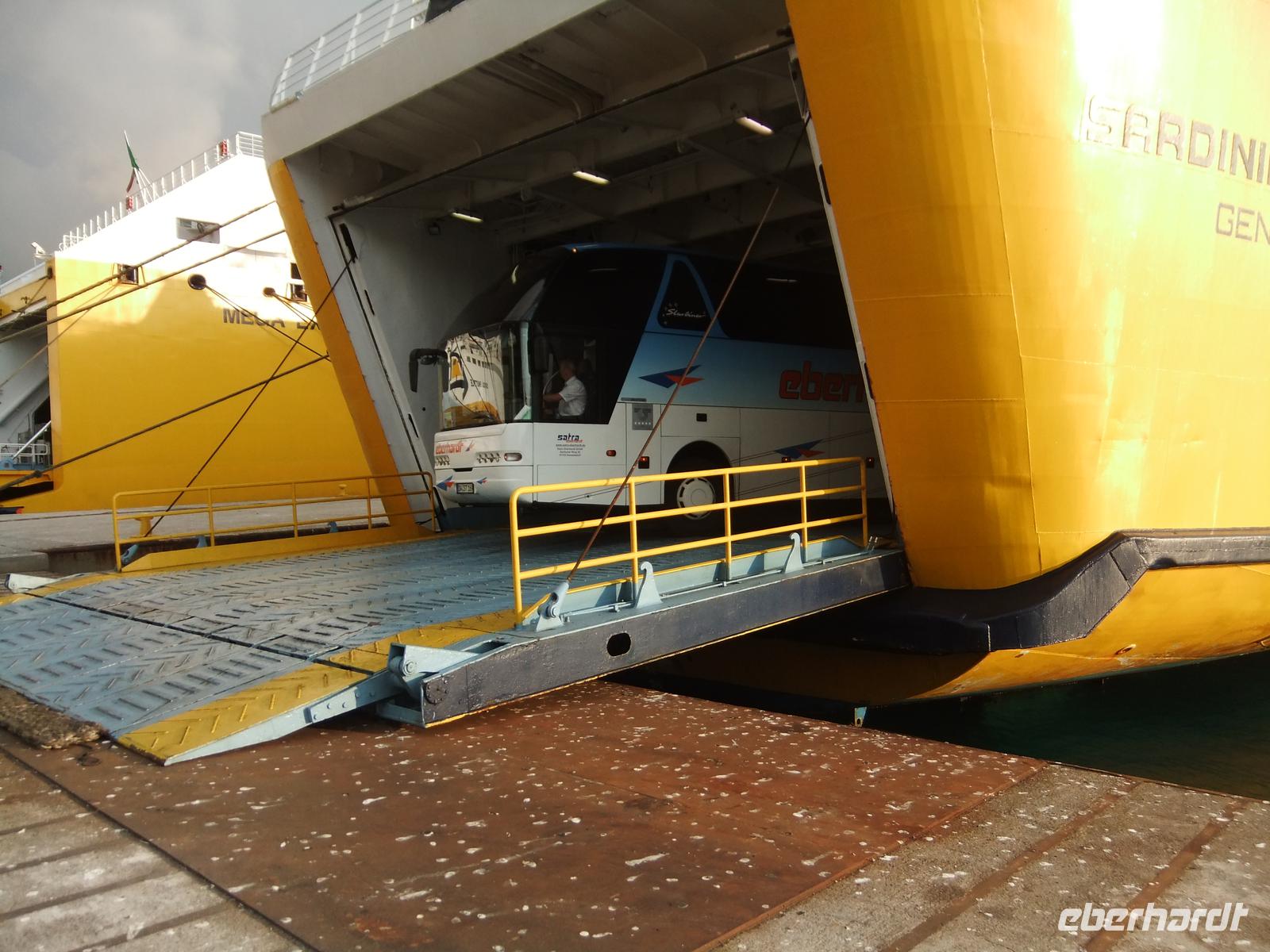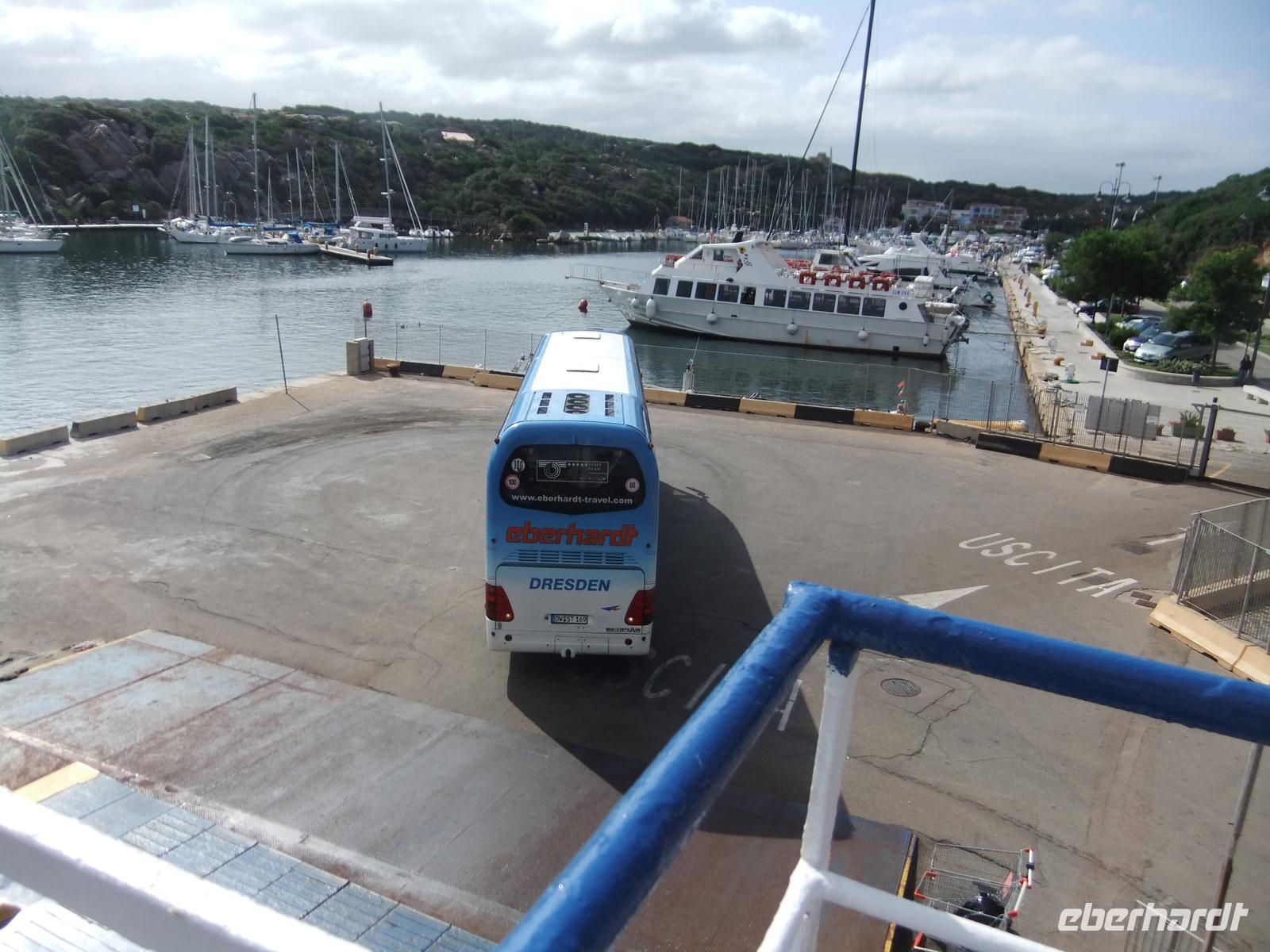 Wir nutzen dann eben den den Touristenbus Trottolo. Auf dem Oberdeck weht der Wind auch kräftig, hoffentlich fährt die Fähre morgen. Denn in dem 12 km breiten Spalt zwischen Sardinien und Korsika bauen sich bei Westwind oft starke Strömungen auf.