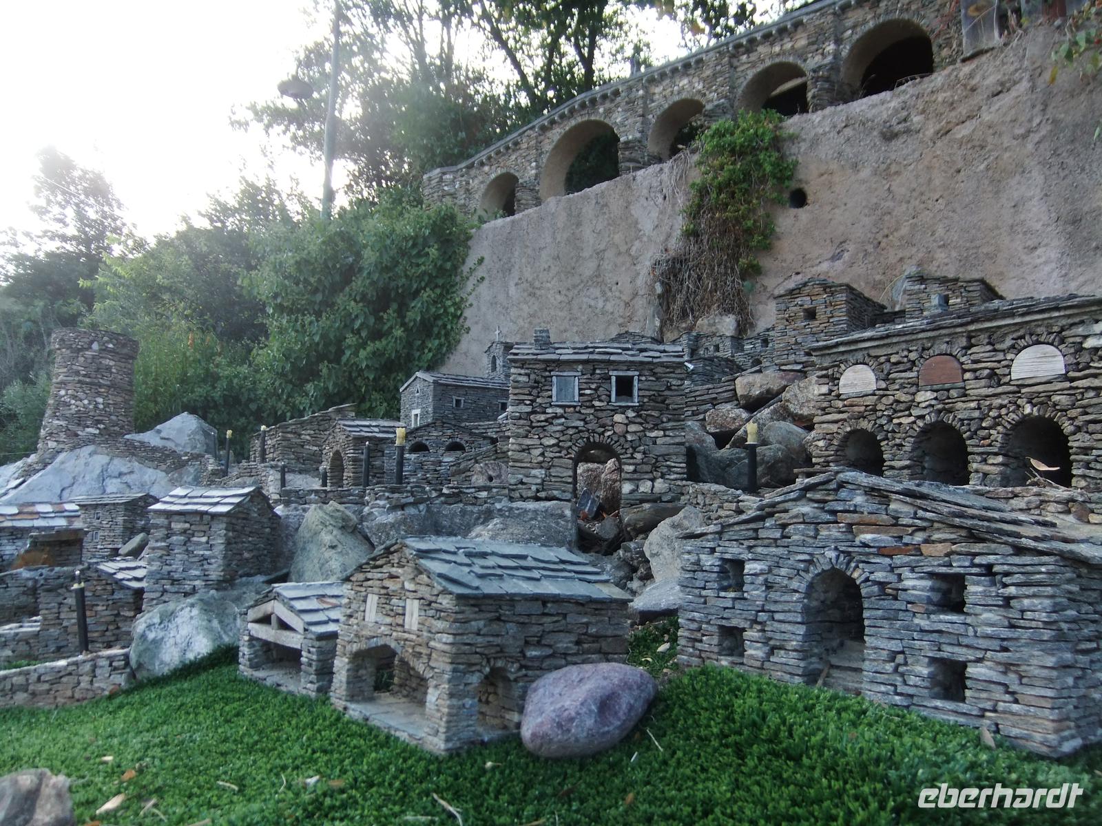 Wir fahren über Bastia (auch hier wieder eine genuesische Zitadelle) und dem im 2. Weltkrieg schwer umkämpften Col de Teghime nach St.-Florent. Für die Gäste ist es einen kleinen Spaziergang im „St.-Tropez Korsikas" wert, während der Bus mit allerlei Lebensmittel beladen wird. Dann genießen wir wieder Berge und Meer von der Uferstraße an der Westküste des langgestreckten Cap Corse aus. Immer wieder tauchen die steinernen Wachtürme auf, die die Genuesen zum Schutz der Insel als Frühwarnsystem installiert haben. Auch die kleinen Orte zeigen oft Häuser, die wie Festungen mit Zinnenkranz gebaut sind. Das Cap Corse besteht aus Schiefergestein unterschiedlicher Färbung, die schweren Schieferplatten bilden oft das Dach der Steinhäuser. Die Straße folgt dem Küstenverlauf, windet sich um kleine Buchten, die Marinas der höhergelegenen Orte, herum und muss aber auch oft auf den Berg hinauf ausweichen. Kurz vor der Spitze des Kaps steigt die Straße noch einmal an, hinauf zum 355 m hohen Col de Serra. Hier standen früher Getreidemühlen, eine davon ist rekonstruiert. Heute sind es 20 Windräder, die Strom für Bastia erzeugen. Sie drehen sich heute nicht, es ist fast windstill, gut für das Picknic-Essen und die kommende Überfahrt. Auf eine Mauer wird das traditionelle Eberhardt- -Buffet durch fleißige Helferinnen aufgebaut: Würste vom Schwein, Wildschwein und Esel und Schinken werden geschnitten, würziger Schafs- und Ziegenkäse geteilt, Baguette in Stücke gebrochen, Cornichons verteilt und der Weinkanister in Zapfstellung gebracht.