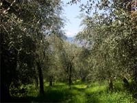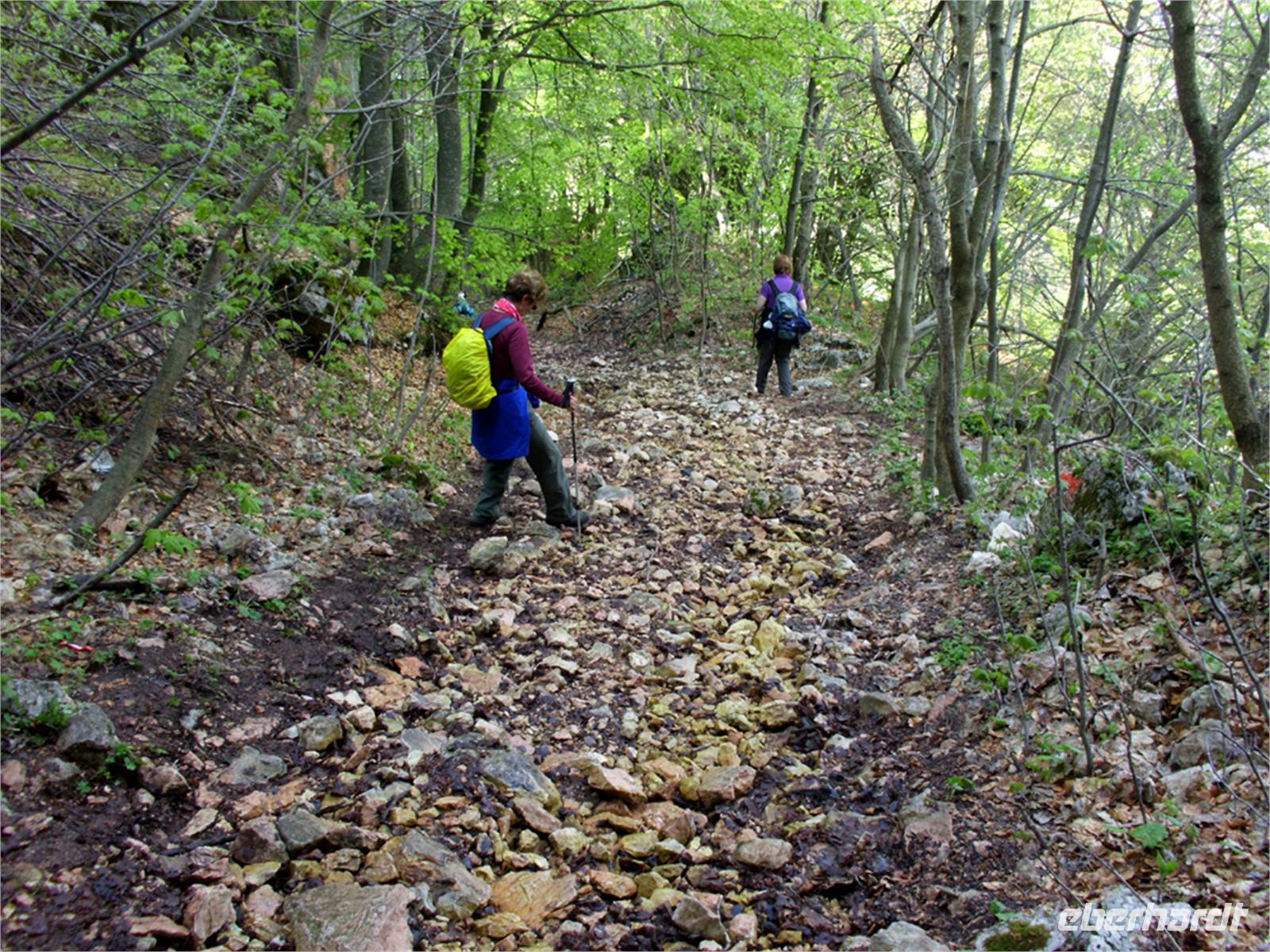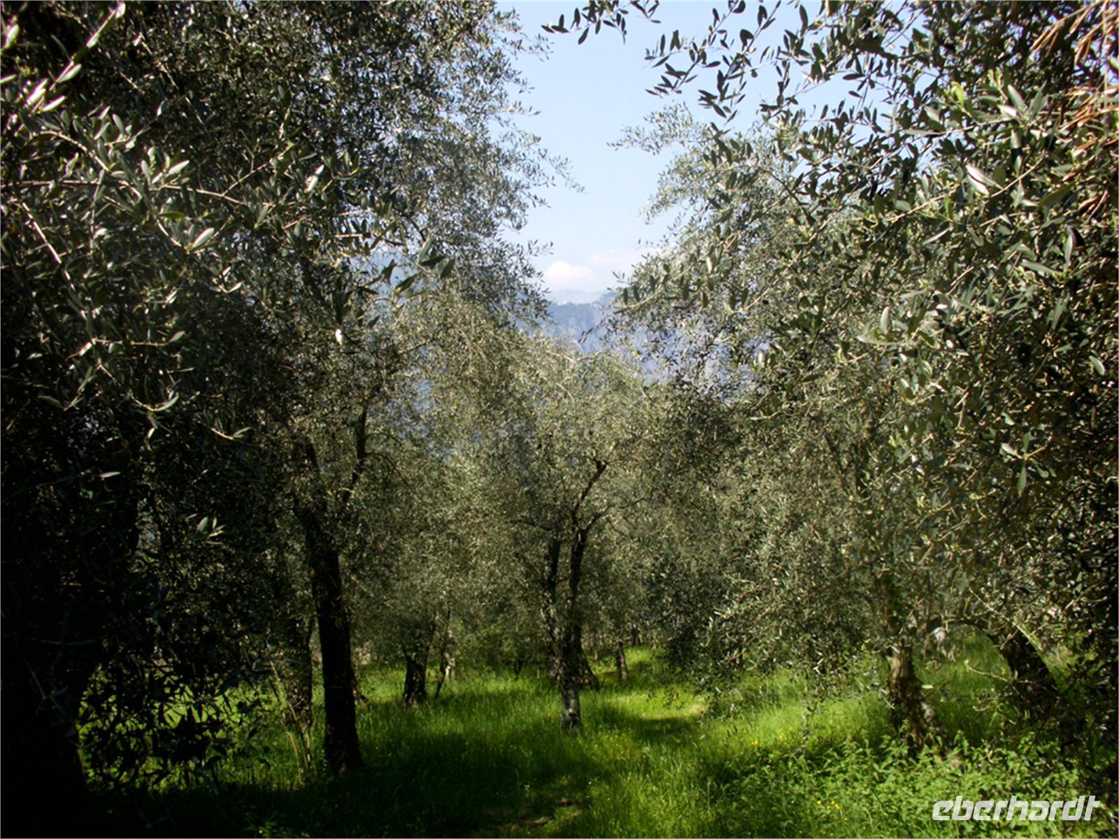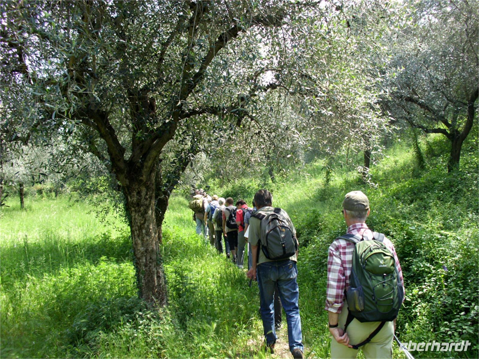 Am Ende der Ortschaft wird rechts abgebogen und es geht zunächst gut gesplittete Wege hinauf. Nach kurzer Zeit der gemäßigten Steigung geht es über mal steinige, mal erdige Wege meist zwischen Trockenmauern, Oliven sowie baumbestandenen Wiesen hindurch mal leicht bergan, dann mal leicht bergab; oft auch eben. Häufig sind hier die Maronenbäume.