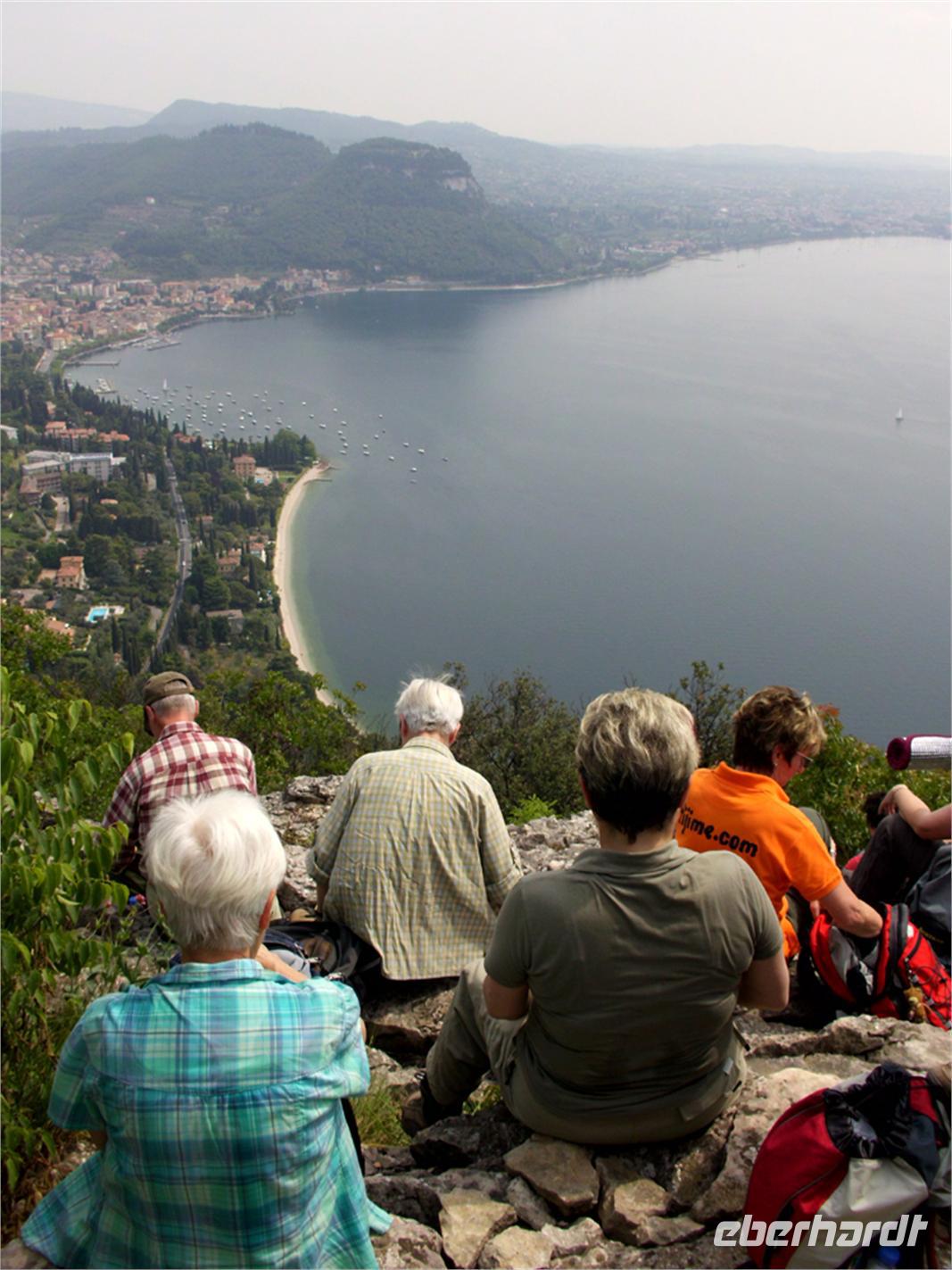 Die Mittagspause mit den von EHT organisierten Lunchpaketen wird von einer überwältigenden Aussicht auf Bardolino du der Rocca del Garda gekrönt. Auch die seltene Schmetterlingsart des Schwalbenschwanzes gibt sich ein Stelldichein. Danach noch ein kurzer Aufstieg bis zum Gipfelgrat und wieder bergab.