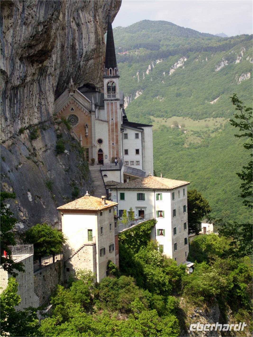 Der Tag ist noch jung und wir begeben uns nach Spiazzi. Von dort aus gehen wir zur Wallfahrtskirche Santa Maria della Corona. Die Kirche hängt wie ein Schwalbennest in über 800 m Höhe über dem Tal der Etsch. Zwei der Kirchenwände sind der pure Fels. Es bietet sich ein tiefer Blick in das Tal der Etsch unter uns.