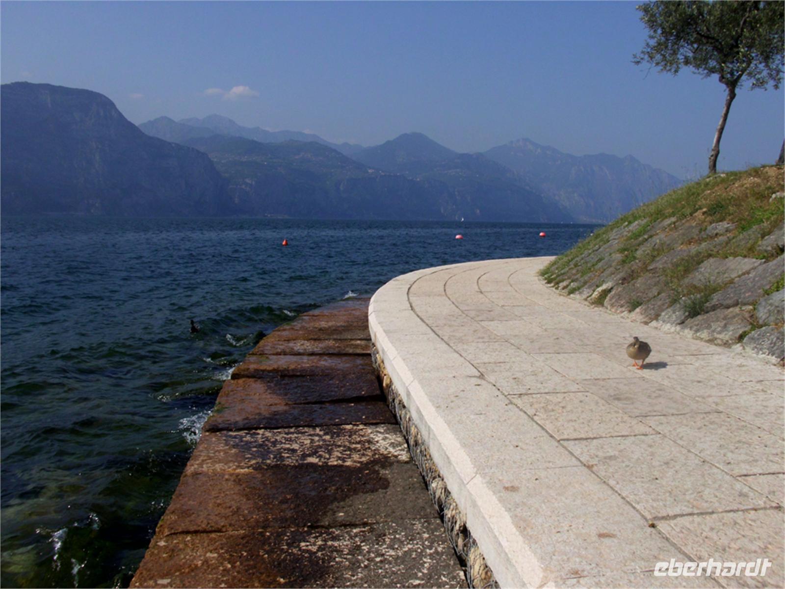 Nach dem Frühstück grüßt uns der Monte Napoleone vom gegenüber liegenden Seeufer. Unser erste Ziel ist jedoch die Rocca del Garda, eine Felskuppe, auf der die Reste einer westgotischen Burganlage liegen.