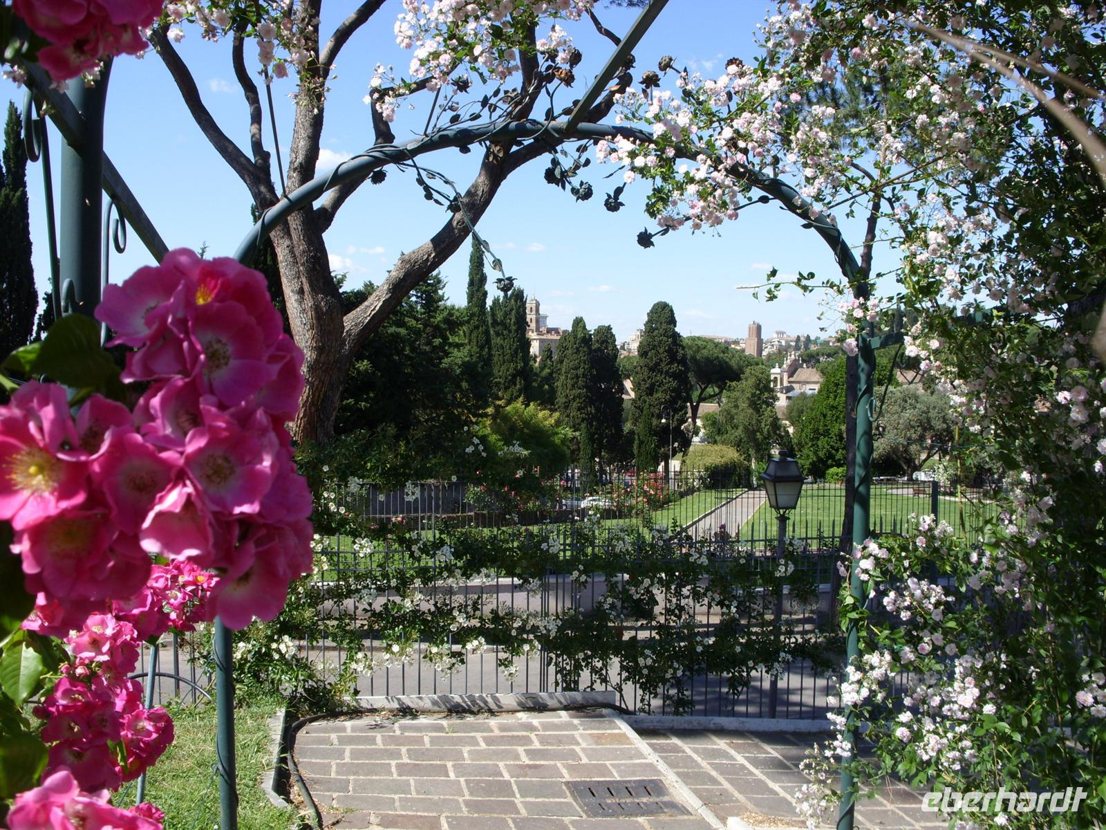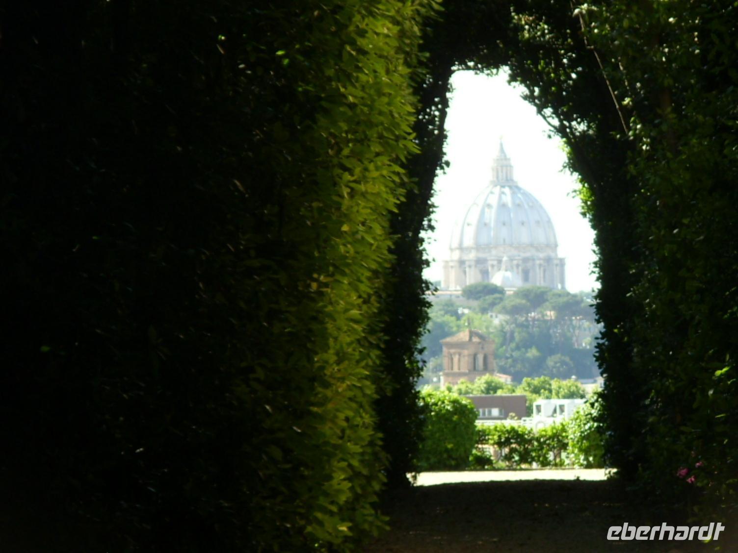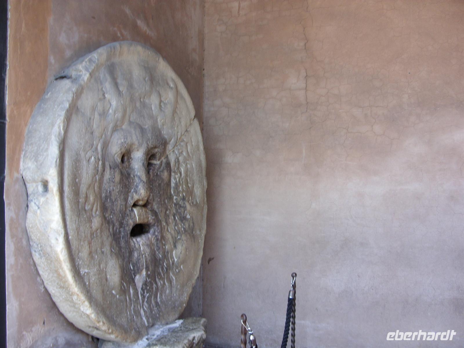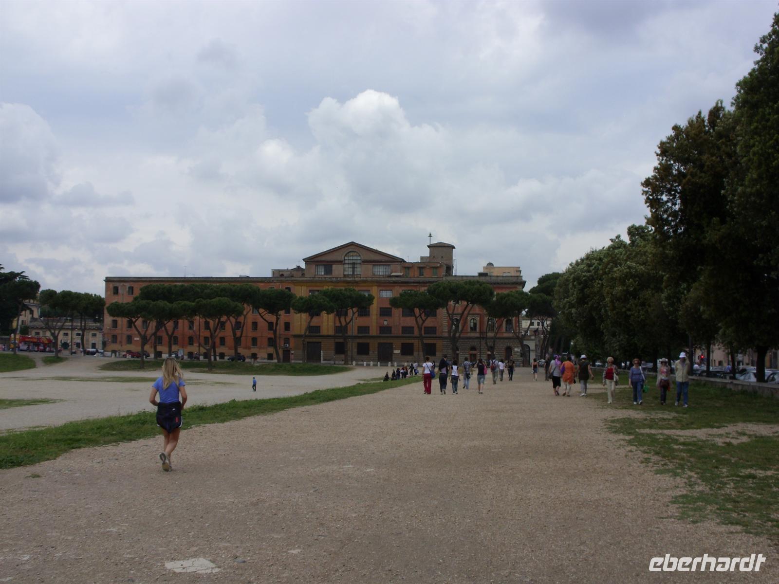 Doch da wir allesamt noch nicht müde waren, trafen wir uns um 15 Uhr am Fusse der Treppen des Kapitols erneut und gingen auf "Wanderschaft" zum Aventinhügel. Dabei passierten wir zunächst das Marcellustheater und visierten die Synagoge im einstigen jüdischen Ghetto von Rom an. Diese ist jedoch aus Sicherheitsgründen leider nur noch im Rahmen einer Zeromonie oder einer Führung zu besichtigen. Weiter führte uns der Weg zur Kirche Santa Maria in Cosmedin, wo wir uns den Mund der Wahrheit durch die Gitterstäbe anschauten. Genau davor gab es nämlich eine lange Schlange von Besuchern, die unbedingt versuchen wollten ihre Hand in den Mund zu stecken - der Überlieferung nach soll dieser zubeißen wenn man lügt. Gleich hinter dieser Kirche erreichten wir erneut den Circus Massimo. Dort erwartete uns dann ein kleines Schmuckstück - der kommunale Rosengarten, einst auf dem Gelände eines jüdischen Friedhofs angelegt, hatte seine Tore für uns geöffnet. Sogleich umwehte uns ein herrlicher Duft der etwa 1100 Rosenarten. Besonders lohnenswert war auch der Palatinhügel mit den antiken Resten im Hintergrund. Gleich nach ein paar weiteren Metern erreichten wir den Orangengarten, der an die Kirche Santa Sabina angegliedert ist. Von hier hatten wir nochmals einen tollen Blick auf den Petersdom und den westlichen Teil Roms. Anschließend statteten wir natürlich auch der ältestes Kirche des Aventinhügels, Santa Sabina, einen Besuch ab. Hier erwartete uns eine große Halle mit 24 kannelierten korinthischen Säulen. Nennenswert war auch das Holzportal aus dem Jahr 432 - echtes Zedernholz aus Afrika! Kurz darauf erreichten wir den Platz des Priorats der Malteserritter. Auf diesem Platz ist vor allem das Schlüsselloch des Hauptportals berühmt. Bitte einmal durchschauen ...