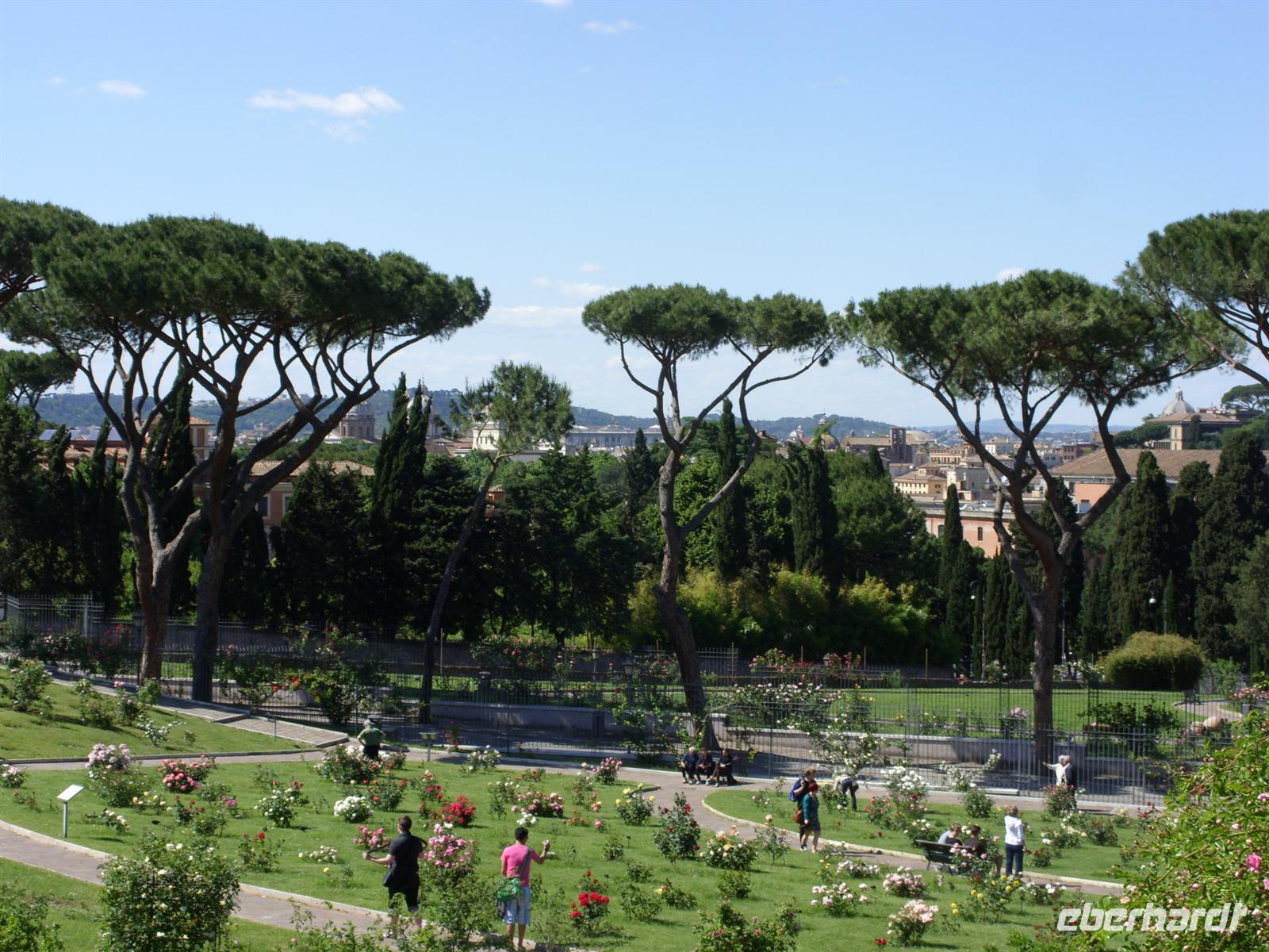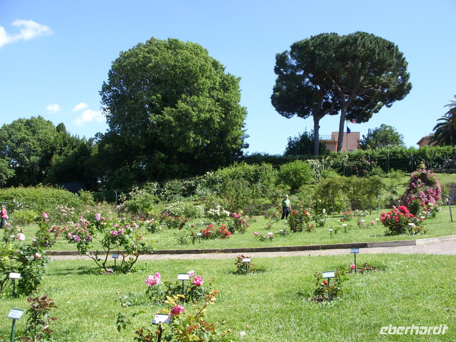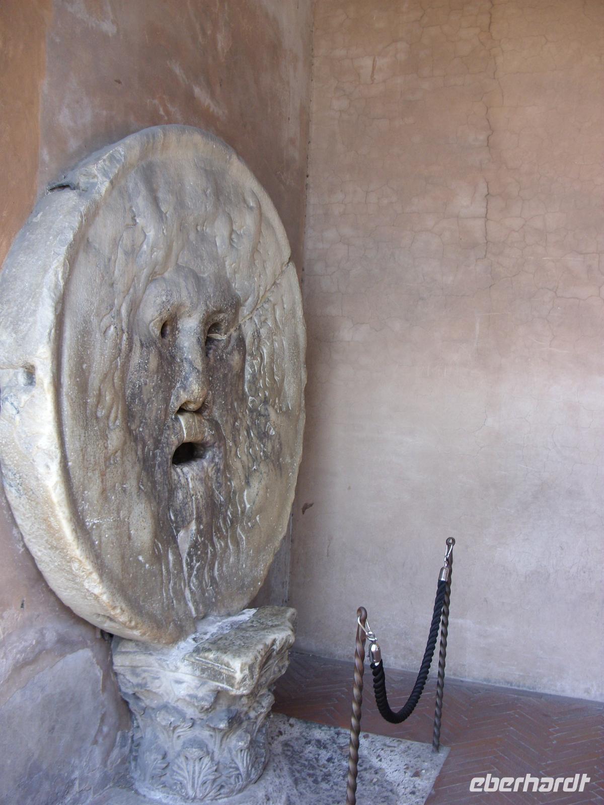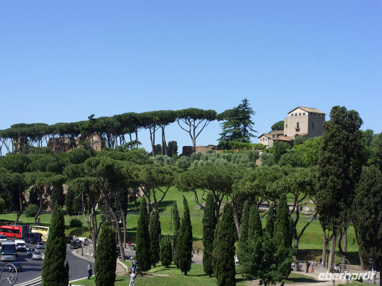 Doch da wir allesamt noch nicht müde waren, trafen wir uns um 15 Uhr am Fusse der Treppen des Kapitols erneut und gingen auf "Wanderschaft" zum Aventinhügel. Dabei passierten wir zunächst das Marcellustheater und visierten die Synagoge im einstigen jüdischen Ghetto von Rom an. Diese ist jedoch aus Sicherheitsgründen leider nur noch im Rahmen einer Zeromonie oder einer Führung zu besichtigen. Weiter führte uns der Weg zur Kirche Santa Maria in Cosmedin, wo wir uns den Mund der Wahrheit durch die Gitterstäbe anschauten. Genau davor gab es nämlich eine lange Schlange von Besuchern, die unbedingt versuchen wollten ihre Hand in den Mund zu stecken - der Überlieferung nach soll dieser zubeißen wenn man lügt. Gleich hinter dieser Kirche erreichten wir erneut den Circus Massimo. Dort erwartete uns dann ein kleines Schmuckstück - der kommunale Rosengarten, einst auf dem Gelände eines jüdischen Friedhofs angelegt, hatte seine Tore für uns geöffnet. Sogleich umwehte uns ein herrlicher Duft der etwa 1100 Rosenarten. Besonders lohnenswert war auch der Palatinhügel mit den antiken Resten im Hintergrund. Gleich nach ein paar weiteren Metern erreichten wir den Orangengarten, der an die Kirche Santa Sabina angegliedert ist. Von hier hatten wir nochmals einen tollen Blick auf den Petersdom und den westlichen Teil Roms. Anschließend statteten wir natürlich auch der ältestes Kirche des Aventinhügels, Santa Sabina, einen Besuch ab. Hier erwartete uns eine große Halle mit 24 kannelierten korinthischen Säulen. Nennenswert war auch das Holzportal aus dem Jahr 432 - echtes Zedernholz aus Afrika! Kurz darauf erreichten wir den Platz des Priorats der Malteserritter. Auf diesem Platz ist vor allem das Schlüsselloch des Hauptportals berühmt. Bitte einmal durchschauen ...
