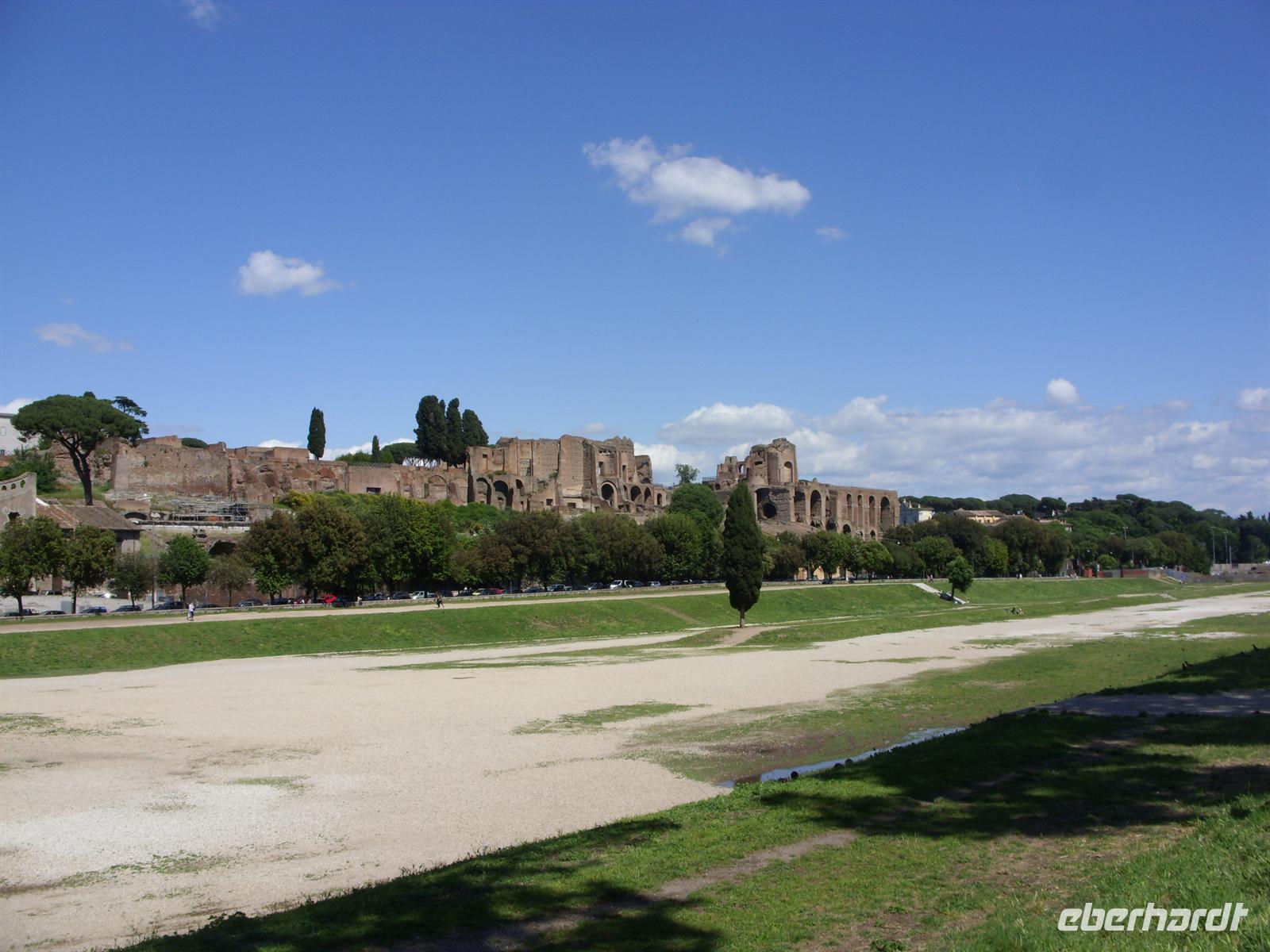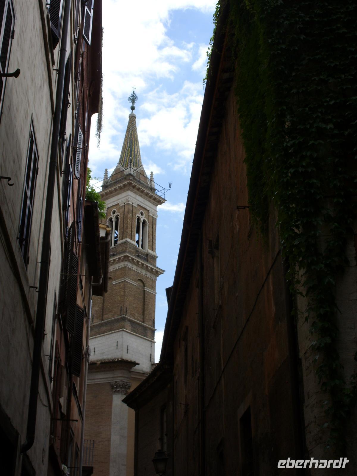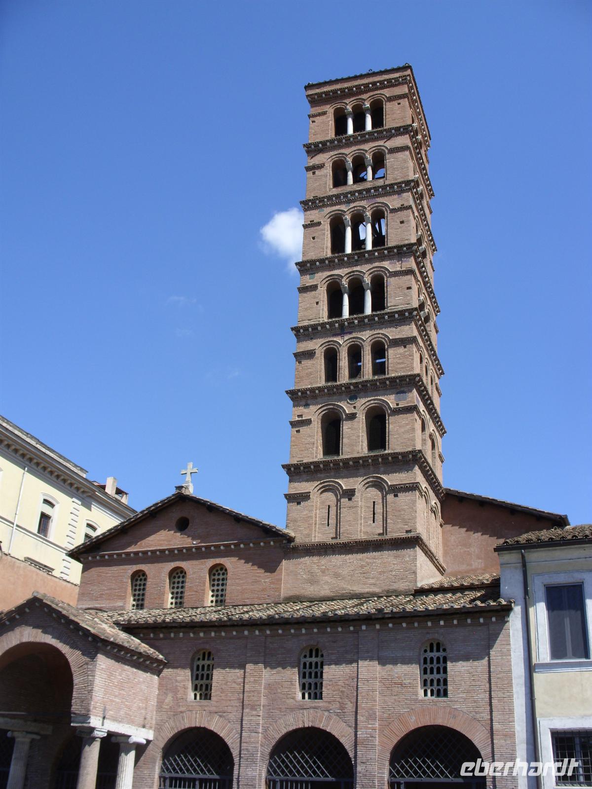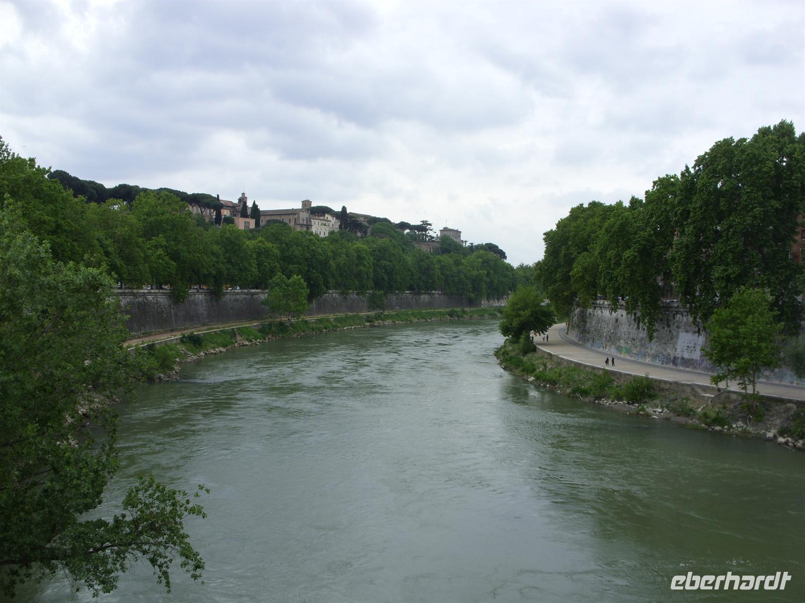 Wie zu erwarten gewesen ist, waren unsere Zimmer allerdings erst ab 13 Uhr bezugsfähig, sodass wir uns entschieden die Stadt schon einmal zu erkunden. Also stellten wir die Koffer ein, zogen uns schnell um und ab ging es zur Metrostation in der Nähe der Lateransbasilika San Giovanni - ein eindrucksvolles Bauwerk aus dem 16. Jahrhundert (obwohl die erste Basilika bereits im Jahr 313 hier errichtet worden ist!). Nun fuhren wir erst einmal ein paar Stationen mit der Metro bis zum Circus Massimo, über dessen Überreste der 500 m langen Trabrennbahn wir dann auch alsbald schlenderten. Unser Ziel war nun der Tiberfluss, den wir schließlich auf der Ponte Palatino in Höhe der Tiberinsel überquerten. Diese erinnert an ein großes, leicht gebogenes Schiff und ist dicht bebaut. Nun waren wir auch schon im Viertel Trastevere angekommen! Dieses Viertel besticht vor allem durch seine engen Gassen, winkeligen Straßenzüge, kleinen Plätzen, ehrwürdigen Kirchen und natürlich der Vielzahl an Trattorien und Pizzerien. Tatsächlich soll es sogar als das Stadtviertel gelten, welches älter als die Sieben-Hügel-Stadt Rom ist. Mit diesem Wissen bummelten wir bis zum Herzstück des Viertels, dem Piazza Santa Maria de Trastevere. Hier galt unsere Aufmerksamkeit der romanischen Kirche Santa Maria, die uns mit ihrer prächtigen Innenausstattung, besonders sehenswert waren dabei die Apsis-Mosaiken aus dem 12. und 13. Jahrhundert, verzauberte. Im Anschluss machten wir eine kleine Mittagspause, sodass wir uns für den Aufstieg auf den Gianicolo-Hügel stärken konnten.