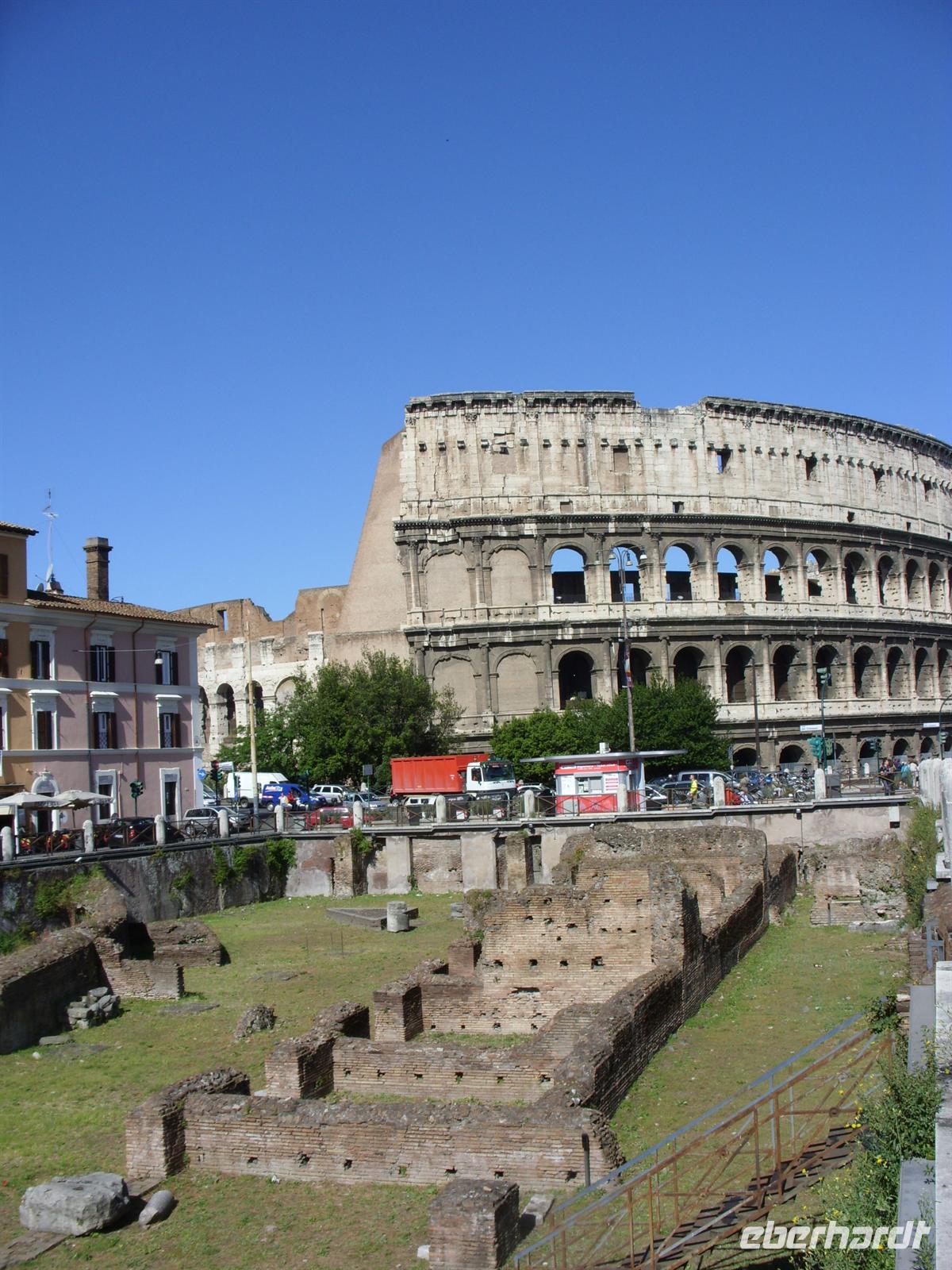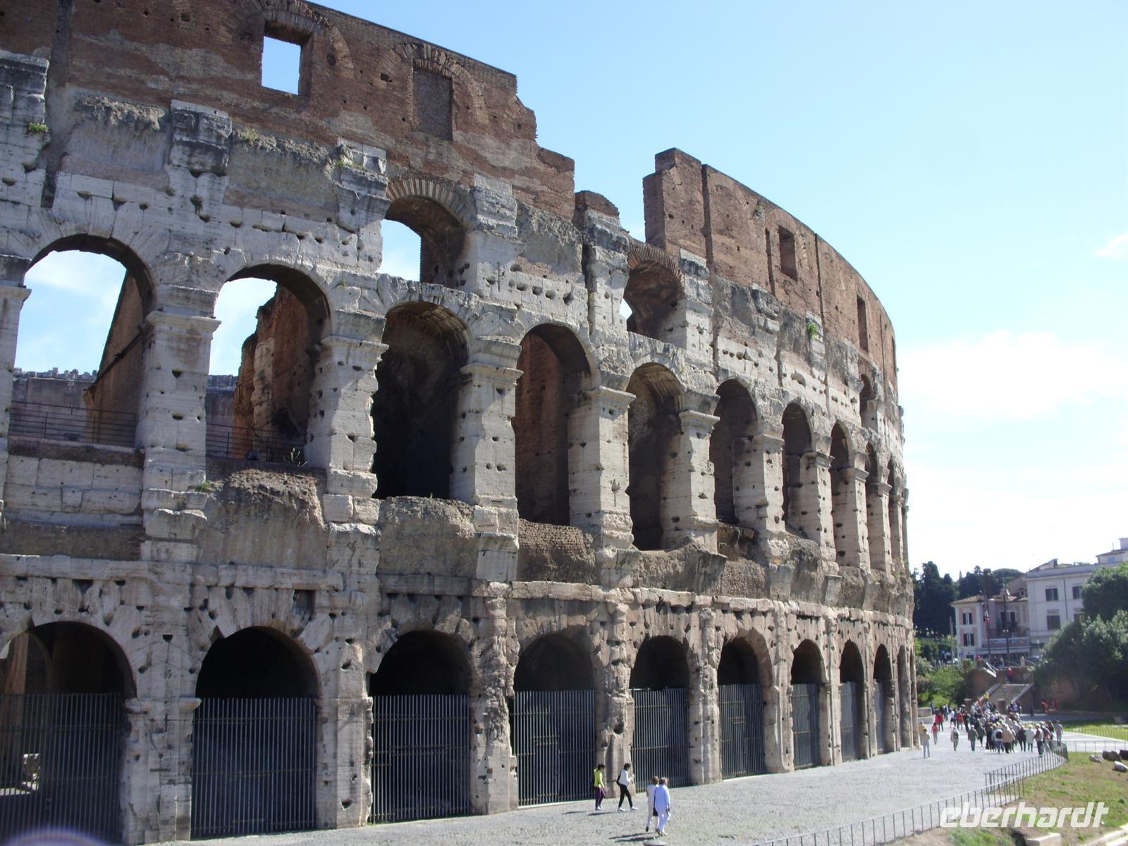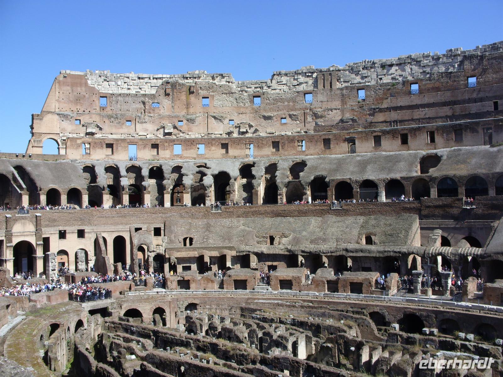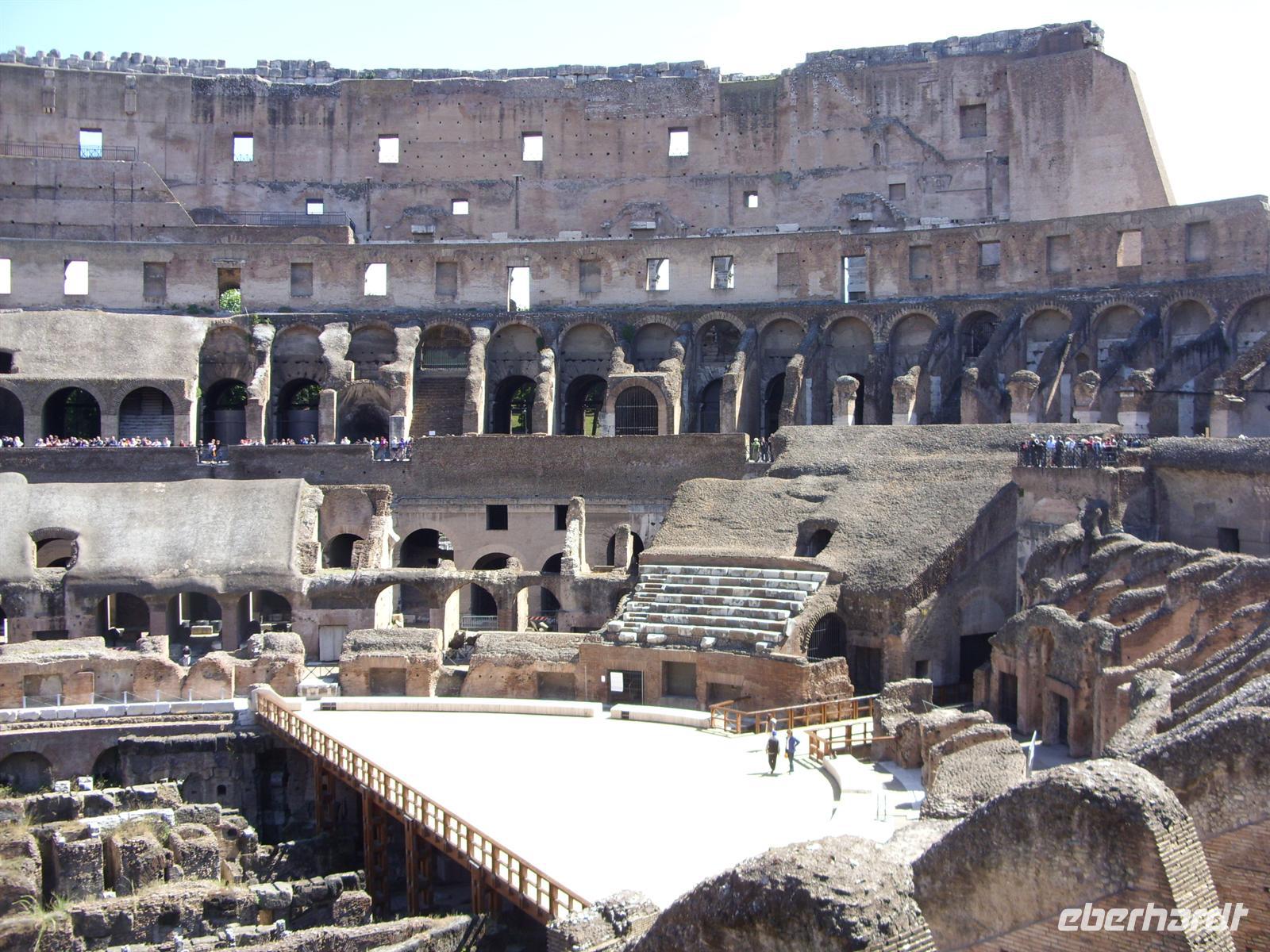 Unser Weg führte uns zunächst zum Kolloseum, welchem wir auch sogleich einen Innenbesuch abstatteten. Vorbei an der langen Warteschlange gelangten wir zügig ins Innere dieser Anlage, wo einst Platz für 55 000 Zuschauer gewesen sein soll. Nicht nur die Maße (188 m lang x 156 m quer x 57 m hoch) des Baus sondern auch die Vorrichtung des Sonnensegels war etwas fast Unvorstellbares, was im Jahr 80 n. Chr. mit tagelangen Festspielen eröffnet worden war. Seitdem sind die Massen begeistert - man konnte förmlich die Anfeuerungsrufe der Römer hören, die anlässlich der Gladiatoren-Spiele ins Kolosseum gekommen sind.