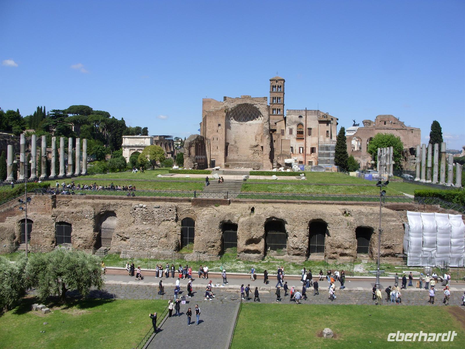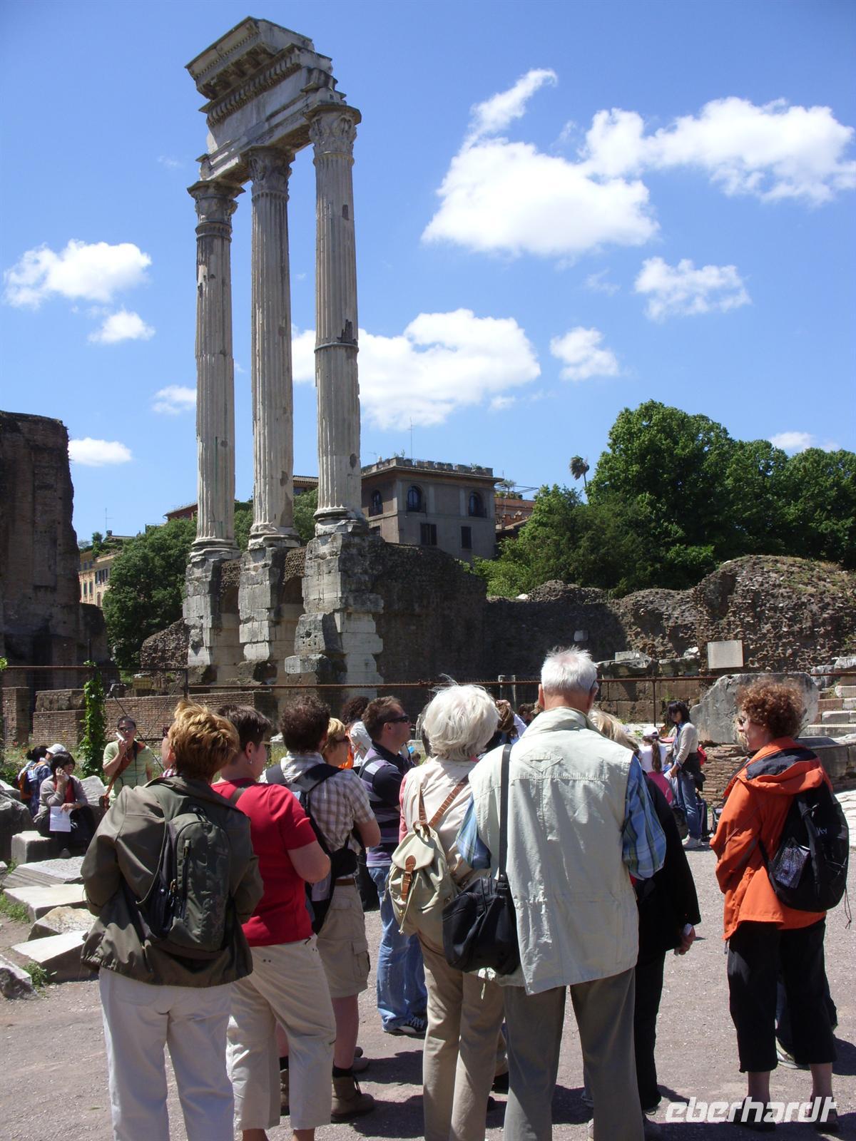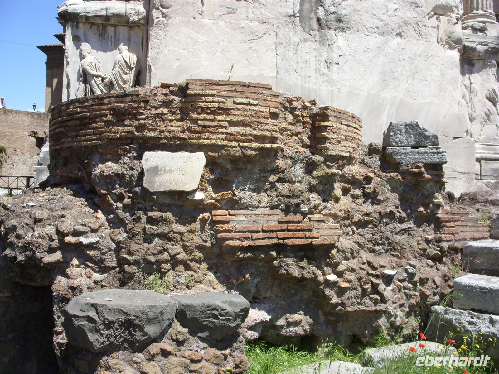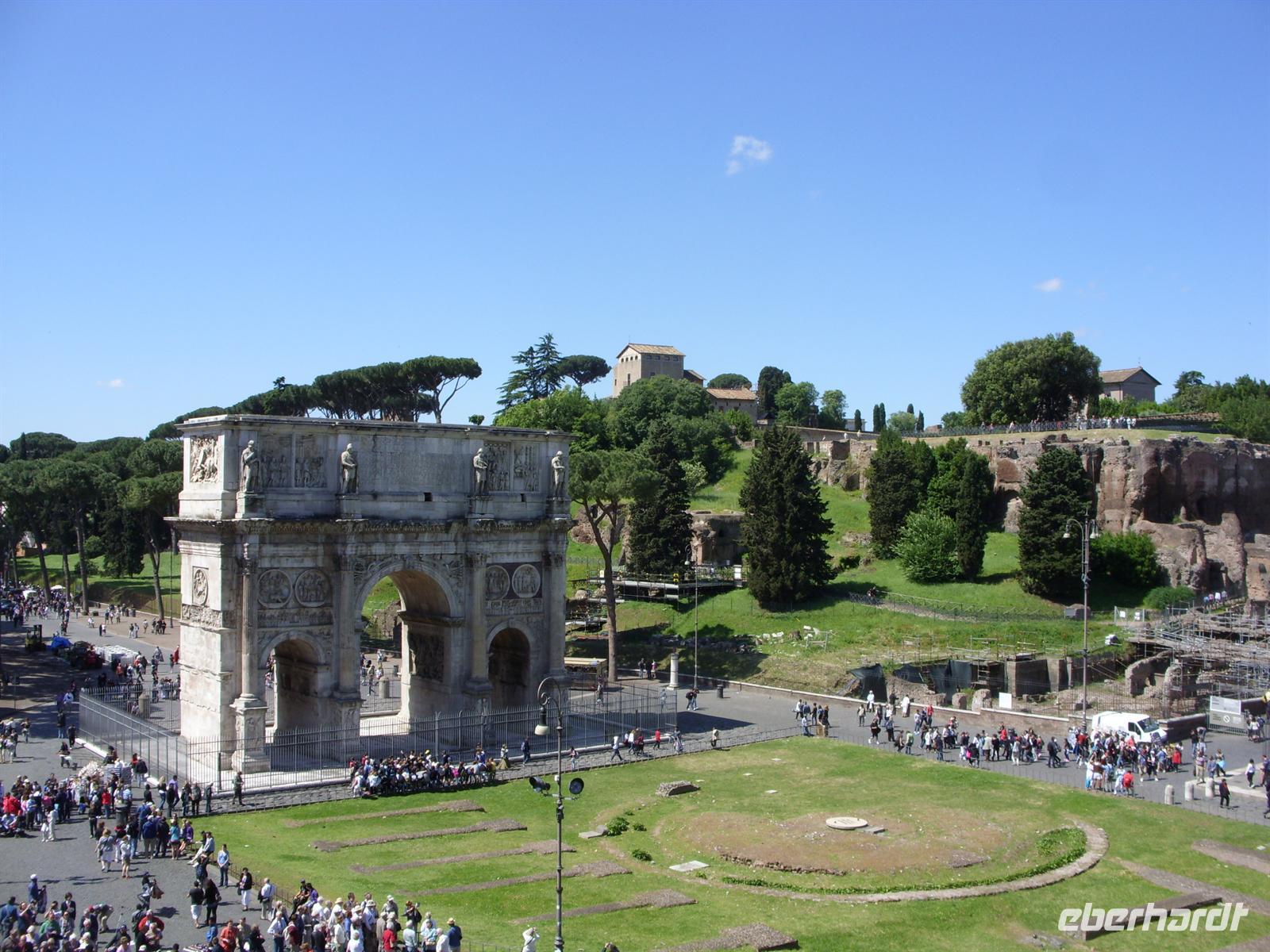 Nach vielen tollen Fotomotiven verließen wir dieses kollosale Anlage und wechselten zum Palatino. Sogleich bestiegen wir den herrlich mediterran bewachsenen Palatinhügel und genossen als erstes den Blick auf den so genannten "Wandelgang" des Kaisers - oder zumindest vermutet man heute, dass dort nach reichhaltigen Mahlzeiten Spaziergänge erfolgten. Im Anschluss erklärte uns Winfried das herrliche Panorama über die Stadt Rom und dann stiegen wir auch schon zum Forum Romanum, dem einstigen Versammlungsplatz der Römer, ab. Vorbei am Titusbogen, einem1821 restaurierten Ehrenbogen, und den Resten der eindrucksvollen dreischiffigen Konstantin-/Maxentius-Basilika trafen wir uns in der Nähe des Grabes von Julius Cäsar wieder, der ja auch noch heute bei den Römern verehrt wird. Zum Abschluss des Besuches im Forum Romanum sahen wir noch den "Nabel der Welt" - von hier aus wurden einst alle römischen Straßen vermessen.
