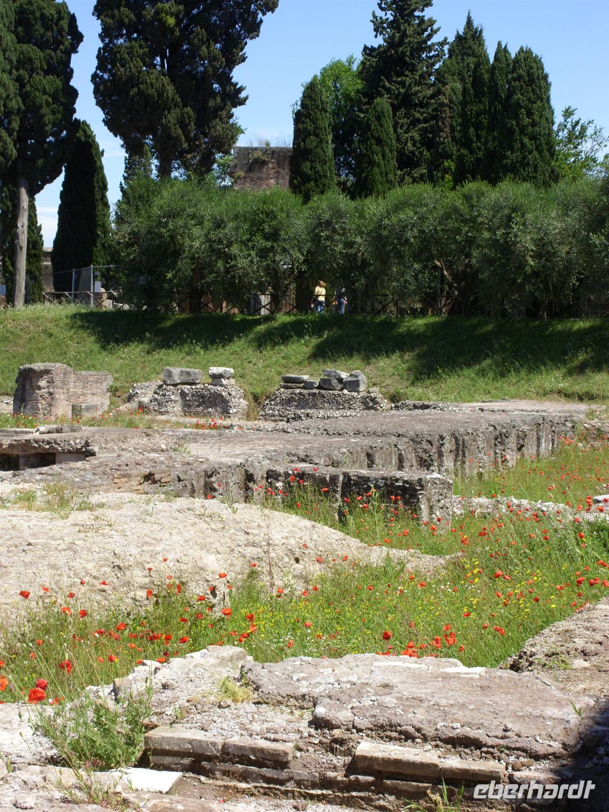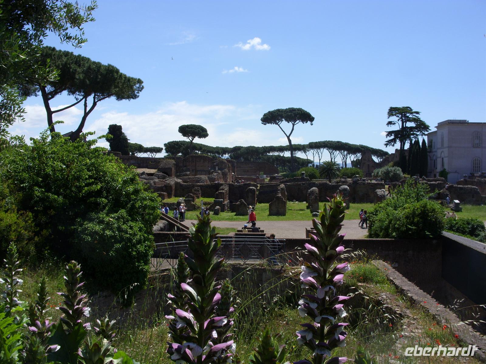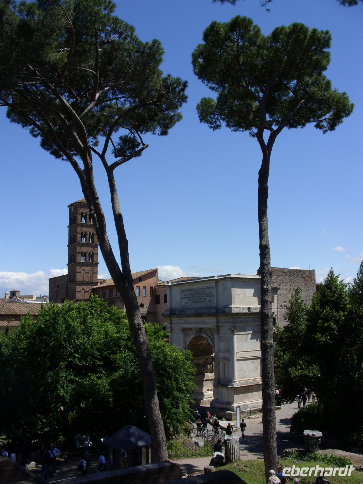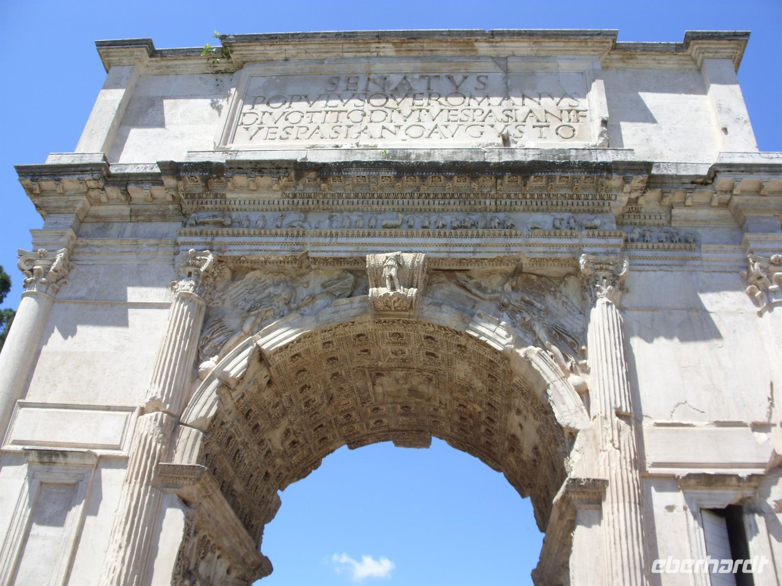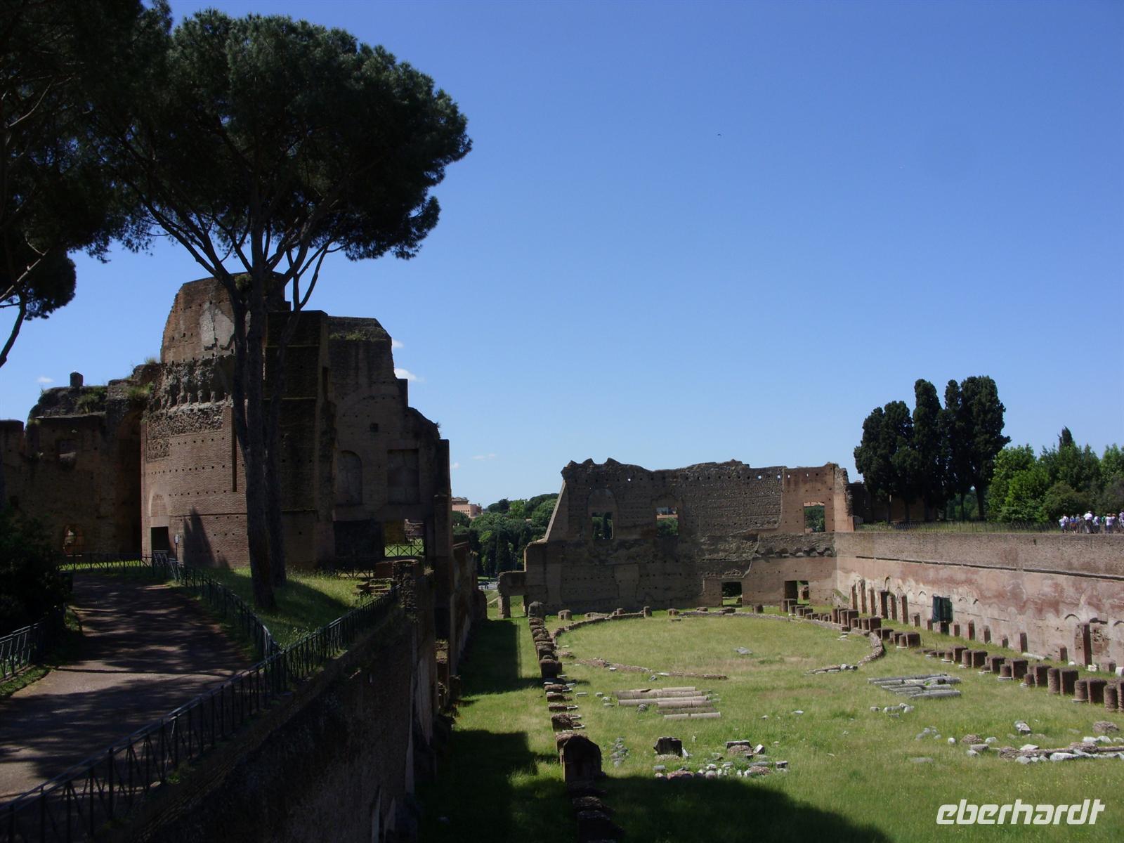 Nach vielen tollen Fotomotiven verließen wir dieses kollosale Anlage und wechselten zum Palatino. Sogleich bestiegen wir den herrlich mediterran bewachsenen Palatinhügel und genossen als erstes den Blick auf den so genannten "Wandelgang" des Kaisers - oder zumindest vermutet man heute, dass dort nach reichhaltigen Mahlzeiten Spaziergänge erfolgten. Im Anschluss erklärte uns Winfried das herrliche Panorama über die Stadt Rom und dann stiegen wir auch schon zum Forum Romanum, dem einstigen Versammlungsplatz der Römer, ab. Vorbei am Titusbogen, einem1821 restaurierten Ehrenbogen, und den Resten der eindrucksvollen dreischiffigen Konstantin-/Maxentius-Basilika trafen wir uns in der Nähe des Grabes von Julius Cäsar wieder, der ja auch noch heute bei den Römern verehrt wird. Zum Abschluss des Besuches im Forum Romanum sahen wir noch den "Nabel der Welt" - von hier aus wurden einst alle römischen Straßen vermessen.