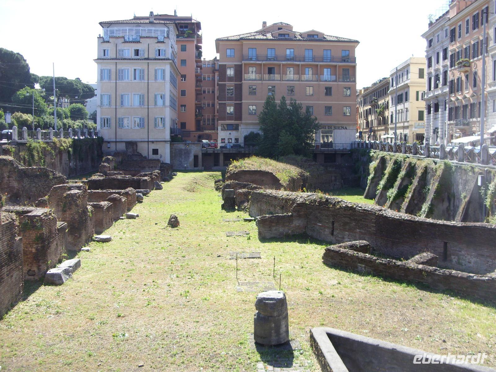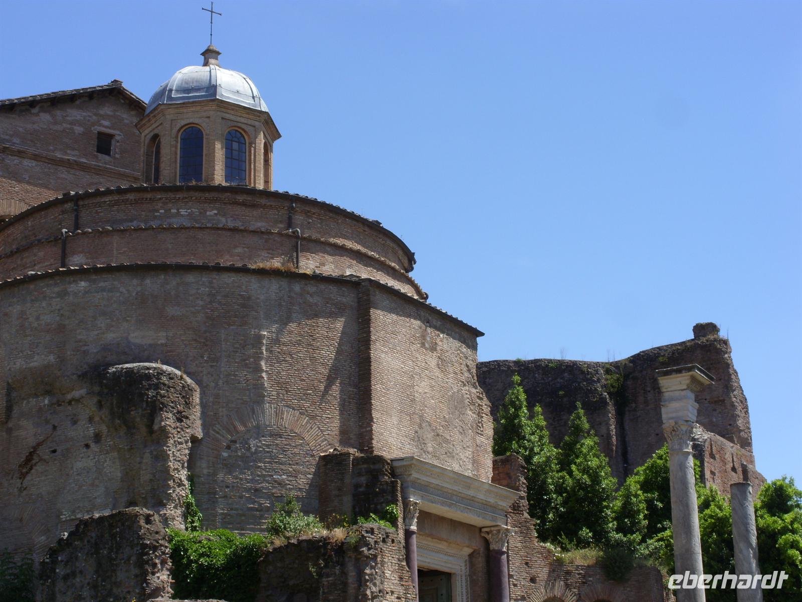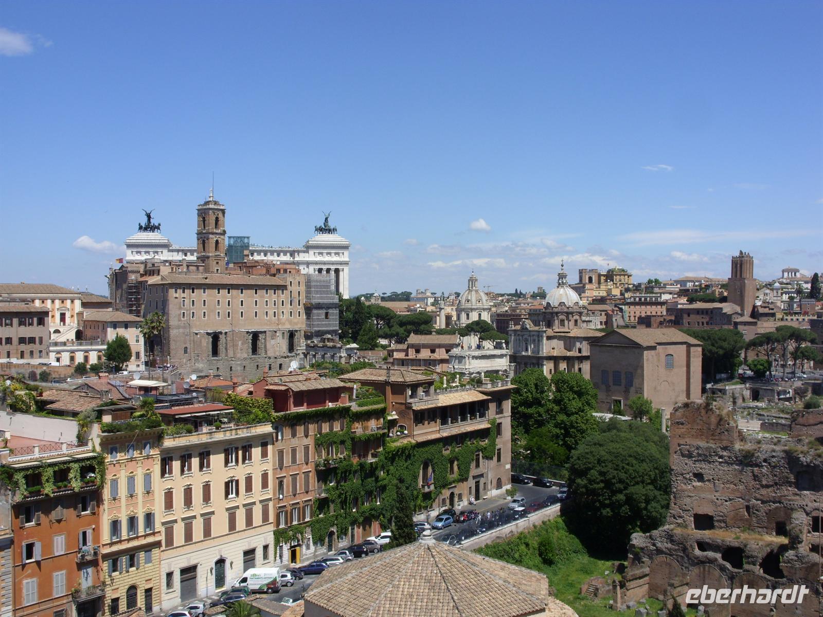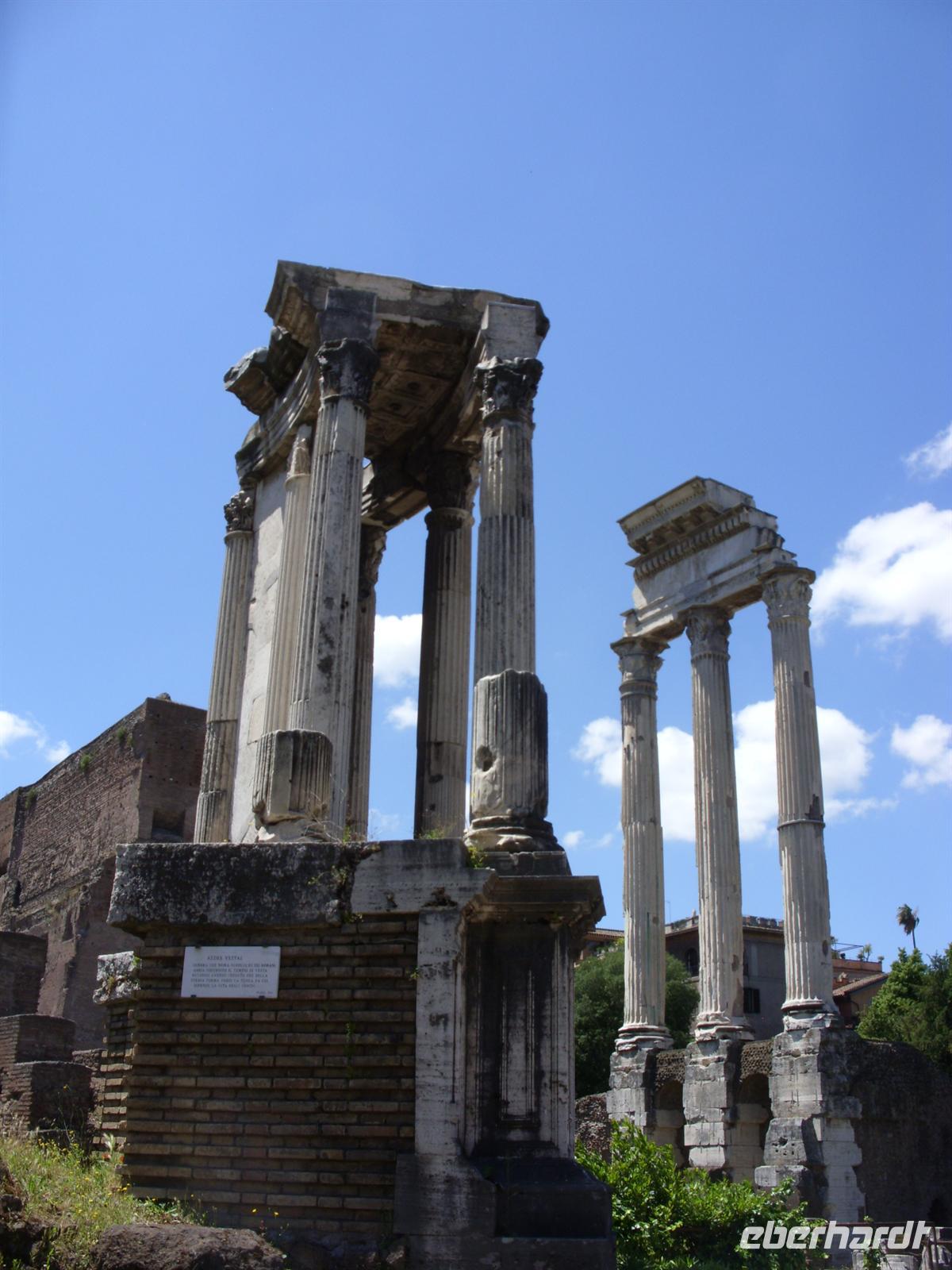Nach vielen tollen Fotomotiven verließen wir dieses kollosale Anlage und wechselten zum Palatino. Sogleich bestiegen wir den herrlich mediterran bewachsenen Palatinhügel und genossen als erstes den Blick auf den so genannten "Wandelgang" des Kaisers - oder zumindest vermutet man heute, dass dort nach reichhaltigen Mahlzeiten Spaziergänge erfolgten. Im Anschluss erklärte uns Winfried das herrliche Panorama über die Stadt Rom und dann stiegen wir auch schon zum Forum Romanum, dem einstigen Versammlungsplatz der Römer, ab. Vorbei am Titusbogen, einem1821 restaurierten Ehrenbogen, und den Resten der eindrucksvollen dreischiffigen Konstantin-/Maxentius-Basilika trafen wir uns in der Nähe des Grabes von Julius Cäsar wieder, der ja auch noch heute bei den Römern verehrt wird. Zum Abschluss des Besuches im Forum Romanum sahen wir noch den "Nabel der Welt" - von hier aus wurden einst alle römischen Straßen vermessen.