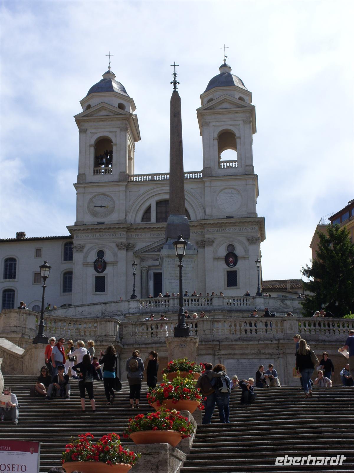 Nach Besichtigung der Kirche überquerten wir den Platz und nahmen die Via del Babuino in Richtung Spanische Treppe. So kamen wir vorbei an der Anglikanischen Kirche und der Byzantinischen Kirche. Ehe wir uns versahen, standen wir dann auch schon am Fusse der berühmten Spanischen Treppen, die den eigentlichen Name Scalinata della Trinità dei Monti, benannt nach der auf dem Hügel stehenden französischen Kirche Trinità dei Monti, trägt. Doch wo kommt nun der Name Spanische Treppe her? Dies geht zurück auf den Palazzp di Spagna, dem Sitz der Spanische Gesandtschaft beim Heiligen Stuhl seit dem 17. Jahrhundert. Kurios!