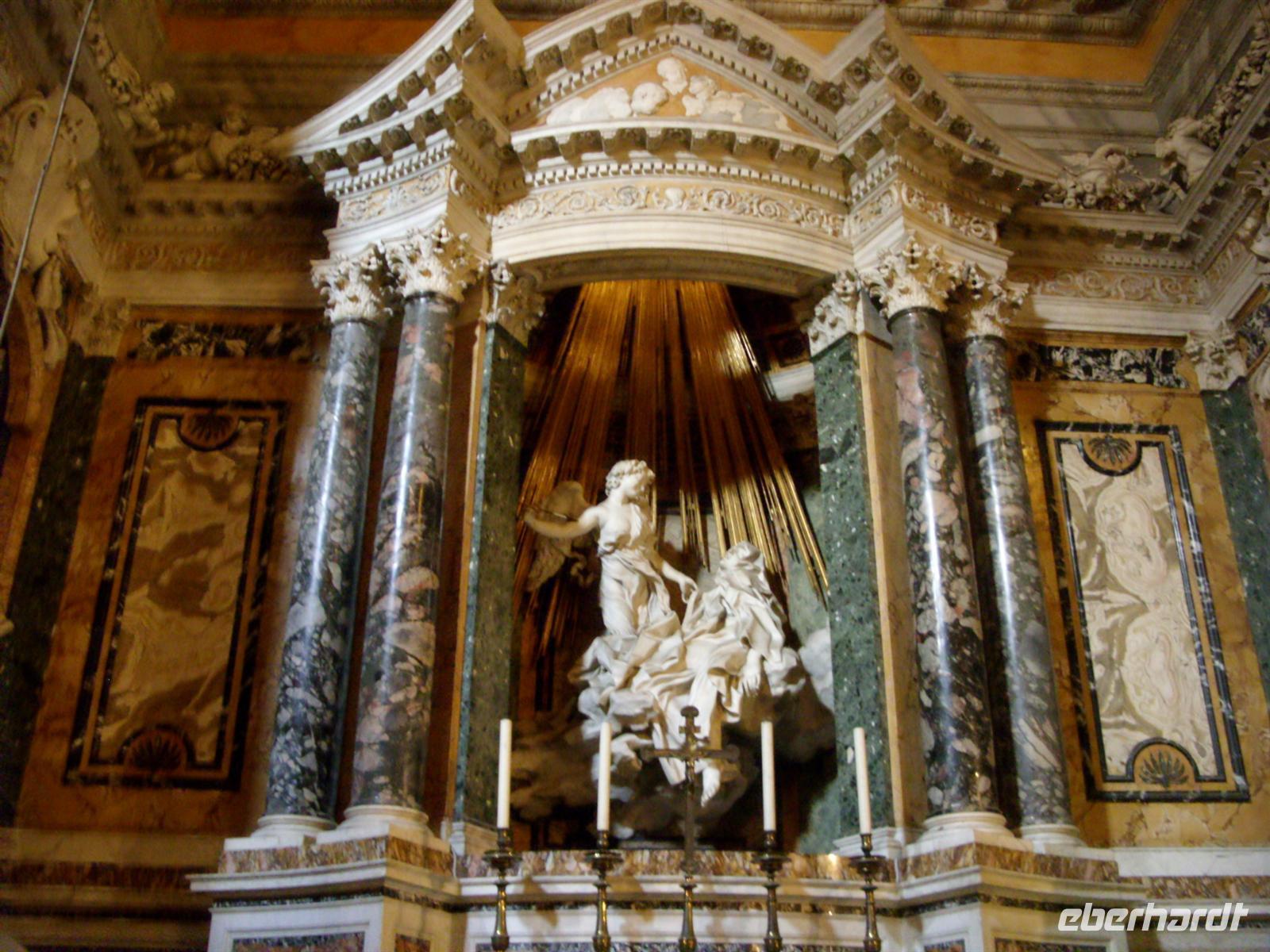 Von hier nahmen wir nun zwei Stationen die Metro und erreichten am Piazza della Repubblica mit einem der schönsten römischen Brunnen wieder das Tageslicht. Von hier war es nur ein Katzensprung zur nächsten Kirche - Santa Maria della Vittoria, benannt nach dem Sieg des katholischen Kaisers Ferdinand II. am Weißen Berg bei Prag über die Protestanten. Dieser Sieg wurde vor allem auch der Hilfe der Gottesmutter Maria zugeschrieben und so bekam das Gotteshaus den entsprechenden Namen. Im Inneren der Kirche wurden wir zum ersten Mal an diesem Tag auch auf ein besonderes Werk des Künstlers Bernini aufmerksam gemacht: die Marmorgruppe "Die Verzückung der heiligen Theresa". Wohl kein anderer Künstler kann so eine überirrdische Schönheit aus Marmor entstehen lassen ...