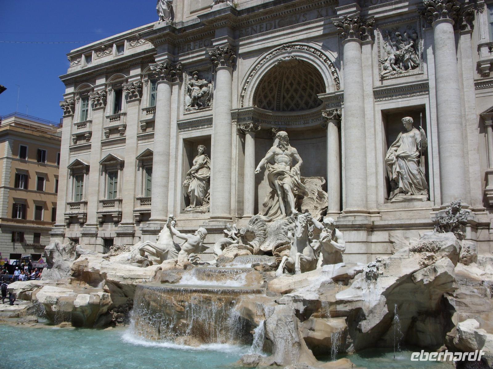 Nun wanderten wir am Barberini-Platz vorbei zu einem der wohl sehenswerten Bauten Roms, dem Trevi-Brunnen. Zwischen 1732 und 1751 entstand durch den Künstler Salvi diese 20 m breite und 26 m hohe meiserhafte Brunnenanlage, die die Besucher stets dazu anhält eine Münze in den Brunnen zu werfen - der Sitte nach, soll dies bei dem Wunsch helfen wieder einmal nach Rom zu kommen. Natürlich probierten wir es aus!
