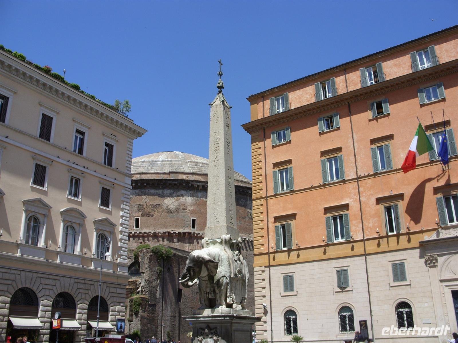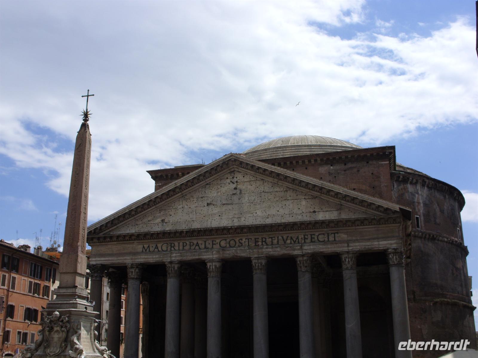 Weiter ging es nun über die Hauptstraße Roms hinweg, den Via Corso, zu den Resten des Hadrianstempels, am Jesuitenkolleg vorbei bis zur Kirche Santa Maria sopra Minerva. Hierbei handelte es sich um den einzig voll ausgebildeten Kirchenbau im gotischen Stil, der in der Ewigen Stadt zu finden ist. Da diese Kirche von altersher den Dominkanern anvertraut ist, die oft als Seelsorger des Volkes fungierten, gibt es in der Santa Maria sopra Minerva eine Vielzahl an reich ausgestatteten Grabkapellen. Gleich nebenan stand jedoch das wohl beeindruckendste Gotteshaus Roms - das Pantheon! Doch bevor uns der beeindruckenden Baumeisterkunst widmen sollten, hiess es erst einmal Pause zu machen ... Eisdielen, Pizzerien, Cafés und andere Läden gab es ja genug!