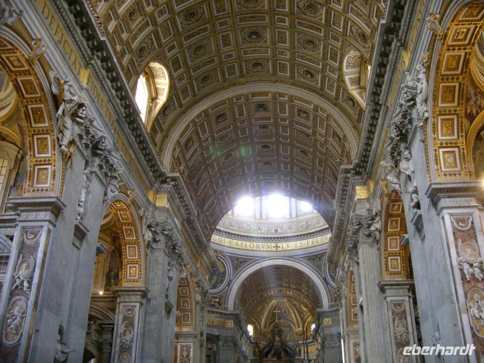 Und endlich lag der Petersplatz vor uns ... nur noch wenige Meter und dann standen wir inmiten des Vatikans, kleinster Staat der Welt (0,44 km²). Nach den eindrucksvollen Erklärungen unseres Winfrieds reihten wir uns dann auch in die Warteschlange am Eingang (Sicherheitskontrolle!) ein, ehe wir schließlich ein paar Kopfhörer in Empfang nehmen mussten. Mit zahlreichen anderen Besuchern aus aller Welt wurden wir nun in den Petersdom förmlich hinein geschoben, wo uns natürlich als erstes die ungeheure Größe in Staunen versetzte. Mehr als zweimal passt der Kölner Dom in das Innere des Peterdoms! Dazu gab es zahlreiche Gemälde, Skulpturen, Wandarbeiten, Grabmähler, Mosaikbilder u.a. von dem bedeutenden römischen Künstler zu bestaunen. Es war schon wirklich beeindruckend ...