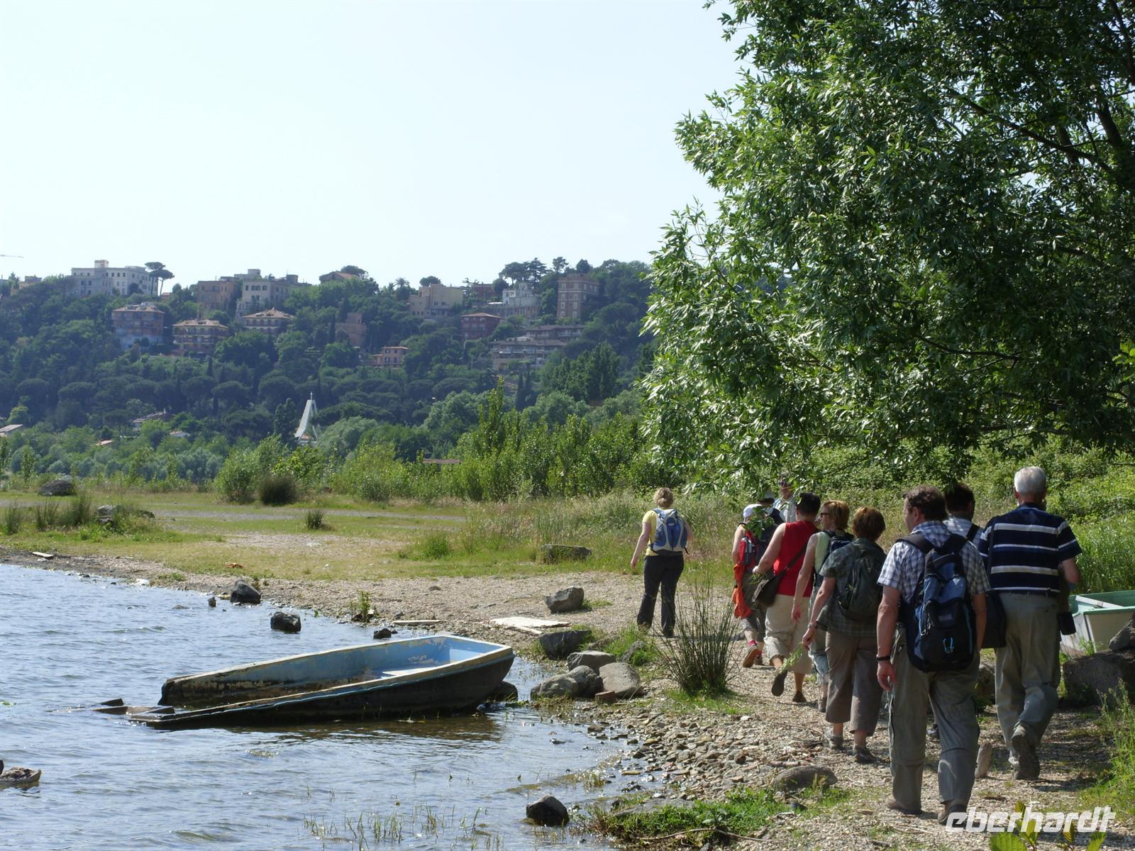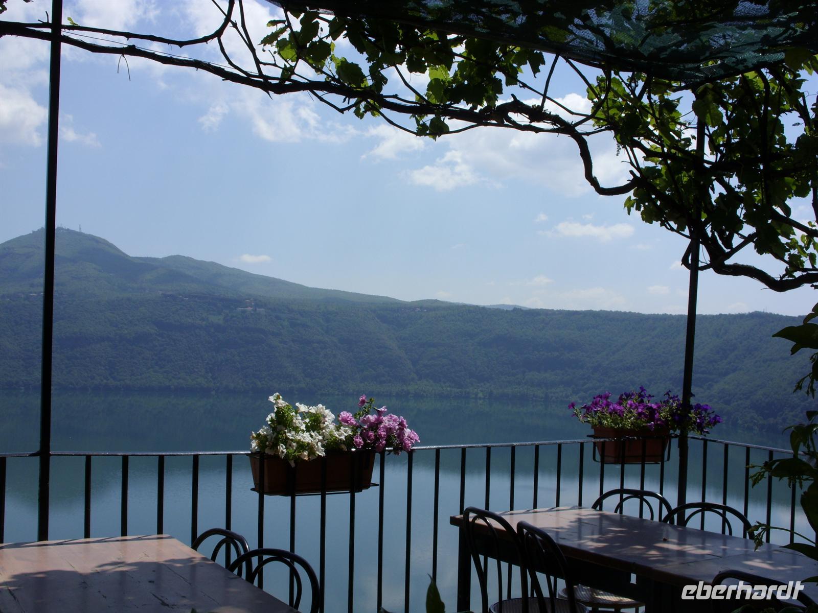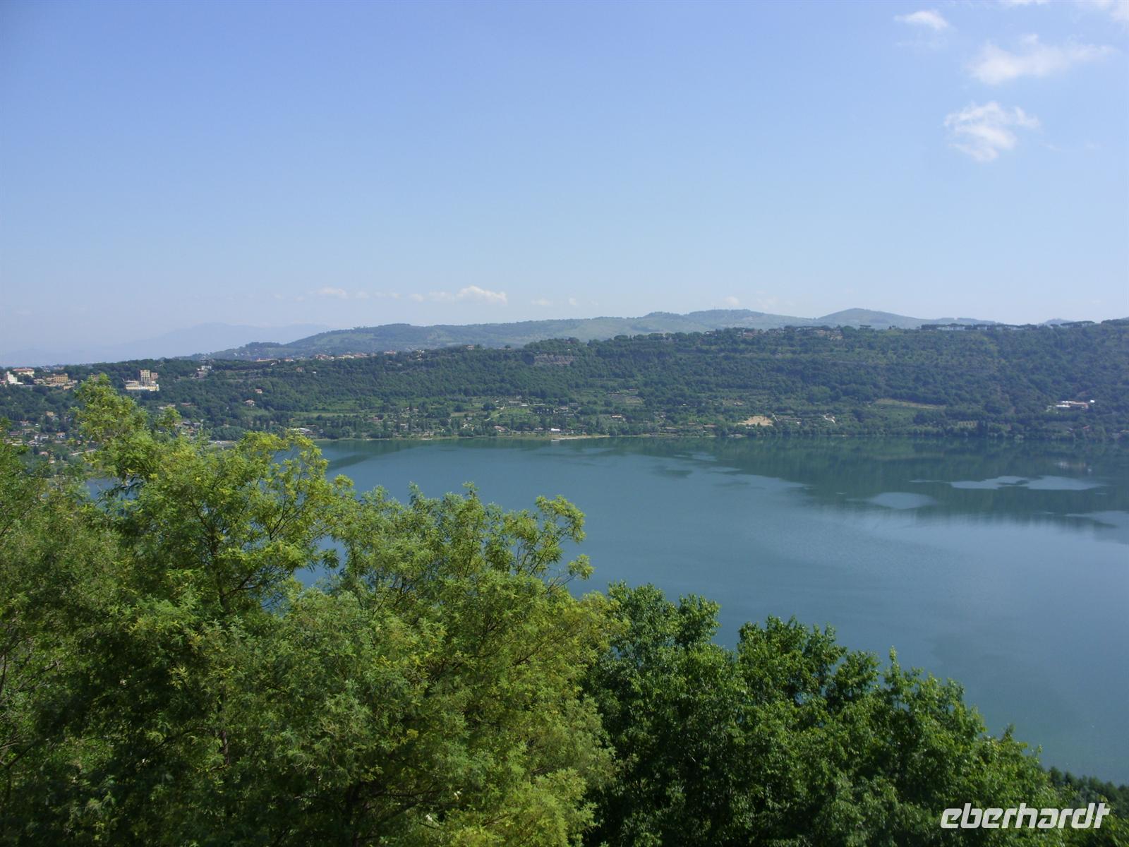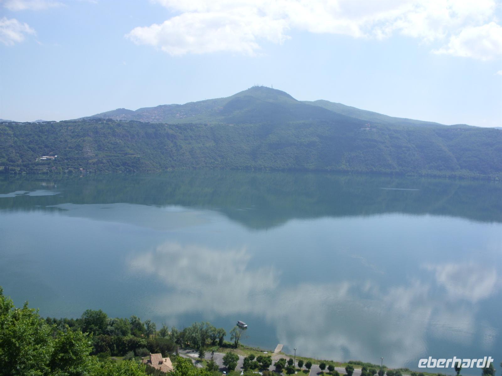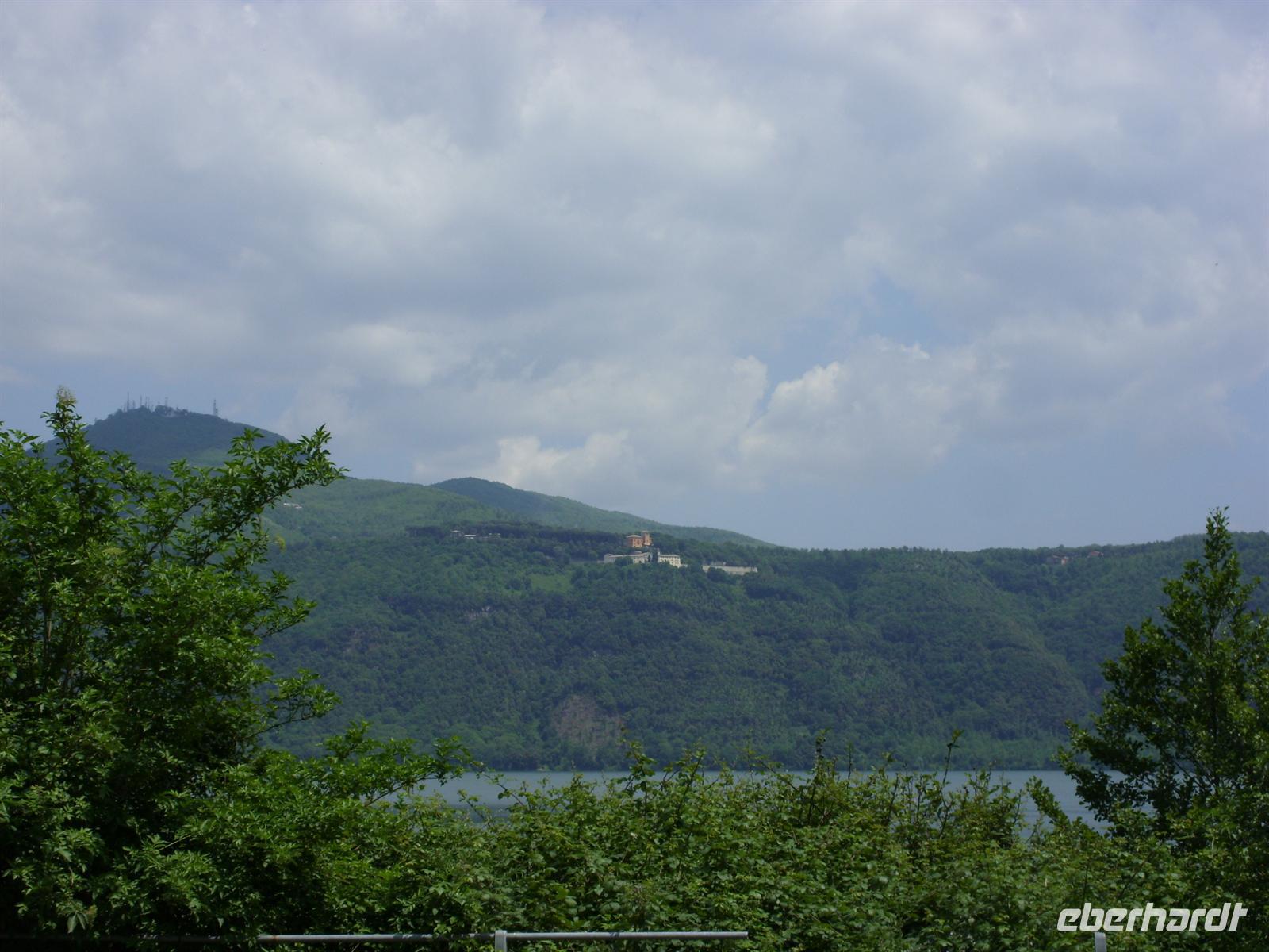 Im Eilschritt kehrten wir dann zum Hotel zurück, wo uns auch schon der kleine Bus unseres angemieteten Busunternehmens erwartete. Nun verließen wir gen Südosten die Innenstadt und visierten die Albaner Berge an. Diese erschienen auch schon recht bald am Horizont und hatten mit Höhen bis fast 1000 m aufzuwarten. Unser erstes Ziel war nun Castel Gandolfo. Diese Ortschaft ist in erster Linie durch die Sommeresidenz des Papstes bekannt, welche seit den Lateranverträgen aus dem Jahr 1929 exterritoriales Gebiet des Vatikans sind. Der Ort selbst besticht jedoch auch durch seine Lage auf dem Kraterrand eines vor über 350 000 Jahren erloschenen Vulkans. An dessen Grund befindet sich heute der Albaner See. Nachdem wir ein wenig Freizeit genossen, um durch Castel Gandolfo zu bummeln, nahmen wir unseren Bus zum See hinunter und kehrten dort alsbald in das Ristorante "Inferno" (Hölle!) ein. Hier erwartete uns nicht gerade ein Snack wie angekündigt sondern ein umfassenden Teller mit allerlei Wurstdelikatessen und natürlich Porchetta, kaltes Wildschein in Scheiben geschnitten. Dazu gab es noch Pizza sowie Wein und Wasser. Nach diesem reichlichen Mahl wollten wir uns eigentlich nur zum Strand kullern und ruhen ... Doch uns erwartete jetzt der 10 km lange Rundwanderweg um den etwa 170 m tiefen und damit auch sehr kalten einstigen Kratersee Lago Albano. Zunächst mussten wir zwar ein Stückchen Straße laufen, doch als wir das römische Emissario (römischer Bau aus dem Jahr 398 v. Chr. um die Wasserhöhe im See zu regulieren) erreicht hatten, wechselten wir auf einen gemütlichen Waldweg, wo ab und an nur noch Jogger unseren Weg kreuzten. Während wir so dahin liefen, wurde uns erst einmal so richtig klar, dass wir inmiten eines Vulkankraters unterwegs waren - an einigen Stellen ragten die Felswände tatsächlich sehr steil nach oben!