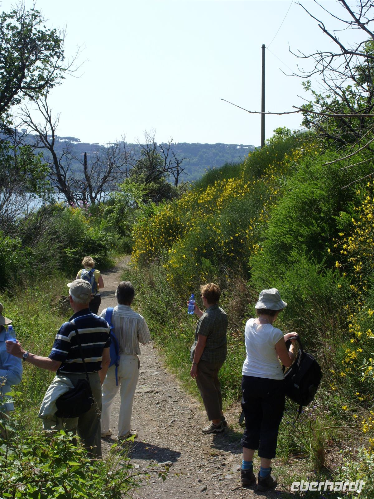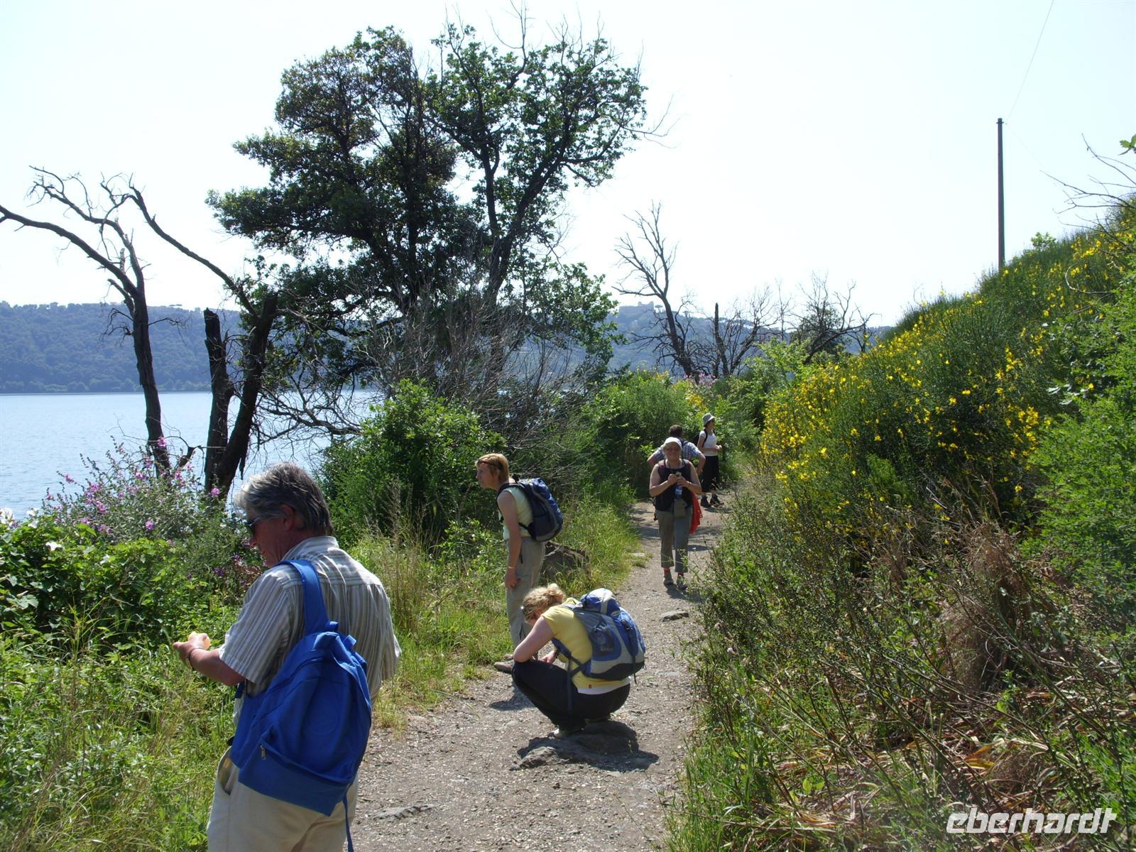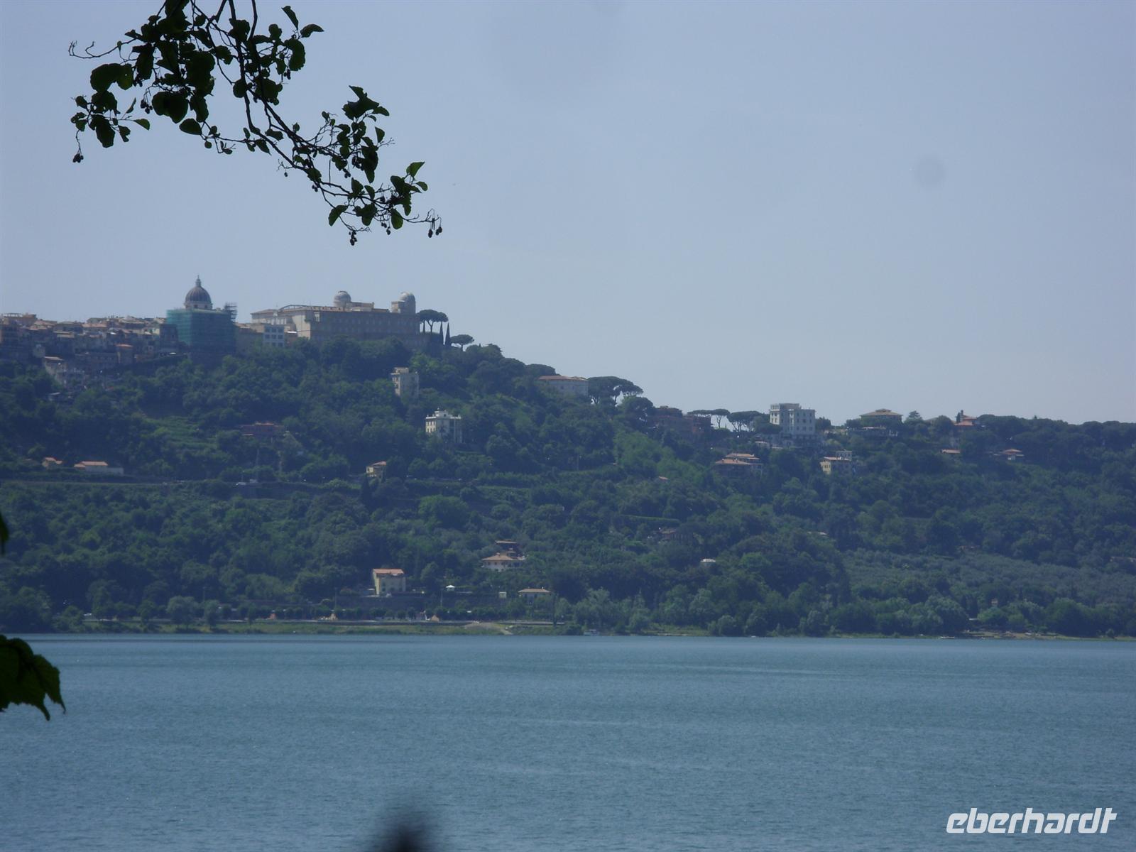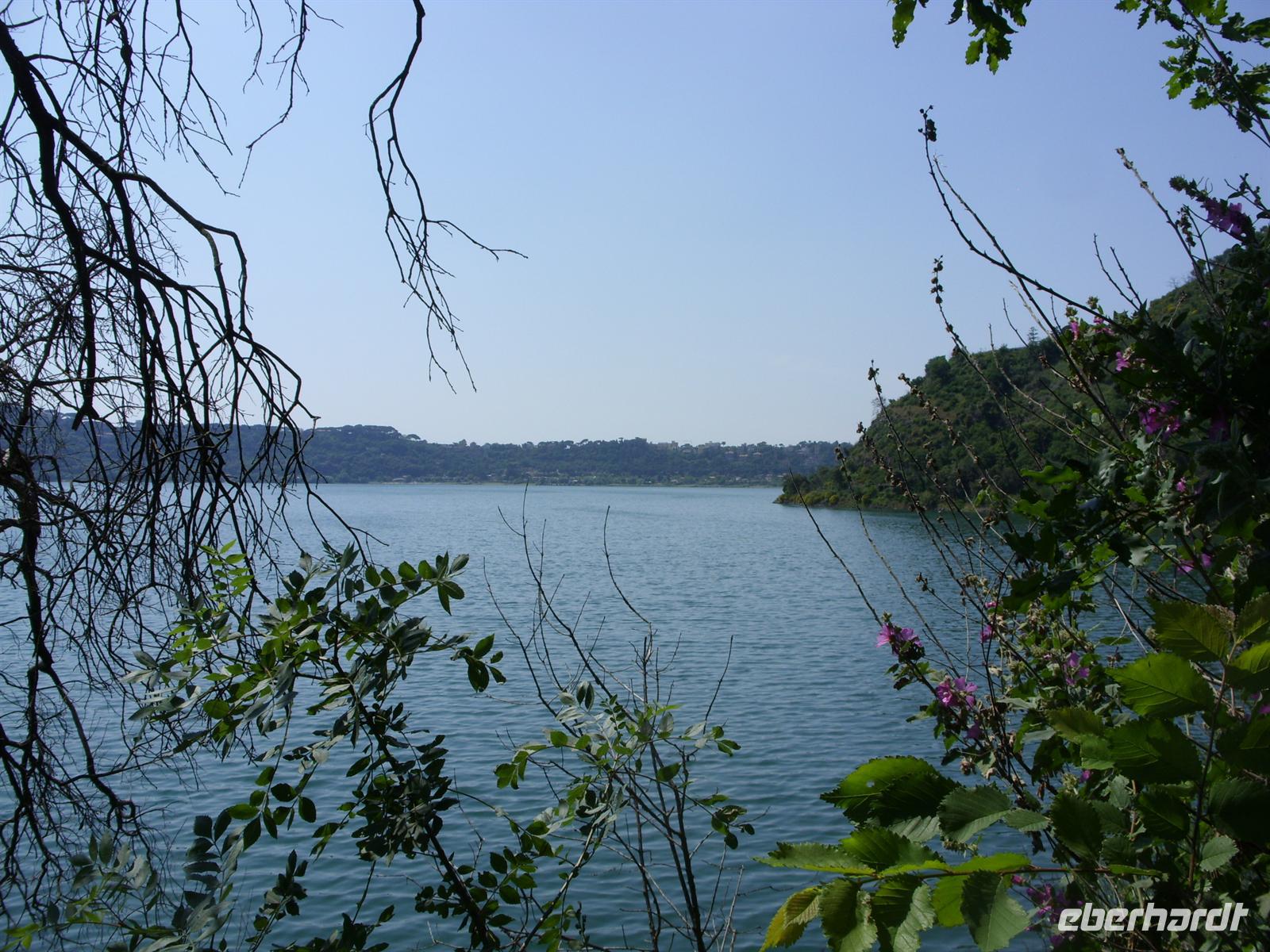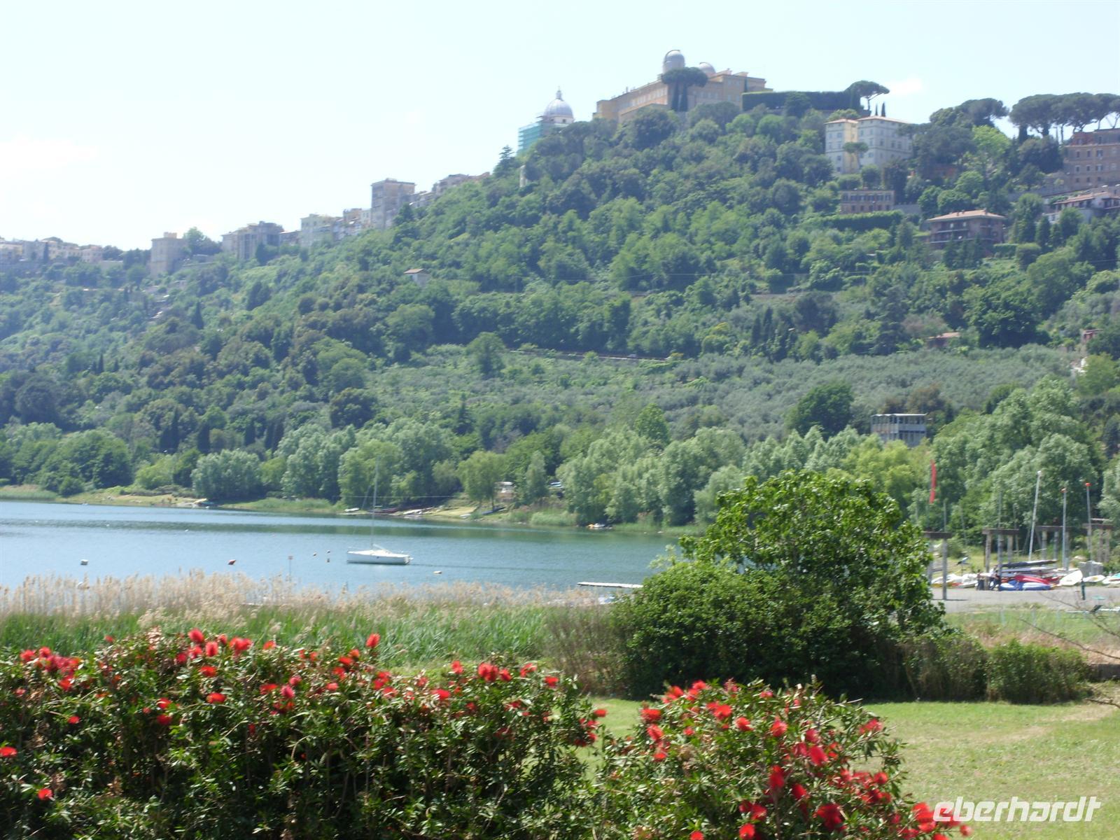 Im Eilschritt kehrten wir dann zum Hotel zurück, wo uns auch schon der kleine Bus unseres angemieteten Busunternehmens erwartete. Nun verließen wir gen Südosten die Innenstadt und visierten die Albaner Berge an. Diese erschienen auch schon recht bald am Horizont und hatten mit Höhen bis fast 1000 m aufzuwarten. Unser erstes Ziel war nun Castel Gandolfo. Diese Ortschaft ist in erster Linie durch die Sommeresidenz des Papstes bekannt, welche seit den Lateranverträgen aus dem Jahr 1929 exterritoriales Gebiet des Vatikans sind. Der Ort selbst besticht jedoch auch durch seine Lage auf dem Kraterrand eines vor über 350 000 Jahren erloschenen Vulkans. An dessen Grund befindet sich heute der Albaner See. Nachdem wir ein wenig Freizeit genossen, um durch Castel Gandolfo zu bummeln, nahmen wir unseren Bus zum See hinunter und kehrten dort alsbald in das Ristorante "Inferno" (Hölle!) ein. Hier erwartete uns nicht gerade ein Snack wie angekündigt sondern ein umfassenden Teller mit allerlei Wurstdelikatessen und natürlich Porchetta, kaltes Wildschein in Scheiben geschnitten. Dazu gab es noch Pizza sowie Wein und Wasser. Nach diesem reichlichen Mahl wollten wir uns eigentlich nur zum Strand kullern und ruhen ... Doch uns erwartete jetzt der 10 km lange Rundwanderweg um den etwa 170 m tiefen und damit auch sehr kalten einstigen Kratersee Lago Albano. Zunächst mussten wir zwar ein Stückchen Straße laufen, doch als wir das römische Emissario (römischer Bau aus dem Jahr 398 v. Chr. um die Wasserhöhe im See zu regulieren) erreicht hatten, wechselten wir auf einen gemütlichen Waldweg, wo ab und an nur noch Jogger unseren Weg kreuzten. Während wir so dahin liefen, wurde uns erst einmal so richtig klar, dass wir inmiten eines Vulkankraters unterwegs waren - an einigen Stellen ragten die Felswände tatsächlich sehr steil nach oben!