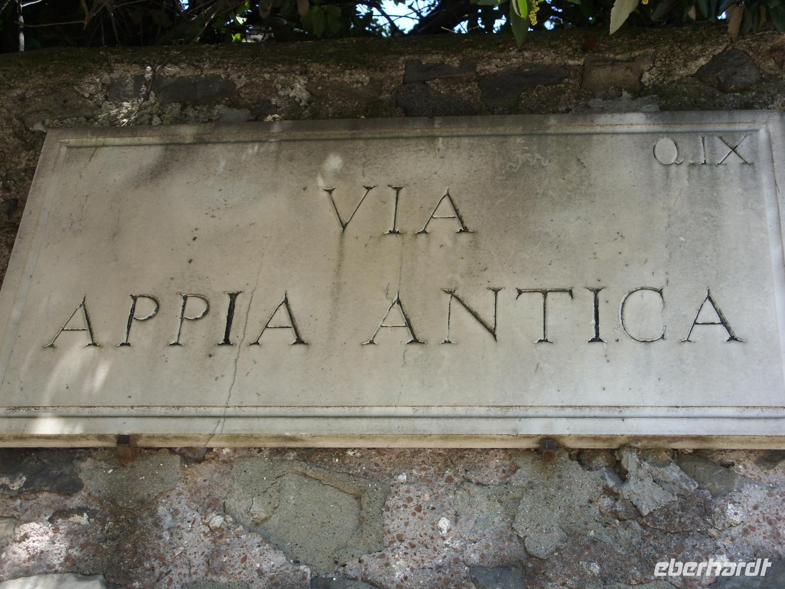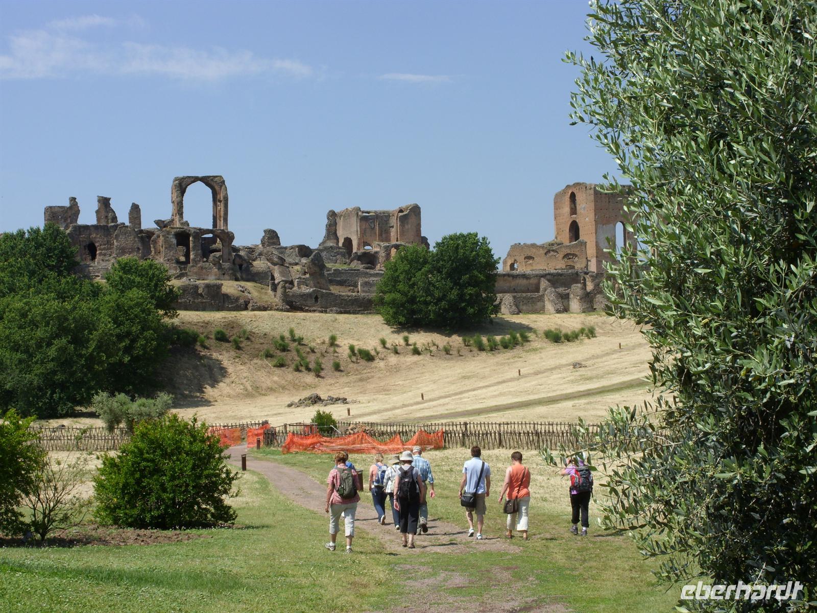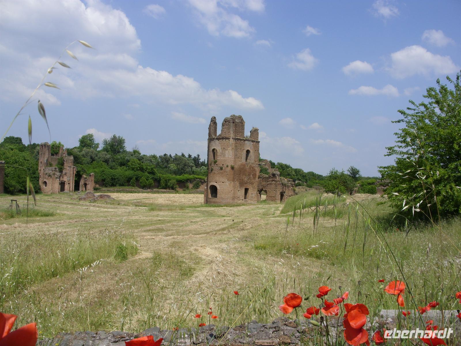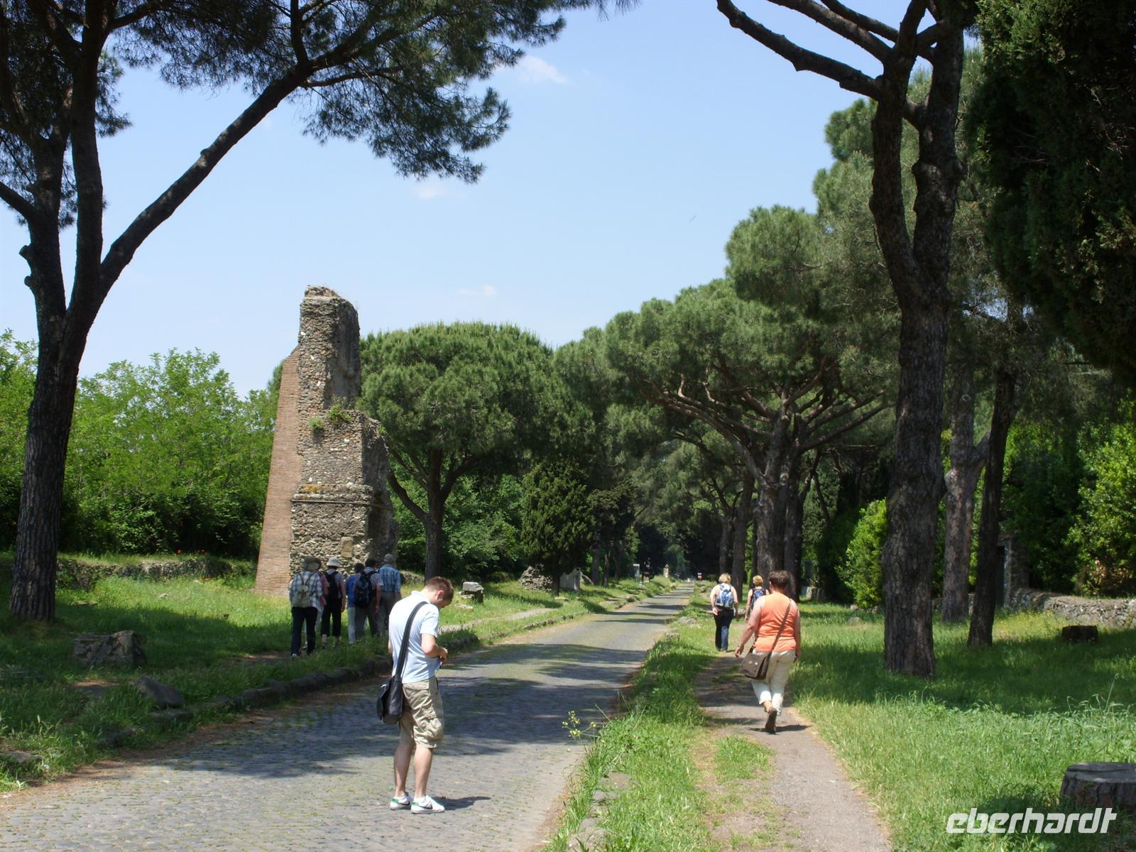 Gegen 10.30 Uhr nahmen wir dann die Metro gen Süden, um bei der Station Colli Albani unseren Winfried wieder zu treffen. Gleich ging es mit dem Bus 664 weiter und so erreichten wir nach einer guten halben Stunde die Villa dei Quintili. Diese weitläufige Anlage wurde ursprünglich im Jahr 150 n. Chr. erbaut ehe sie in den Besitz des Kaisers Commodus überging, der sie zu seiner Residenz erweitern ließ. Recht gut erkennbar waren noch immer das Caldarium und am Rand zur Via Appia Antica das einstige Nymphäum (Wasserschloss). Am Mittag erreichten wir schließlich auch diese antike Straße und bewegten uns auf ihr nun etwa 4 km gen Stadtzentrum fort. Unterwegs betrachteten wir immer wieder mit großem Interesse die unterschiedlichen Grabanlagen, denn einst durfte ja keiner innerhalb der Stadtmauern begraben werden. Aus diesem Grund gilt übrigens die Via Appia Antica als längstes Museum der Welt - ursprünglich hatte die Straße eine Länge von 195 km und reichte von Rom bis Capua.