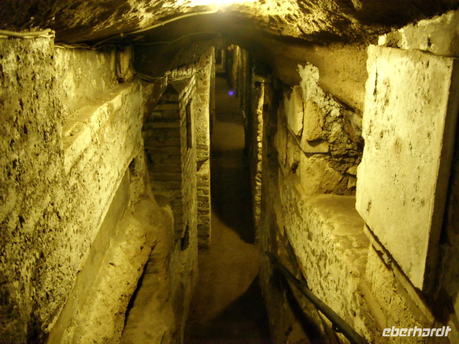 Nach einer guten Stunde des Fussweges legten wir unsere Mittagspause in einer kleinen Bar ein. Kaffee und Eis gibt es in Italien ja zum Glück überall! Nach einer kleinen Ruhepause wartete das ehemalige Grabmahl der Cecila Maetelle auf uns. Mit ein bisschen Phantasie war hier durchaus die einstige Pracht dieser bedeutenden römischen Familie erkennbar. Nun waren es nur noch wenige Meter bis zu der ersten der vier römischen Katakomben, die unterirrdisch ein Netz von 15 km auf drei Ebenen haben. Insgesamt 80 000 (!) Menschen sollen unterirrdisch bestattet worden sein - natürlich sahen wir während unser kleien Rundgangs keine Knochenreste mehr. Diese wurden zur Sicherheit alle in einen anderen Bereich gebracht. Trotzalledem war dieser Rundgang noch einmal ein lohnenswerter Blick in die römische Unterwelt ...