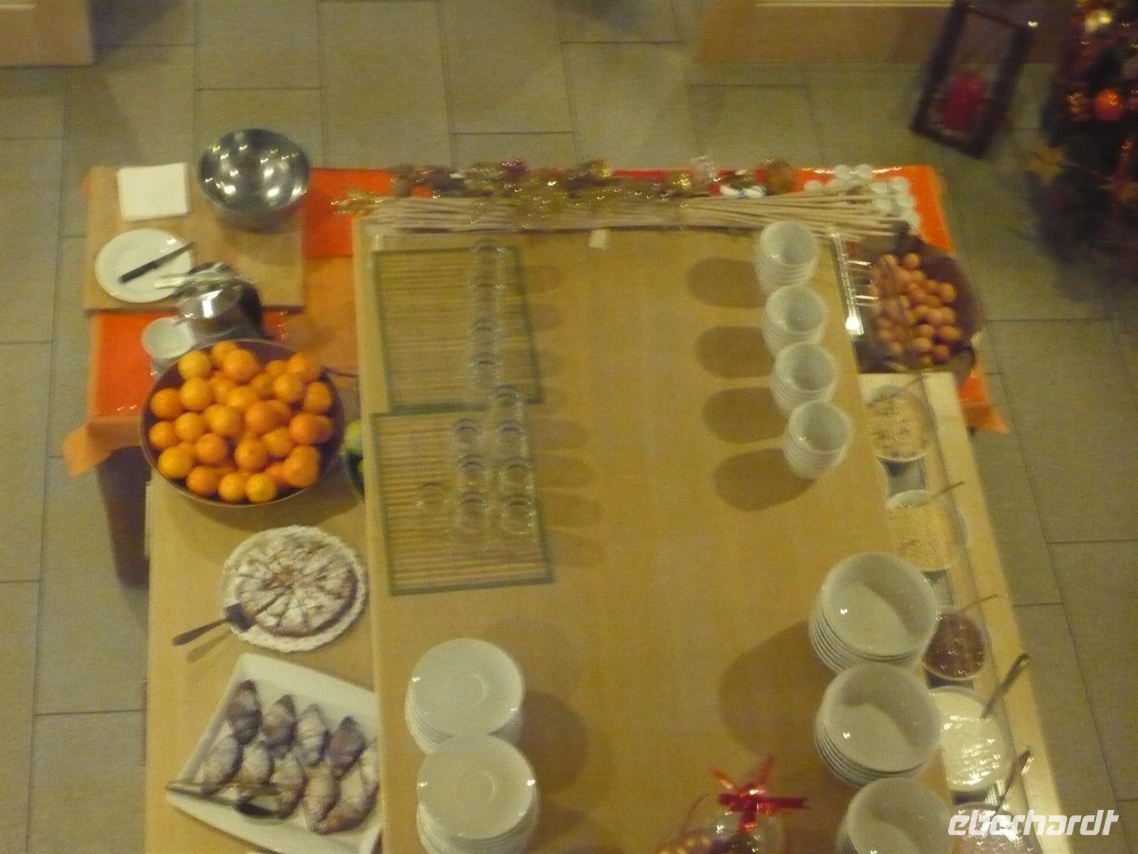 Am zweiten Tag erwartet uns die Stadt der Oper, der Romantik und der Scaliger - Verona. Frisch gepresster Orangensaft, knuspriges Brot, buntes Obst und Gemüse und einen guten italienischen Espresso, so kann der Tag beginnen. In Verona erwartete uns der humorvolle Stefano. Mit Kompetenz und seiner satirischen Art aus dem Leben des „Lieblings der Nation“, Berlusconi, zu erzählen eroberte er unser Herz. Der erste Halt war der Hügel, auf der die Santuario della Madonna di Lourdes über die Stadt blickt. Unser Stadtrundgang führte uns zu den Scaligergräbern, die uns von der Zeit, in der die adlige Familie die Region beherrschte, erzählt. Weiter ging es zum Haus von Julia, hier spielte sich die bekannteste Liebesgeschichte der Literaturgeschichte ab. Aber leider auch nur im Buch, denn der Balkon von Julia ist nicht aus der Zeit Romeo und Julias, er wurde nachträglich aus einer alten Gruft angefertigt und angebracht. Letztendlich sind wir an der großen Arena di Verona angelangt. Das gut erhaltene römische Amphitheater wurde schon von Goethe gelobt. Mit einigen Gästen wollten wir die Krippenausstellung im Inneren der Arena besichtigen, doch leider blieb es dunkel in der Arena. So machten wir uns auf einen leckeren vino brúlé auf dem Weihnachtsmarkt zu genießen. Auf dem Rückweg erhielten wir noch eine kleine Überraschung. Obwohl wir uns schweren Herzens damit abgefunden haben, die Krippenausstellung nicht besuchen zu können, fragte ich erneut ob die Elektronik wieder funktioniert. Und siehe da - 100erte von Krippen aus der ganzen Welt strahlten in den alten Gemäuern der Arena. So schnell verstrich die Zeit in Verona, mit einem weinenden aber auch einem lachenden Auge verließen wir die Stadt. Es wartete ja im Hotel die Bescherung auf uns. Nach kurzer Freizeit haben wir uns zu einem besinnlichen und familiären Abend in der Hotellobby getroffen. Ein leckeres Schlückchen Prosecco und kleine Snacks eröffneten den Abend. Unterm bunt geschmückten Weihnachtsbaum lagen viele liebevoll verpackte Päckchen, aber die gab es nicht einfach so! Nach der biblischen Weihnachtsgeschichte, sangen wir traditionelle Lieder und erzählten über italienische und andere Weihnachtsbräuche. Dann war es soweit, im Namen von Eberhardt TRAVEL überreichte ich handgeschnitzte Volkskunst aus der Spielzeugstadt Seiffen. Im Restaurant wurde bereits das Vorspeisenbuffet aufgetischt. Das typischen Abendessen als Mehrgangmenü wurde von einem Livemusiker begleitet. Dieser spielte anschließend noch ein paar Stunden in der Hotelbar, wo wir den Abend bei guten Getränken und kleinen Tanzeinlagen unserer Gäste ausklingen ließen.