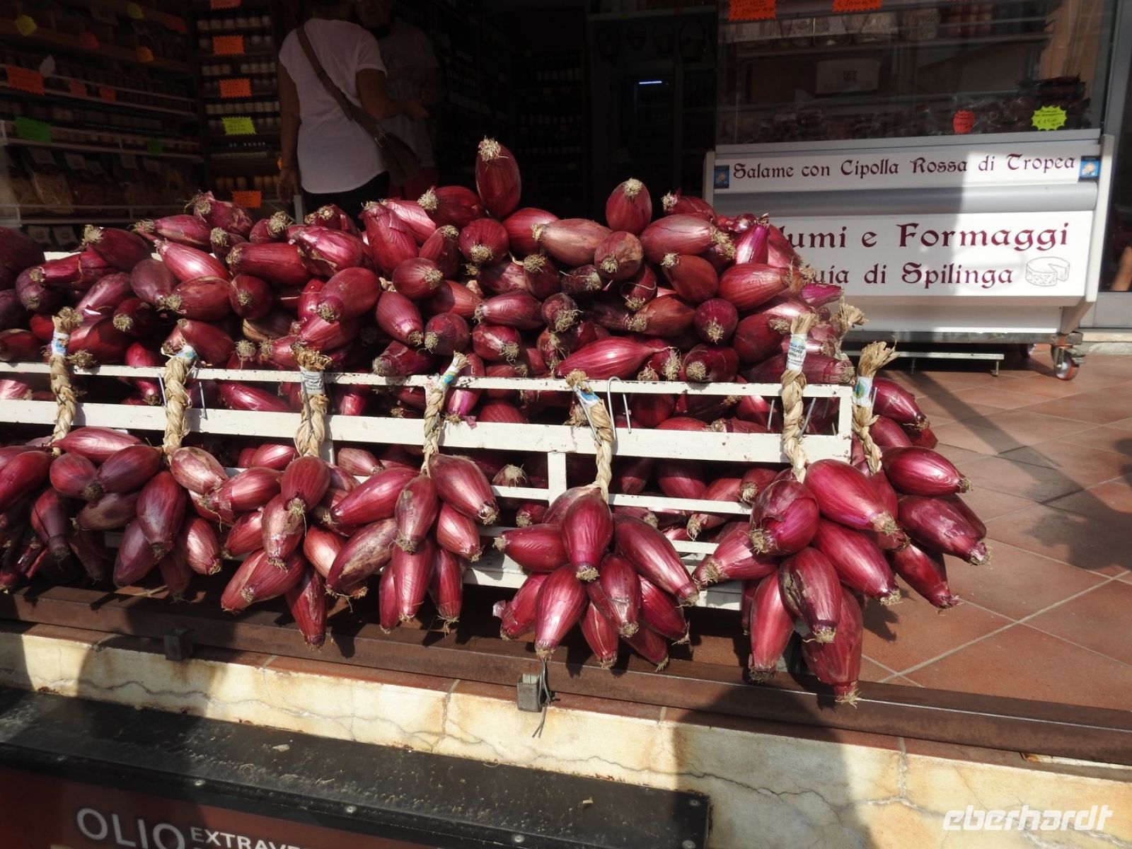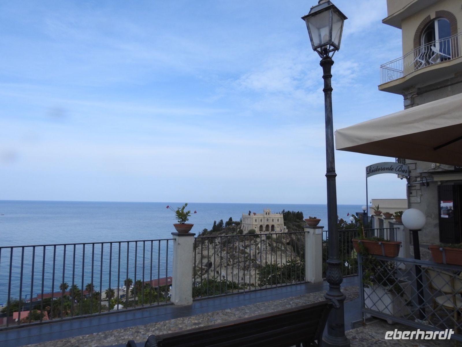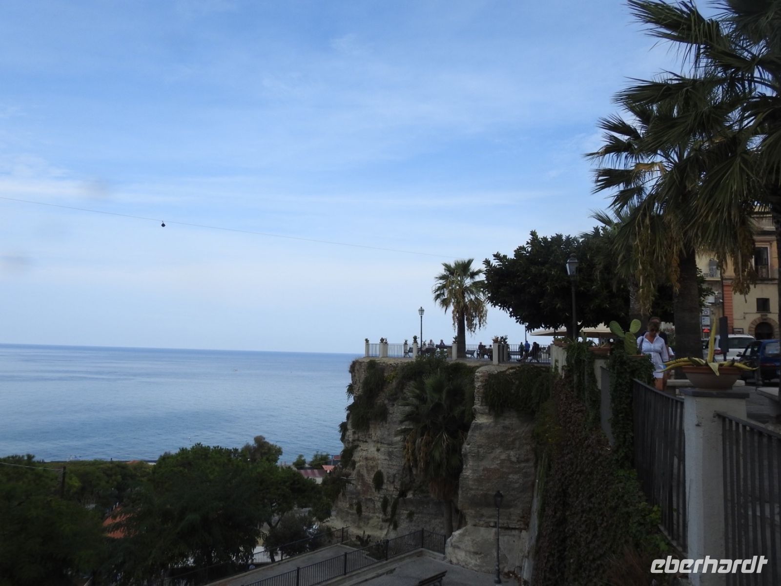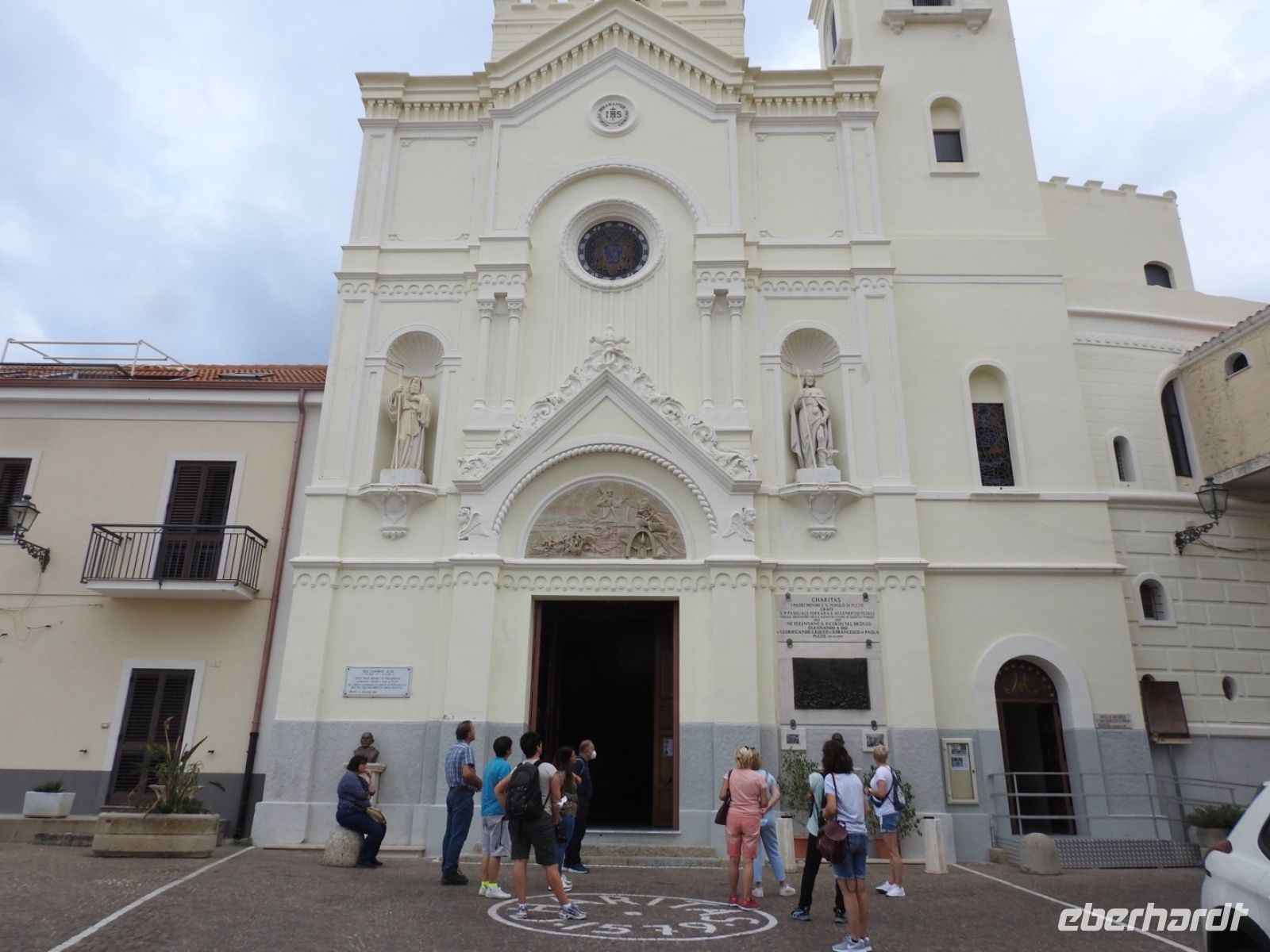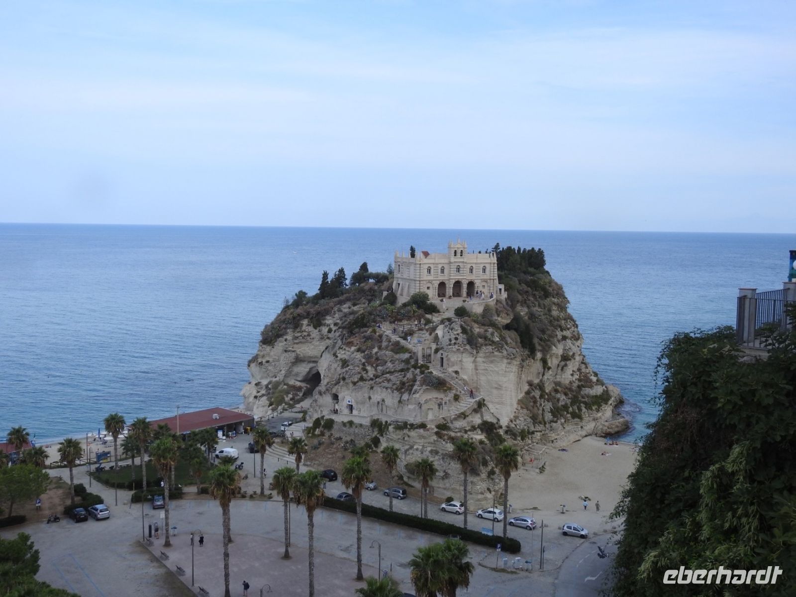 Nachdem geklärt ist, wohin uns der Shuttlebus bringen muss, lernen wir unsere örtliche Reiseleiterin Nadia und unseren Busfahrer kennen. Nadia erklärt uns anschaulich an einem Souvenirhandtuch wo wir uns befinden, dann versuchen wir einen Blick auf Sizilien zu erhaschen. Aber es ist zu dunstig. Die Küste der Götter zeigt sich uns nicht von ihrer strahlenden Seite. Am Capo Vaticano ist die Aussicht auf das türkisblaue Meer schon besser. Früher gab es hier ein Orakel, das von vielen Seefahrern besucht wurde. Daher stammt der Name: Kap der Prophezeiung. In Tropea kommen wir gleich an einem Laden vorbei, der die hier begehrte Ware, süße rote Zwiebeln, anbietet. Doch zunächst schauen wir nur. Ein Spaziergang führt uns zu den verschiedenen Balkonen, die die Stadt so spektakulär machen. Überall haben wir eine prächtige Aussicht auf das Meer und den weißen Sandstrand. Am schönsten ist der Blick auf die Wallfahrtskirche Santa Maria dell‘ Isola, die sich in strahlendem Weiß auf einem Sandsteinfelsen präsentiert. Unser Weg führt uns vorbei an ehemaligen Adelspalästen aus dem 15. Jahrhundert, manche sind noch bewohnt. Es gelingt uns, einen Blick in einen Innenhof zu werfen und das Adelswappen an der Decke zu bewundern. Gern hätten wir auch die Kathedrale besucht, jedoch bleibt dieser Besuch uns verwehrt, da gerade Gottesdienst stattfindet und Touristen nicht erwünscht sind. Nur klammheimlich können wir einen Blick auf die Bomben werfen, die am Eingang der Kathedrale befestigt sind. Grund ist, dass im 2. Weltkrieg sieben Bomben auf Tropea abgeworfen wurden, jedoch keine explodierte. Als Erinnerung daran, wurden zwei der Bomben in der Kathedrale angebracht. Wir haben nun eine Stunde Zeit, auf eigene Faust die Stadt zu erobern. Die verbringen wir mit Kaffee trinken und/oder einkaufen. Vor allem die verschiedenen Spaghettigewürze und die Njudawurst haben es uns angetan. Aber auch die italienischen Schuhläden und Bekleidungsgeschäfte laden zum Shoppen ein. Nach der Pause besuchen wir einen Laden, wo uns verschiedene Aufstriche, Wurst und Käse zum verkosten angeboten werden. Wir fahren weiter nach Pizzo, ein freundliches Städtchen, das auf einem Felsplateau hoch über dem Golf von Sant Eufemia thront. Wir besuchen das Castello, in dem der Schwager von Napoleon eingesperrt, zum Tode verurteilt und umgebracht wurde. Auf der Piazza della Repubblica kehren wir ein und Eberhardt Travel lädt uns auf einen Tartuffo ein. Das ist die Spezialität der Stadt - ein Eis mit flüssigem Schokoladenkern. Bei einer Präsentation können wir zusehen, wie die flüssige Schokolade in die Eiskugel kommt. Nach dieser Leckerei fahren wir zu einem Strand, an dem sich eine besonders sehenswerte Felsenkirche befindet. Ende des 18. Jahrhunderts gerieten neapolitanische Seeleute in Not. Nach ihrer glücklichen Rettung, errichteten sie diese Kirche. Zweihundert Jahre später entdeckte ein lokaler Künstler die Kirche für sich und schmückte sie mit Dutzenden Heiligenfiguren, die er mit einer Spitzhacke aus dem Sandstein schlug. So entstand ein wunderschönes Figurenensemble ganz versteckt in einer Grotte am Strand.