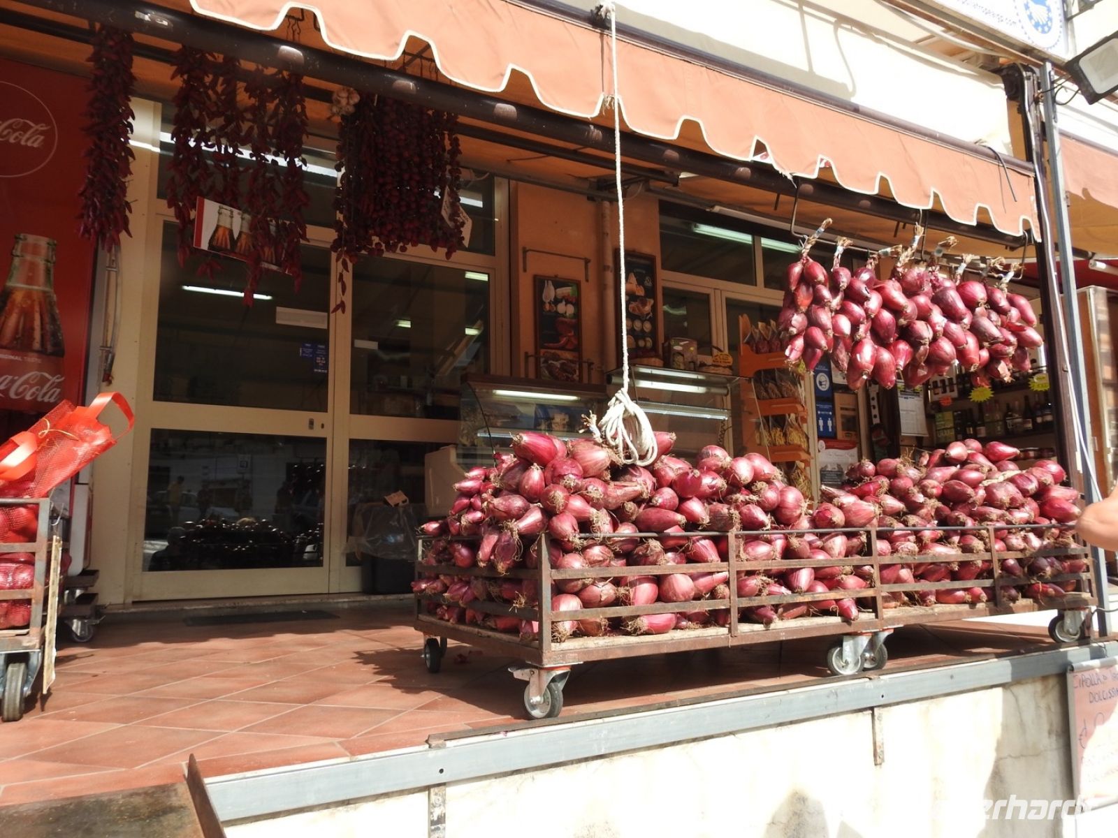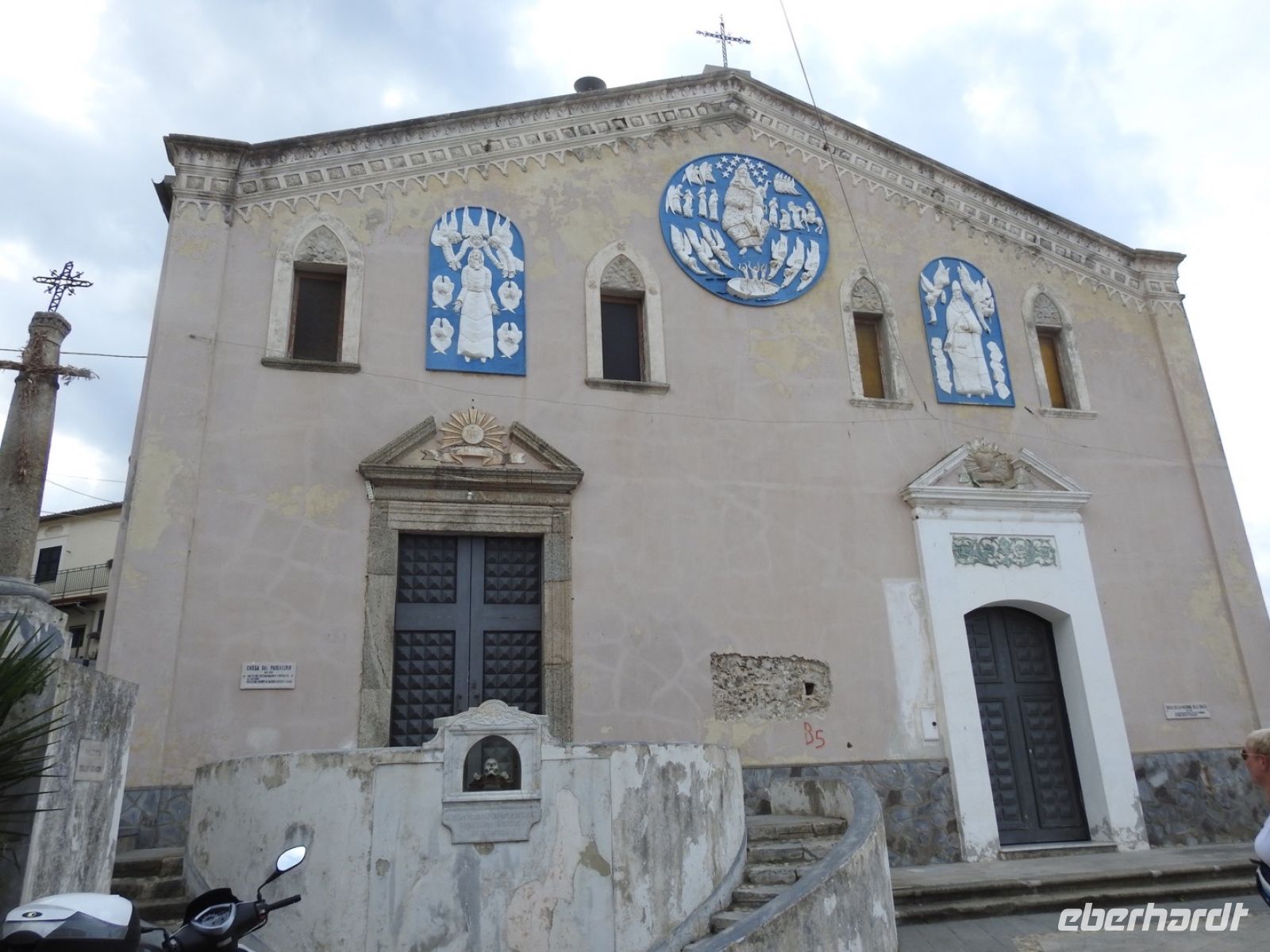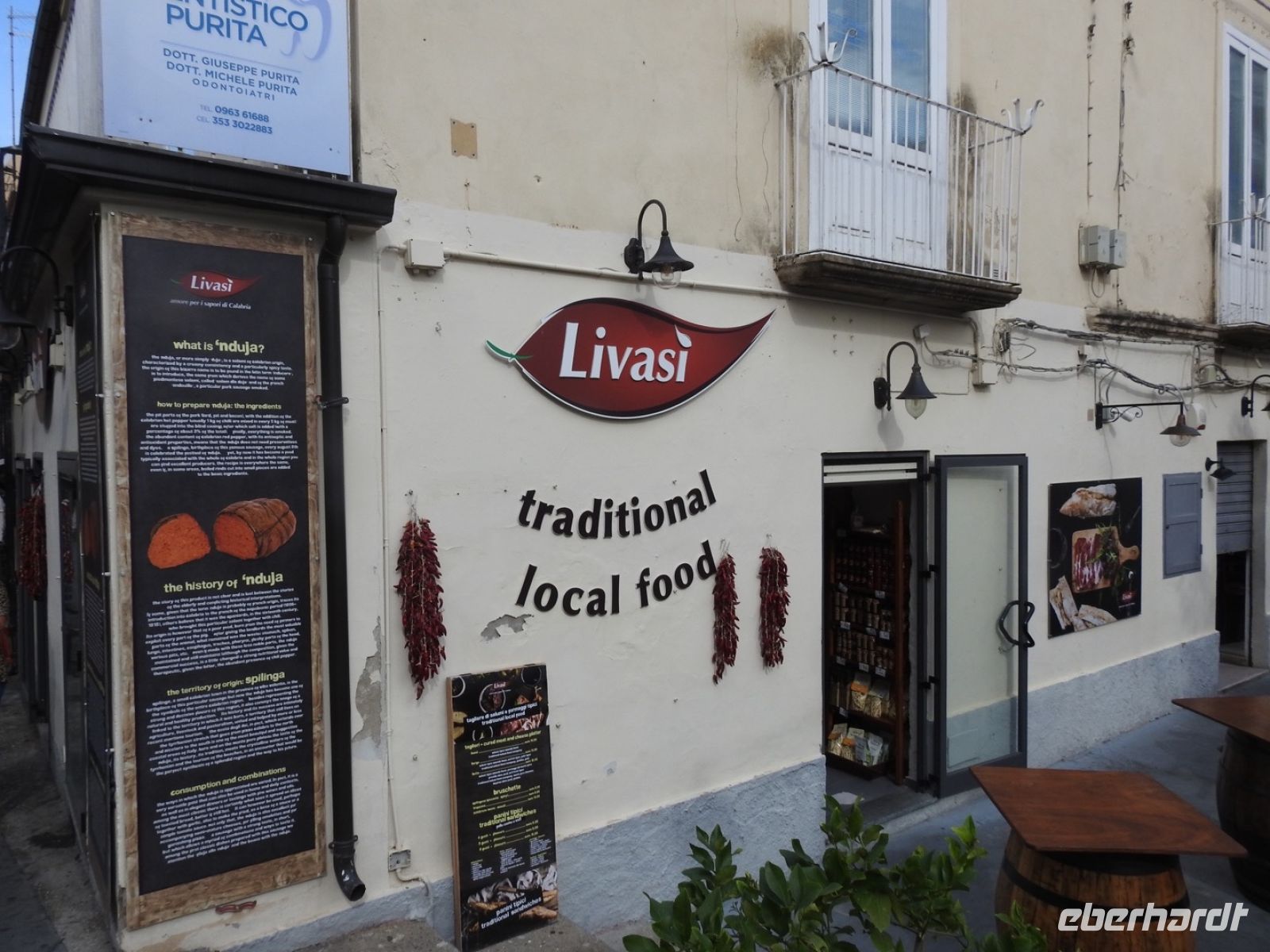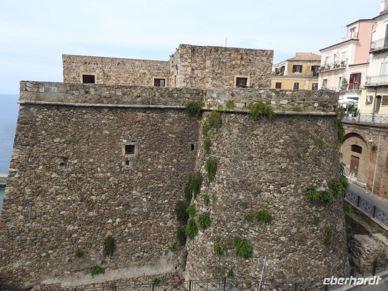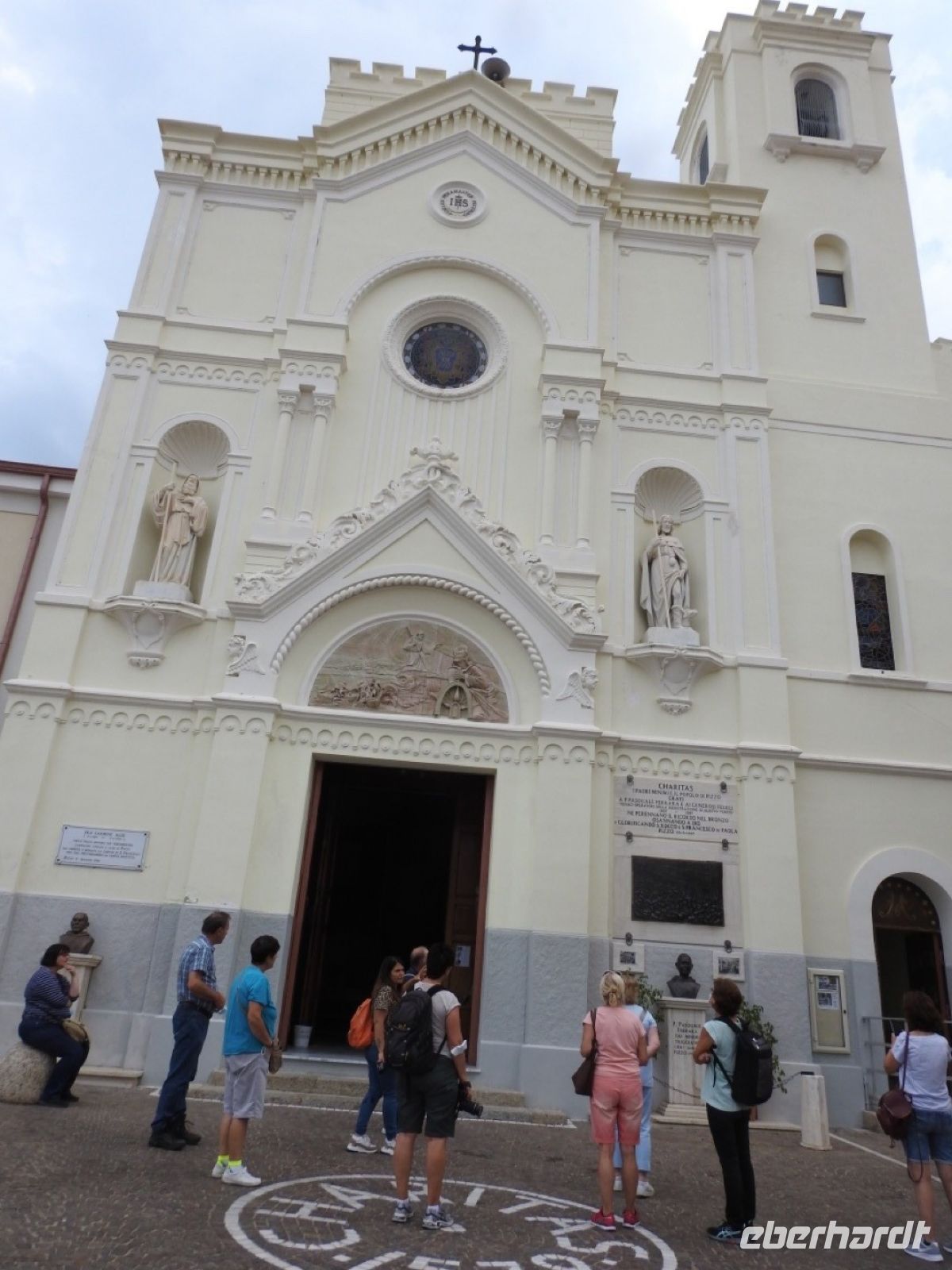 Nachdem geklärt ist, wohin uns der Shuttlebus bringen muss, lernen wir unsere örtliche Reiseleiterin Nadia und unseren Busfahrer kennen. Nadia erklärt uns anschaulich an einem Souvenirhandtuch wo wir uns befinden, dann versuchen wir einen Blick auf Sizilien zu erhaschen. Aber es ist zu dunstig. Die Küste der Götter zeigt sich uns nicht von ihrer strahlenden Seite. Am Capo Vaticano ist die Aussicht auf das türkisblaue Meer schon besser. Früher gab es hier ein Orakel, das von vielen Seefahrern besucht wurde. Daher stammt der Name: Kap der Prophezeiung. In Tropea kommen wir gleich an einem Laden vorbei, der die hier begehrte Ware, süße rote Zwiebeln, anbietet. Doch zunächst schauen wir nur. Ein Spaziergang führt uns zu den verschiedenen Balkonen, die die Stadt so spektakulär machen. Überall haben wir eine prächtige Aussicht auf das Meer und den weißen Sandstrand. Am schönsten ist der Blick auf die Wallfahrtskirche Santa Maria dell‘ Isola, die sich in strahlendem Weiß auf einem Sandsteinfelsen präsentiert. Unser Weg führt uns vorbei an ehemaligen Adelspalästen aus dem 15. Jahrhundert, manche sind noch bewohnt. Es gelingt uns, einen Blick in einen Innenhof zu werfen und das Adelswappen an der Decke zu bewundern. Gern hätten wir auch die Kathedrale besucht, jedoch bleibt dieser Besuch uns verwehrt, da gerade Gottesdienst stattfindet und Touristen nicht erwünscht sind. Nur klammheimlich können wir einen Blick auf die Bomben werfen, die am Eingang der Kathedrale befestigt sind. Grund ist, dass im 2. Weltkrieg sieben Bomben auf Tropea abgeworfen wurden, jedoch keine explodierte. Als Erinnerung daran, wurden zwei der Bomben in der Kathedrale angebracht. Wir haben nun eine Stunde Zeit, auf eigene Faust die Stadt zu erobern. Die verbringen wir mit Kaffee trinken und/oder einkaufen. Vor allem die verschiedenen Spaghettigewürze und die Njudawurst haben es uns angetan. Aber auch die italienischen Schuhläden und Bekleidungsgeschäfte laden zum Shoppen ein. Nach der Pause besuchen wir einen Laden, wo uns verschiedene Aufstriche, Wurst und Käse zum verkosten angeboten werden. Wir fahren weiter nach Pizzo, ein freundliches Städtchen, das auf einem Felsplateau hoch über dem Golf von Sant Eufemia thront. Wir besuchen das Castello, in dem der Schwager von Napoleon eingesperrt, zum Tode verurteilt und umgebracht wurde. Auf der Piazza della Repubblica kehren wir ein und Eberhardt Travel lädt uns auf einen Tartuffo ein. Das ist die Spezialität der Stadt - ein Eis mit flüssigem Schokoladenkern. Bei einer Präsentation können wir zusehen, wie die flüssige Schokolade in die Eiskugel kommt. Nach dieser Leckerei fahren wir zu einem Strand, an dem sich eine besonders sehenswerte Felsenkirche befindet. Ende des 18. Jahrhunderts gerieten neapolitanische Seeleute in Not. Nach ihrer glücklichen Rettung, errichteten sie diese Kirche. Zweihundert Jahre später entdeckte ein lokaler Künstler die Kirche für sich und schmückte sie mit Dutzenden Heiligenfiguren, die er mit einer Spitzhacke aus dem Sandstein schlug. So entstand ein wunderschönes Figurenensemble ganz versteckt in einer Grotte am Strand.